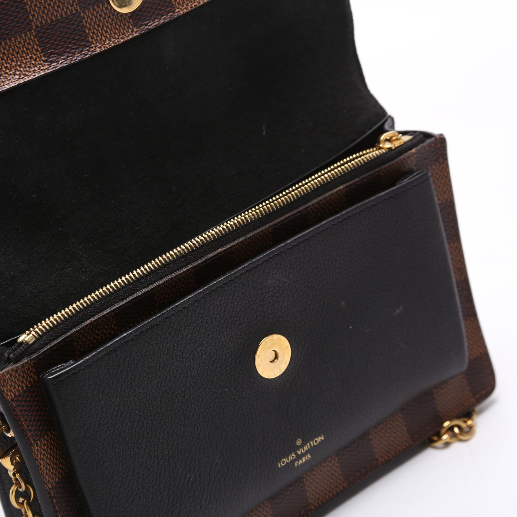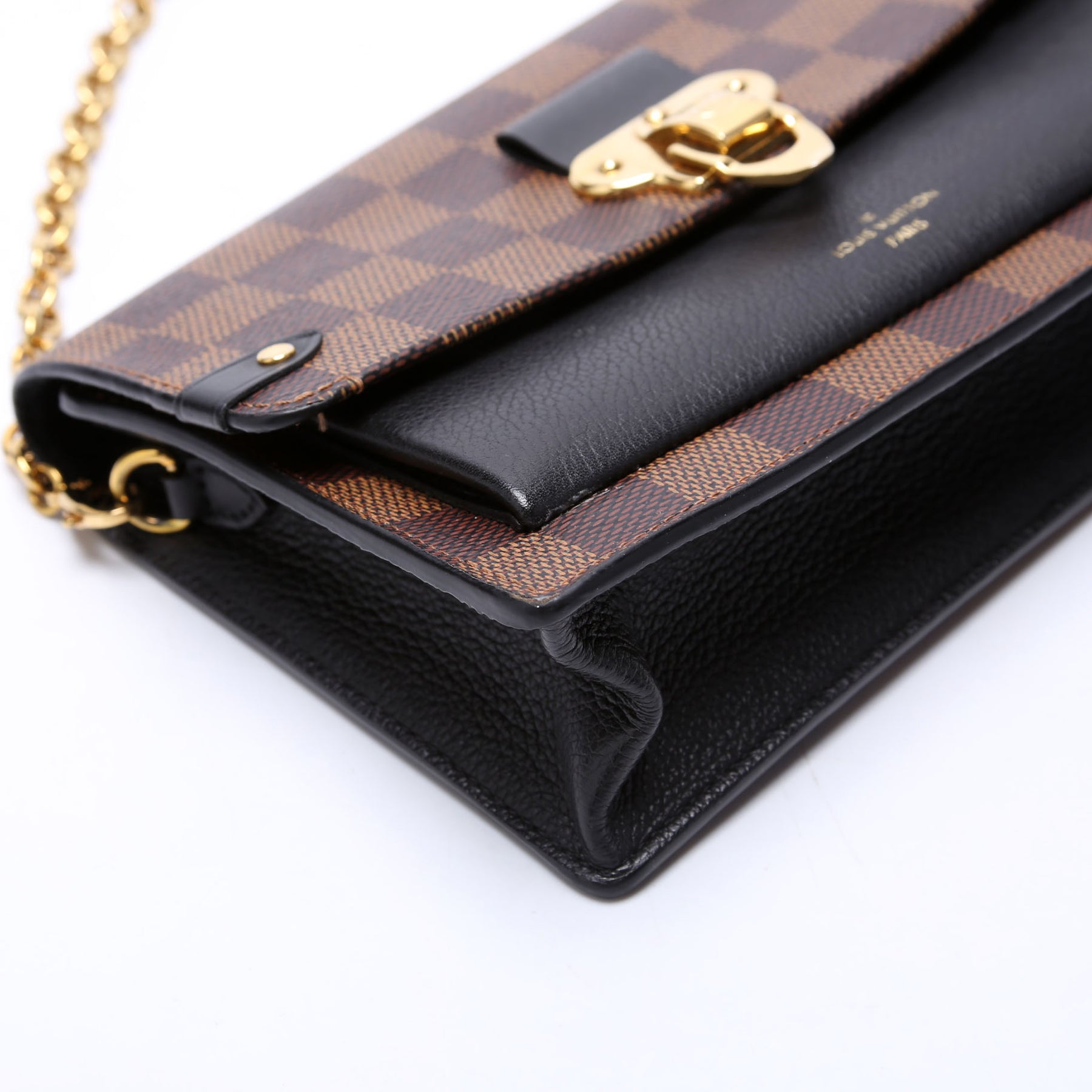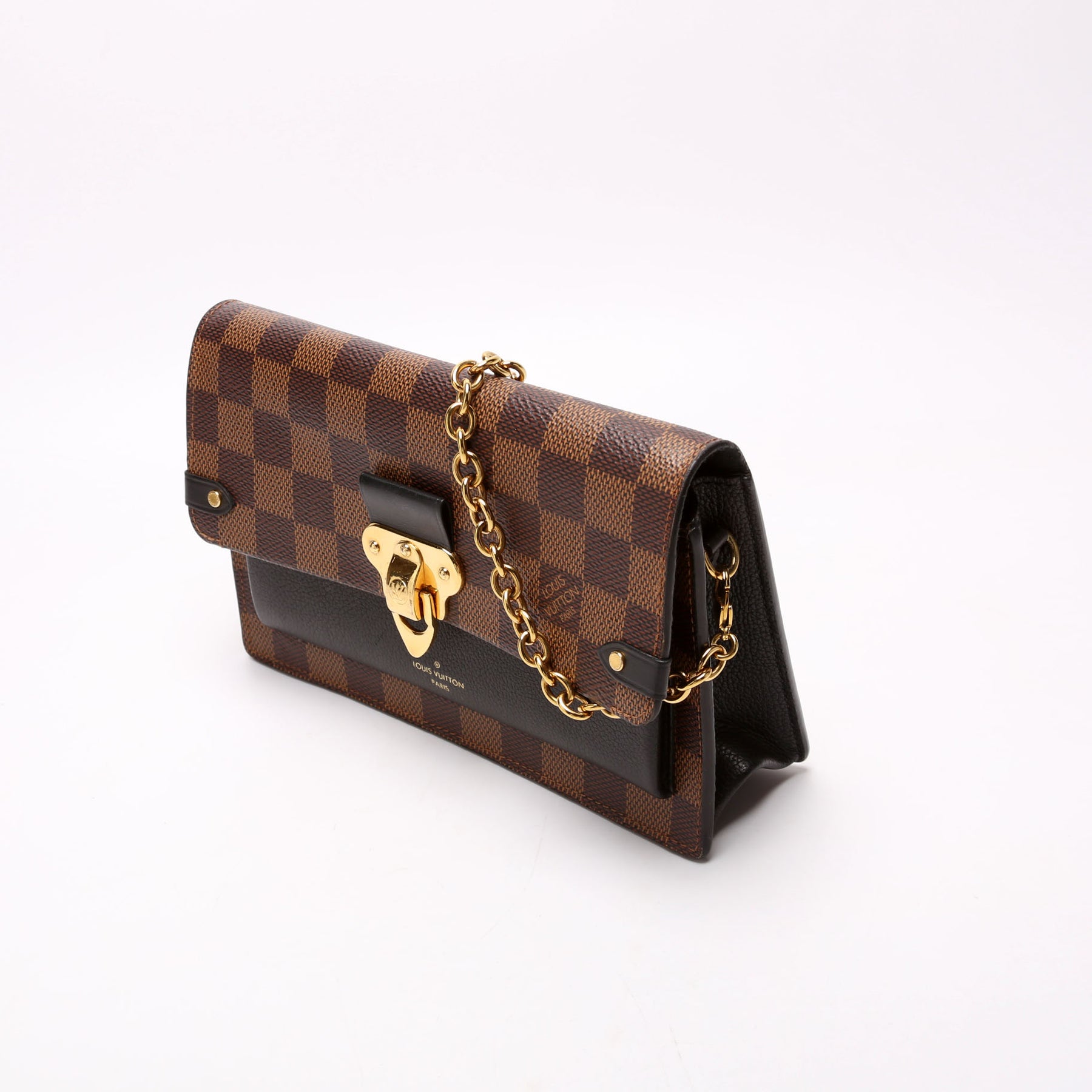 This pre-owned Louis Vuitton Vavin Chain Wallet is guaranteed 100% authentic. The exterior is in the classic Louis Vuitton Damier Ebene coated canvas.