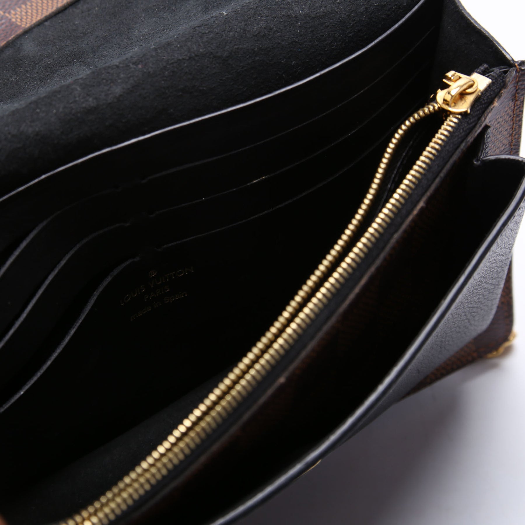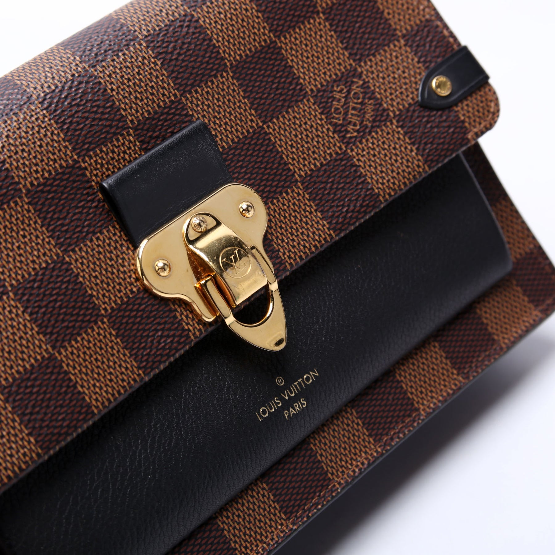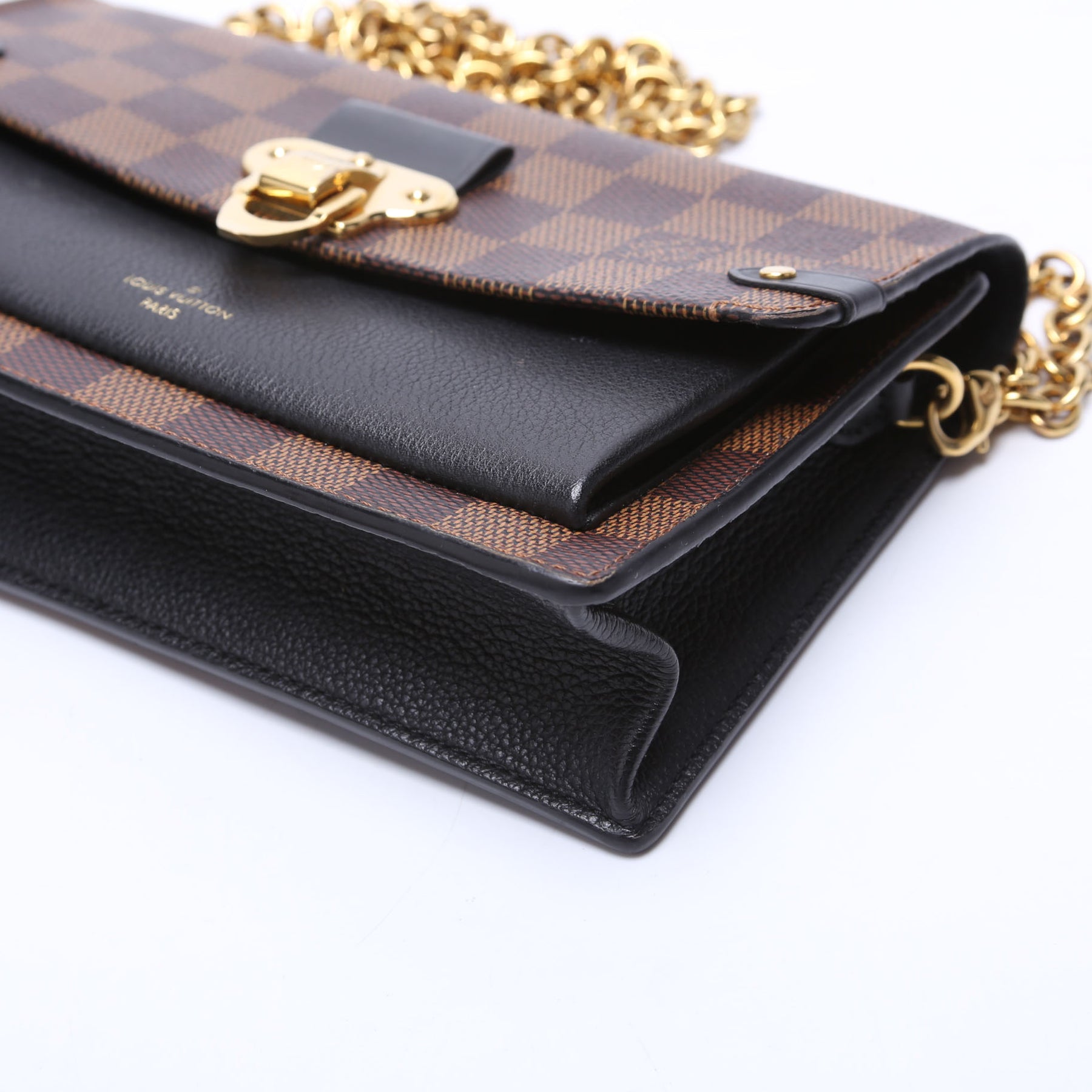 This pre-owned Louis Vuitton Vavin Chain Wallet is guaranteed 100% authentic. The exterior is in the classic Louis Vuitton Damier Ebene coated canvas.