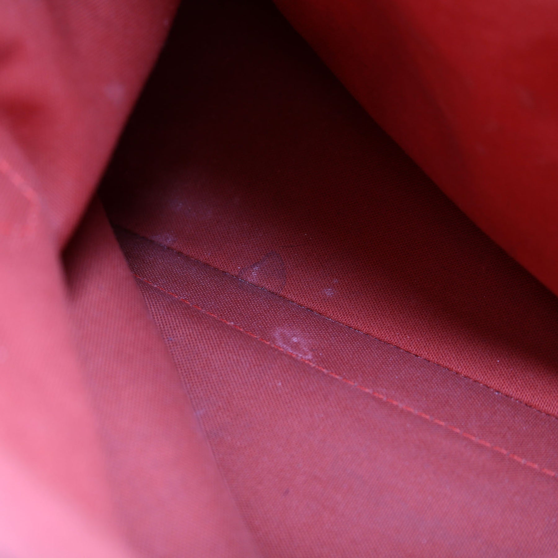 Interior: The interior shows heavy stains but is free of rips or tears. The interior features one zipper pocket.