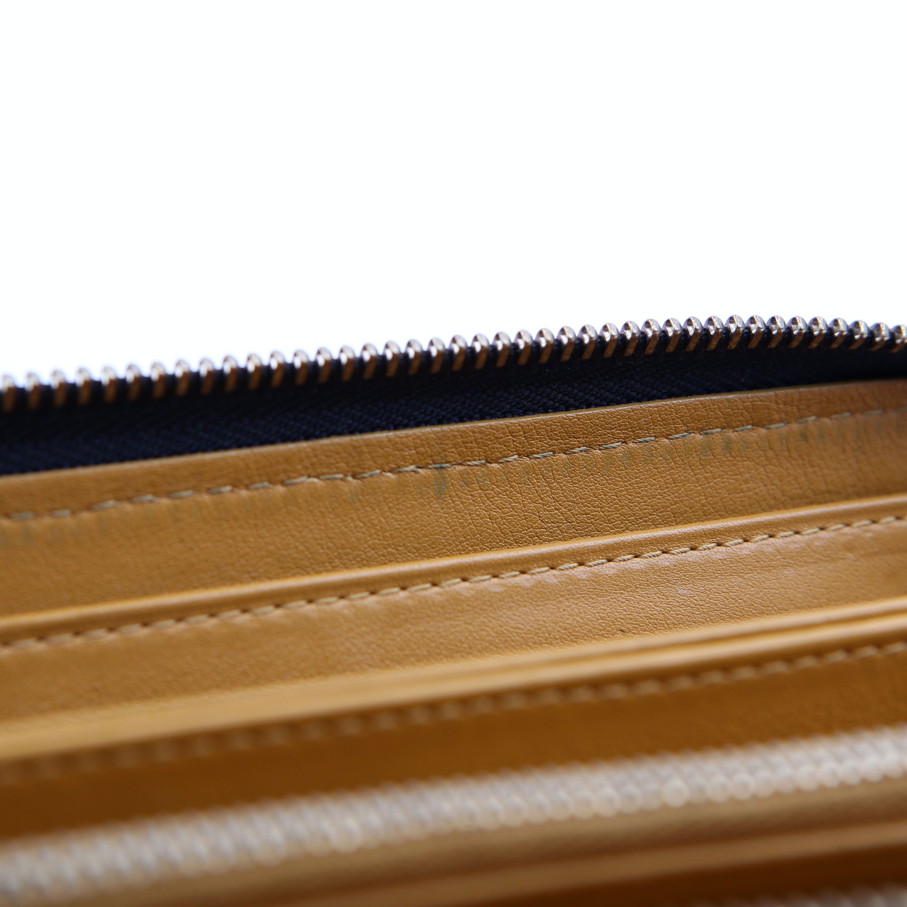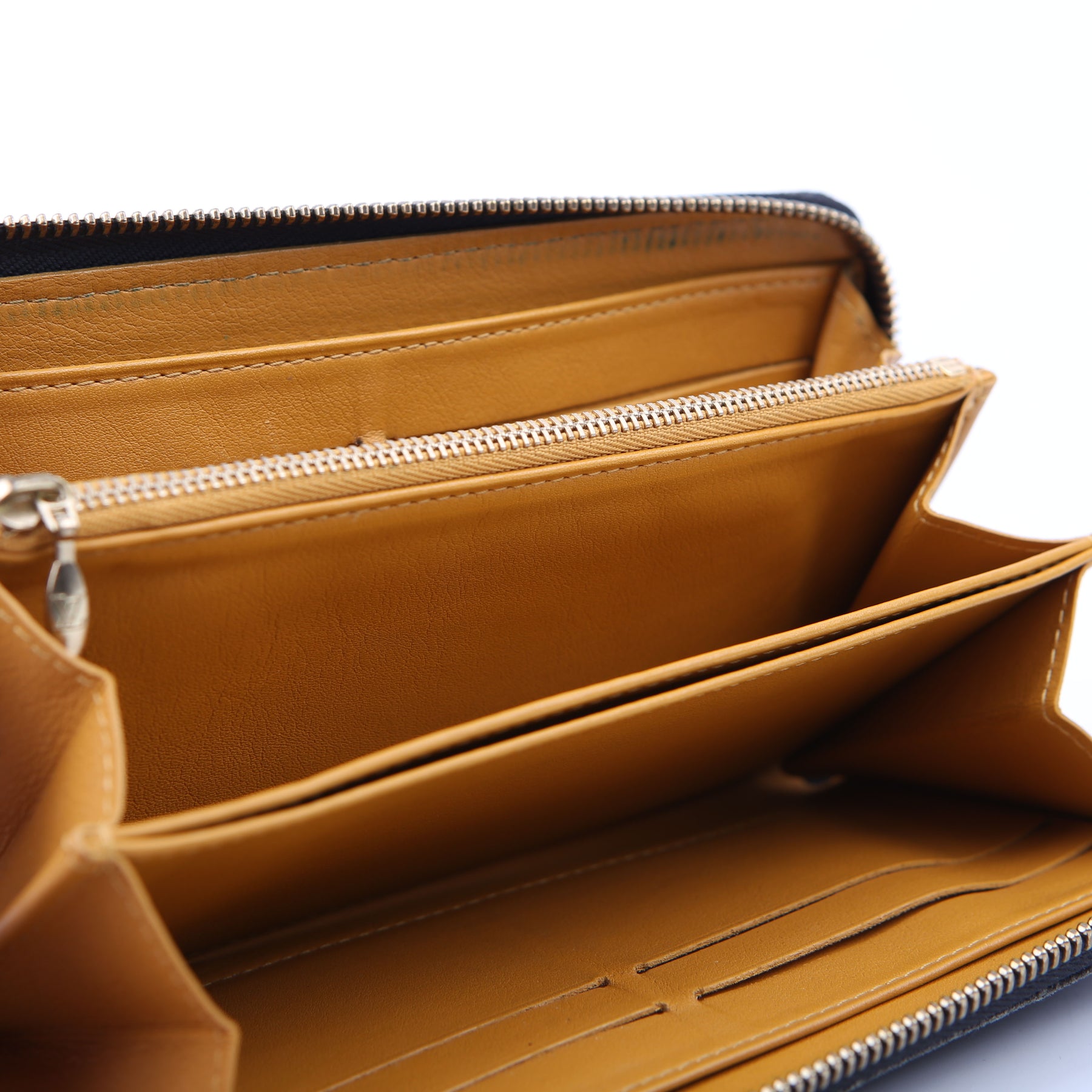 Interior: The interior leather has minor scuffs and wear. It features eight card slots, six bill slots, and one zip closure coin pouch.
