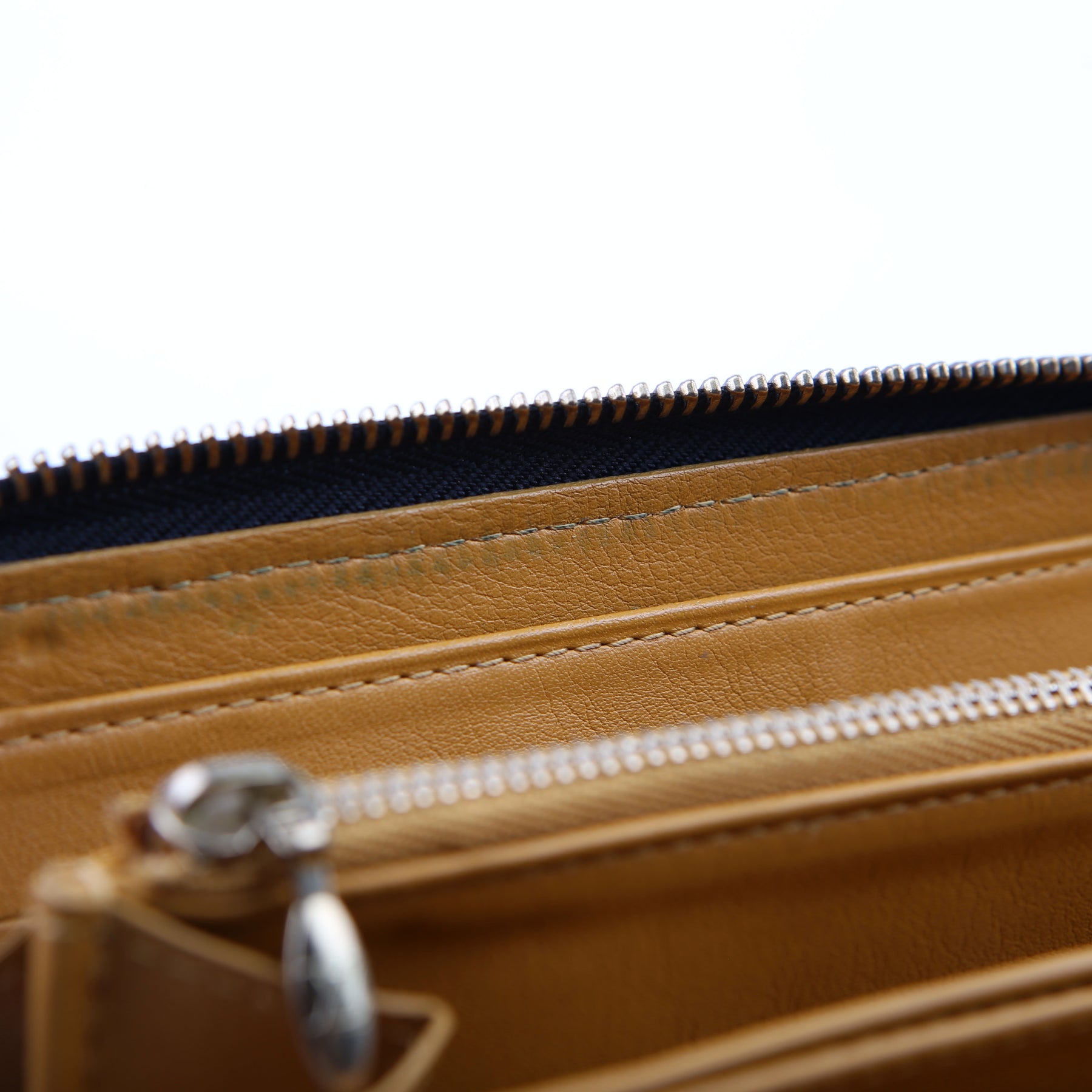 Hardware: The zipper operates properly and runs smoothly. The brass hardware has minor wear.