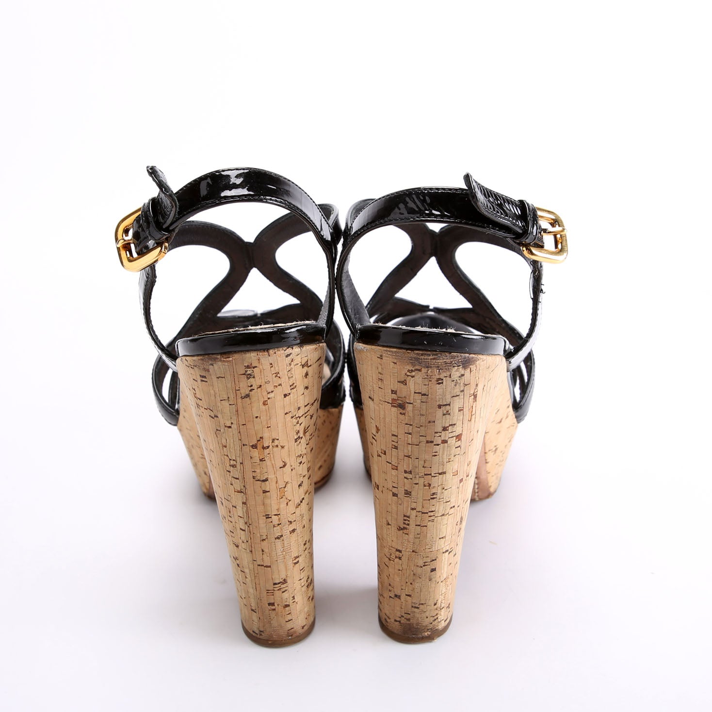 These pre-owned Prada Platform Cork Espadrille Patent Sandal Heels are guaranteed 100% authentic.
