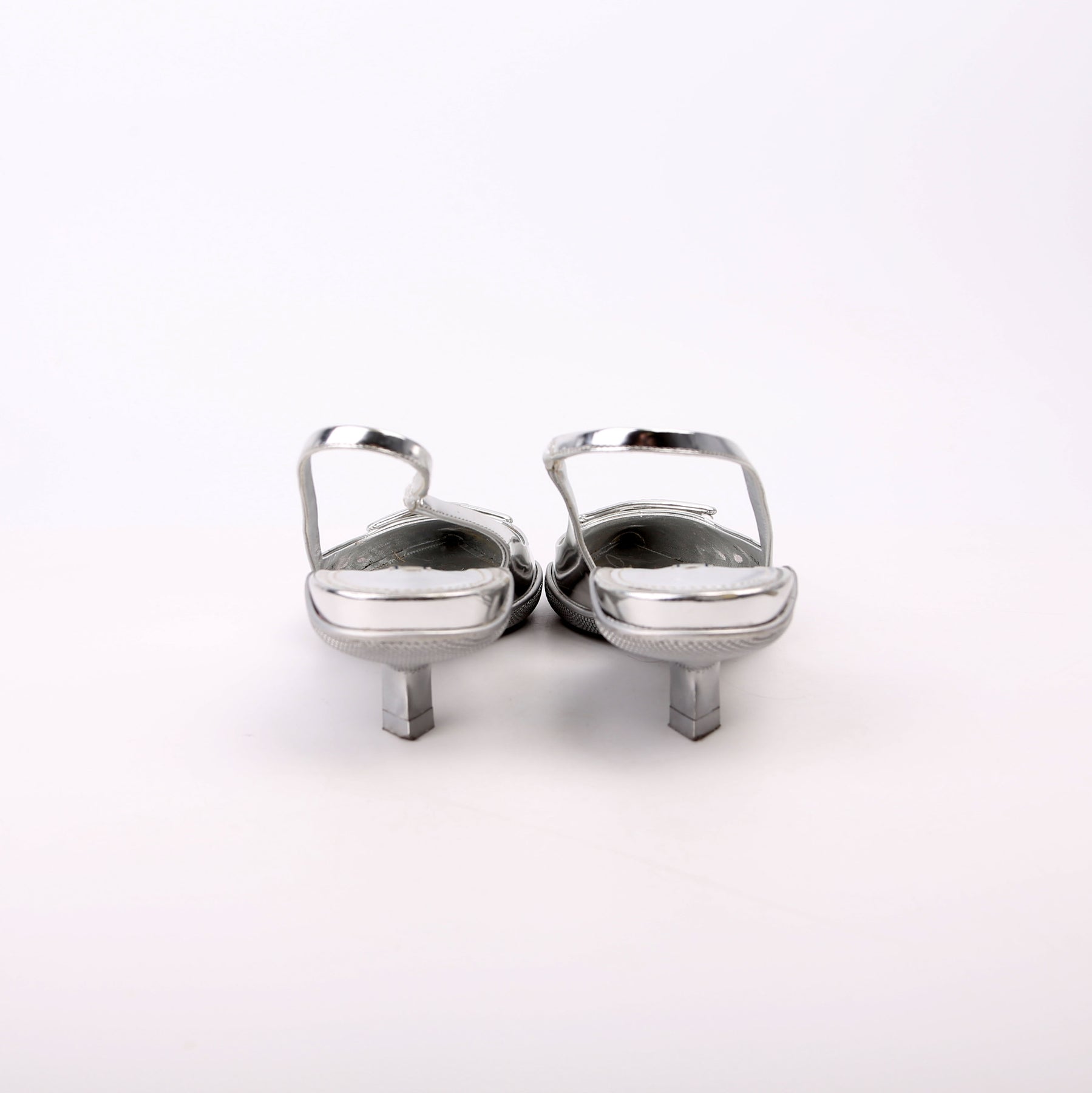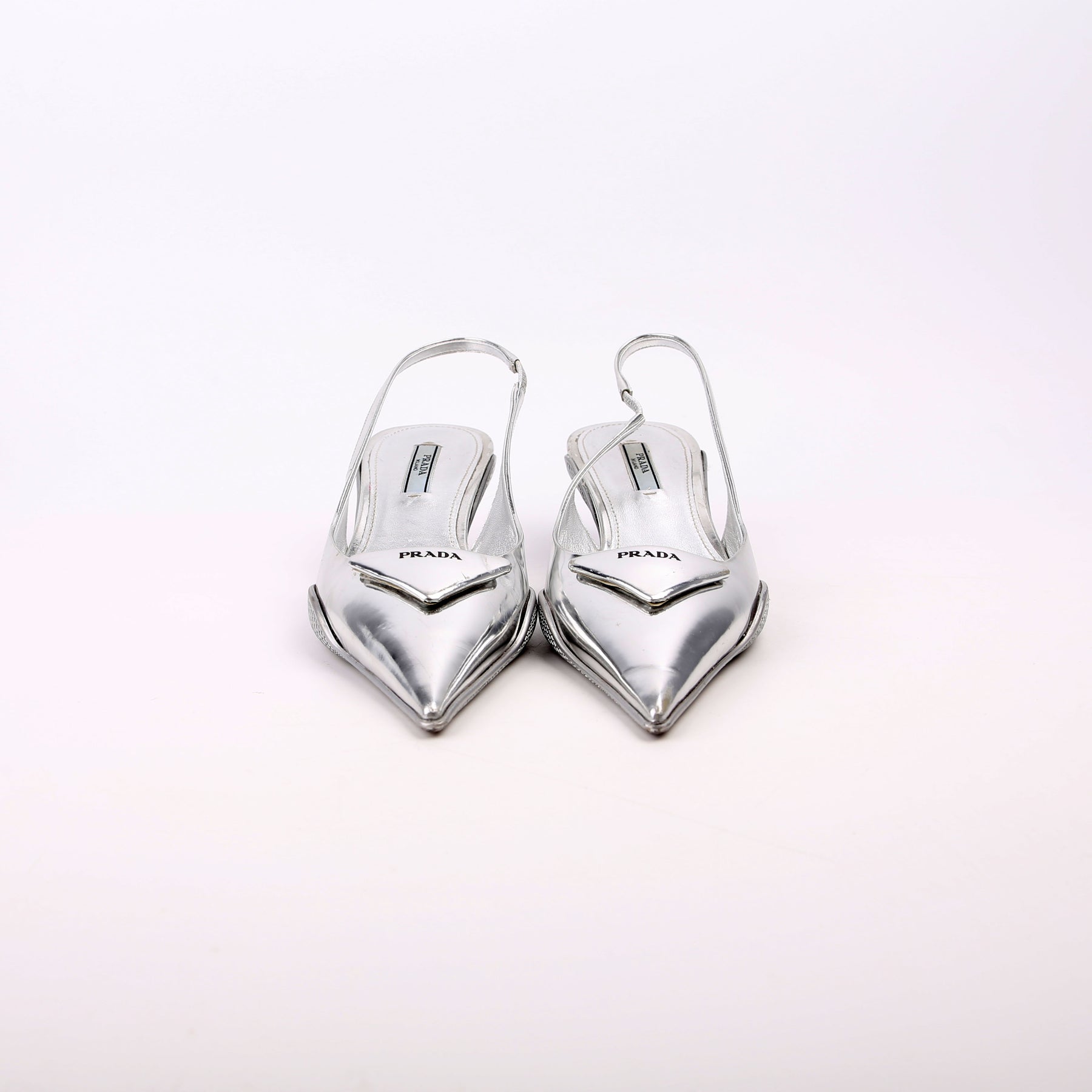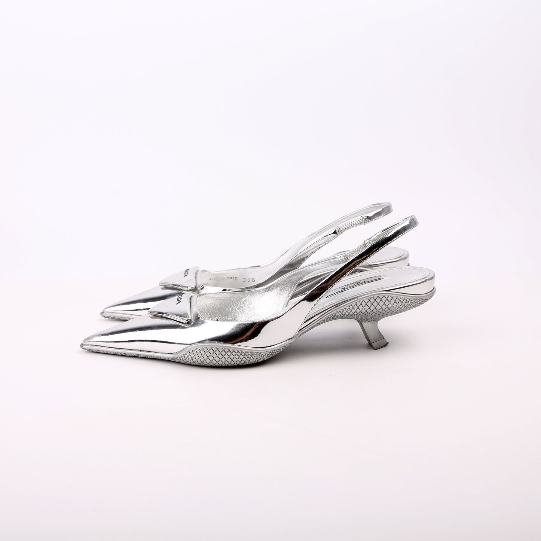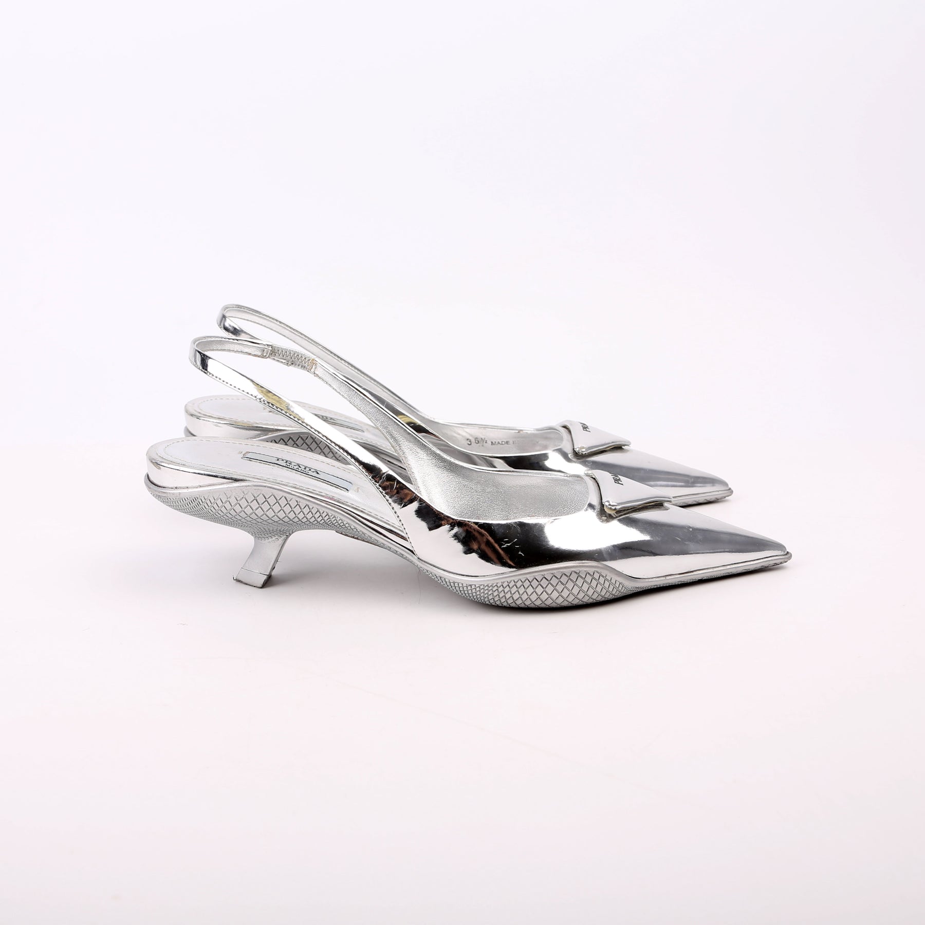 These pre-owned Prada Pointy Toe Slingback Metallic Pumps are guaranteed 100% authentic.