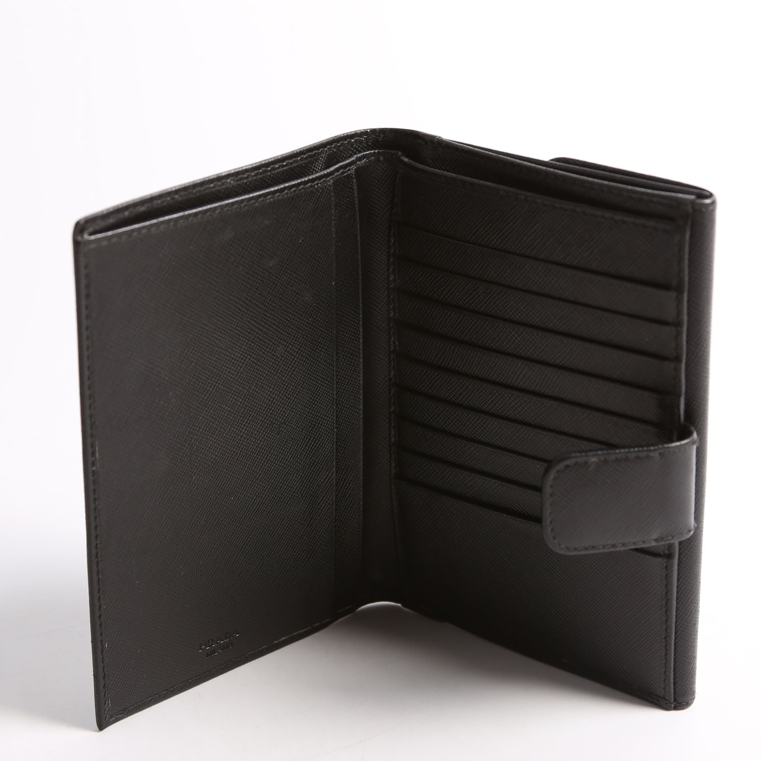 Interior: The interior is free from major signs of wear. The interior features nine card slots, four bill slots, and one snap closure coin pouch.