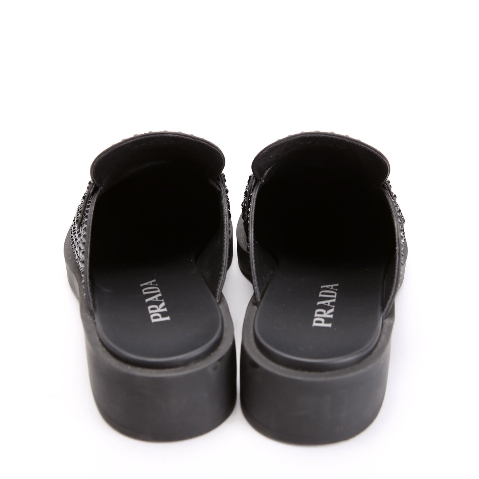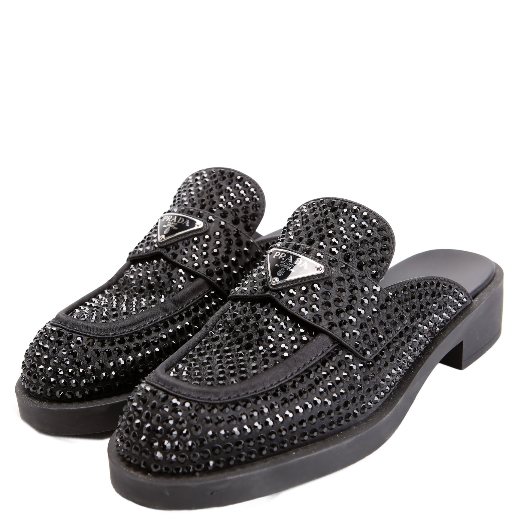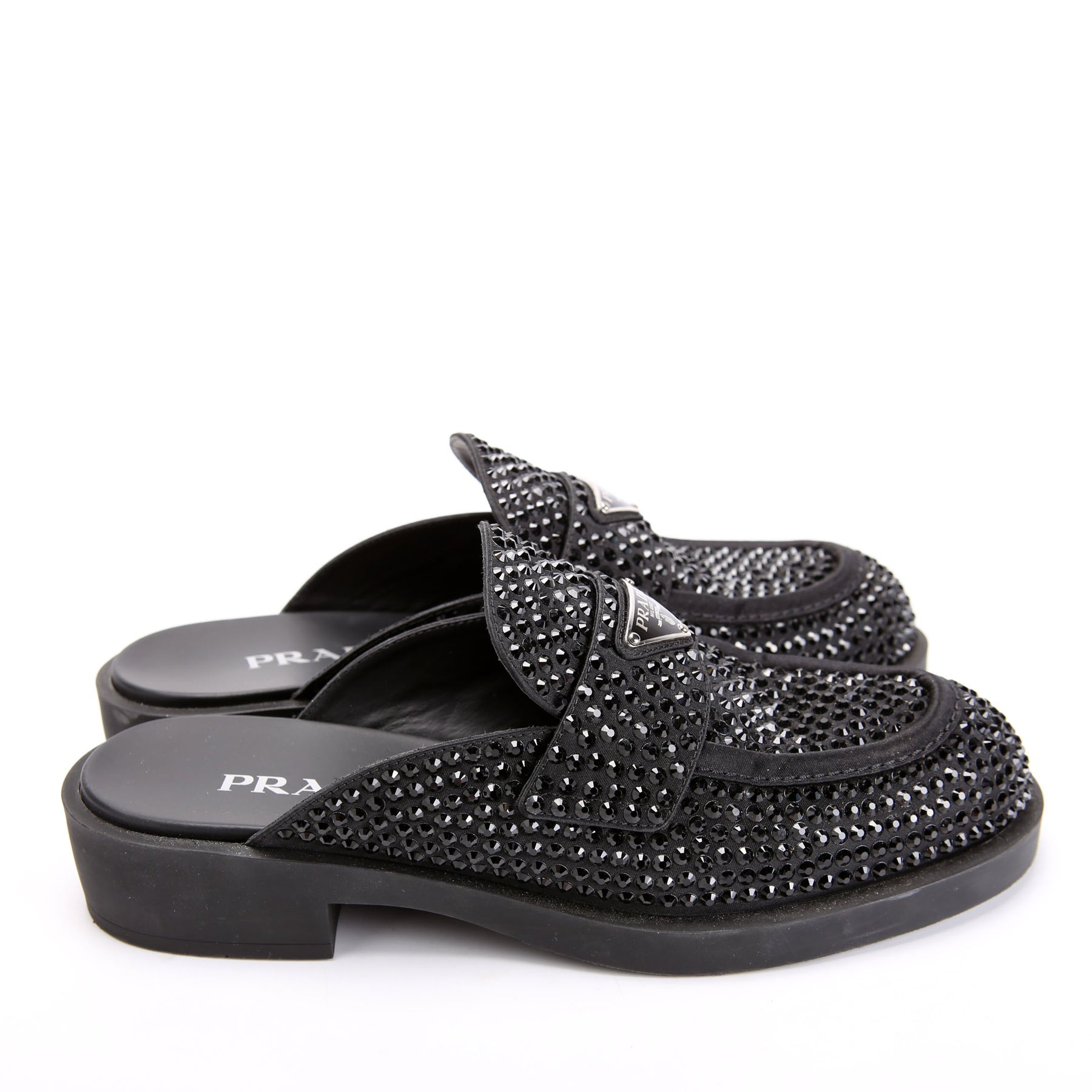 These pre-owned Prada Triangle Crystal Mules are guaranteed 100% authentic.