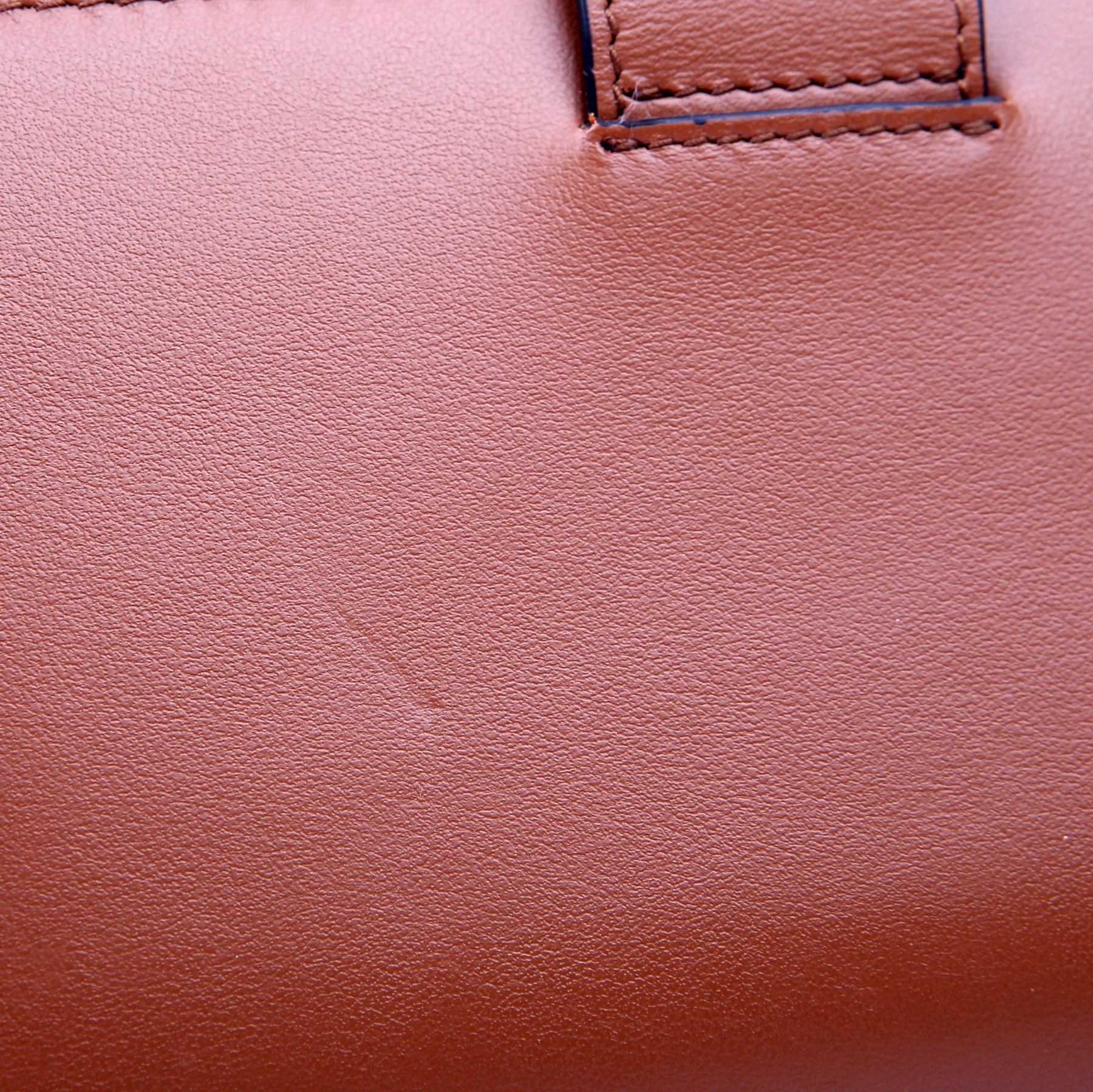 Exterior: The exterior leather has light scratches throughout. The corners show light wear.