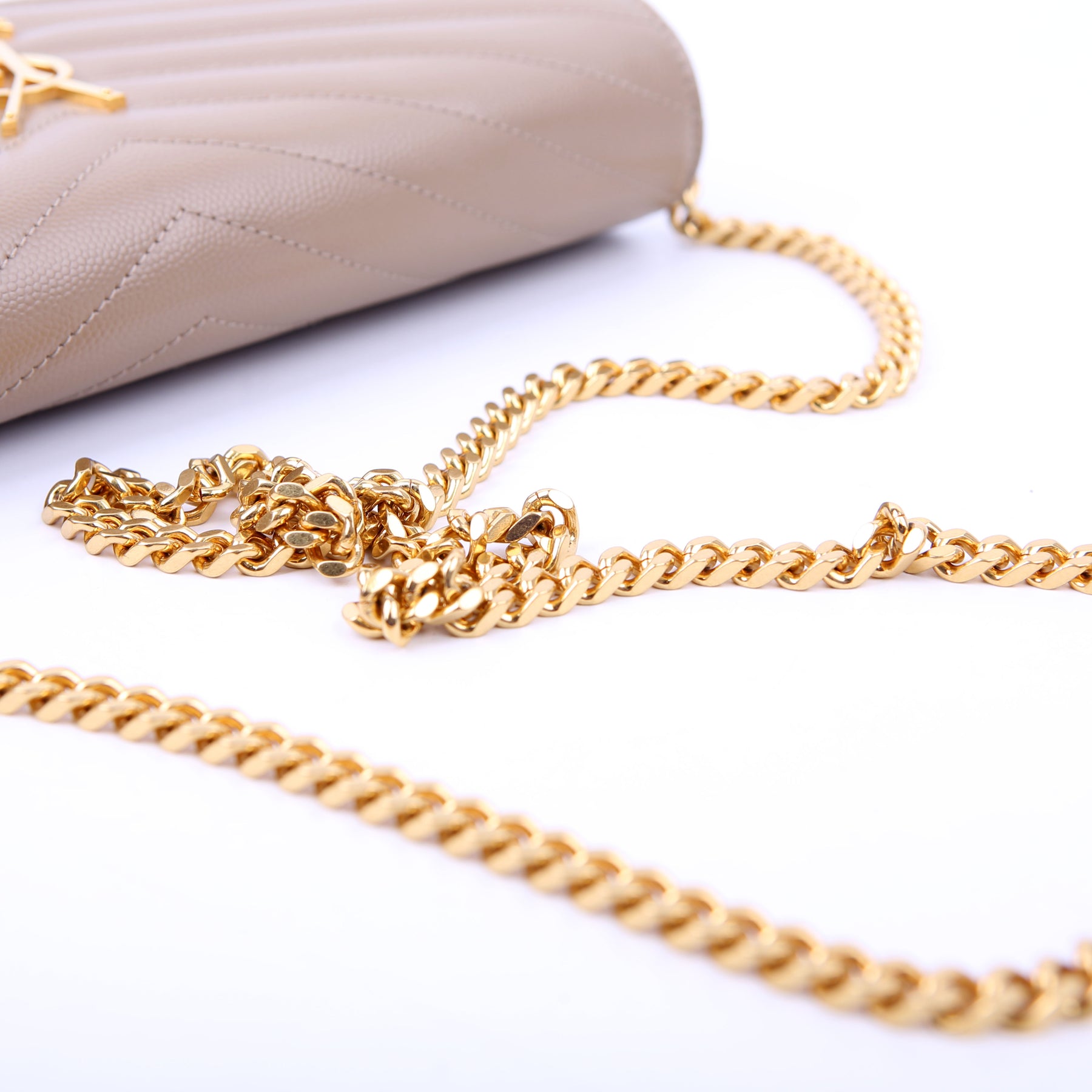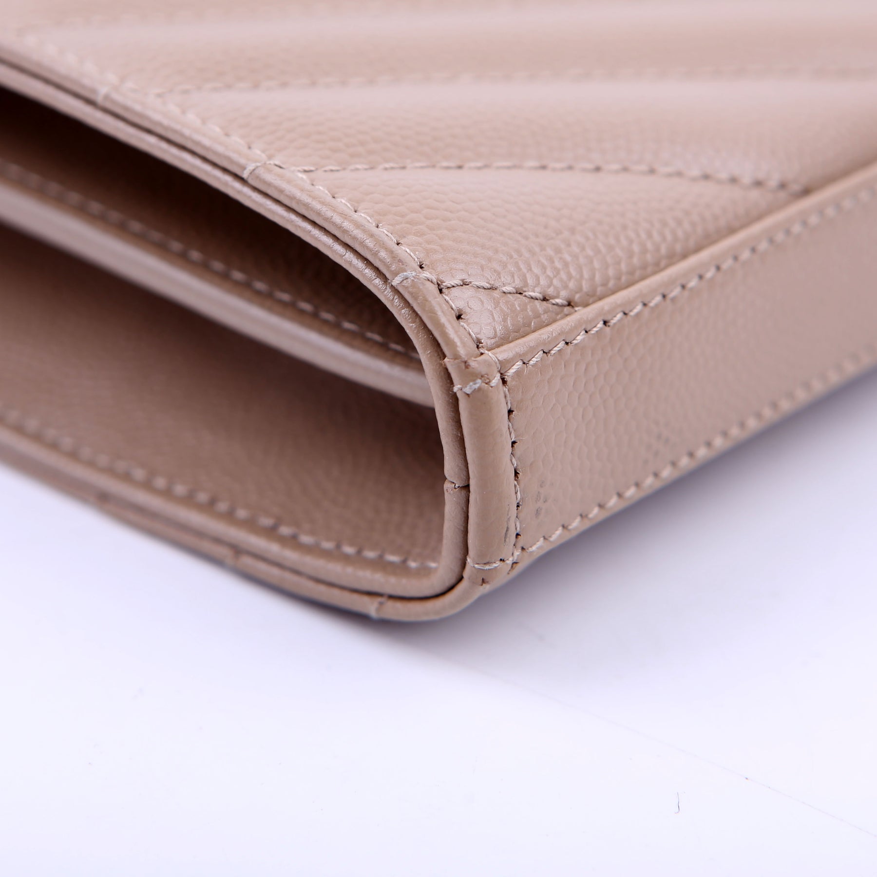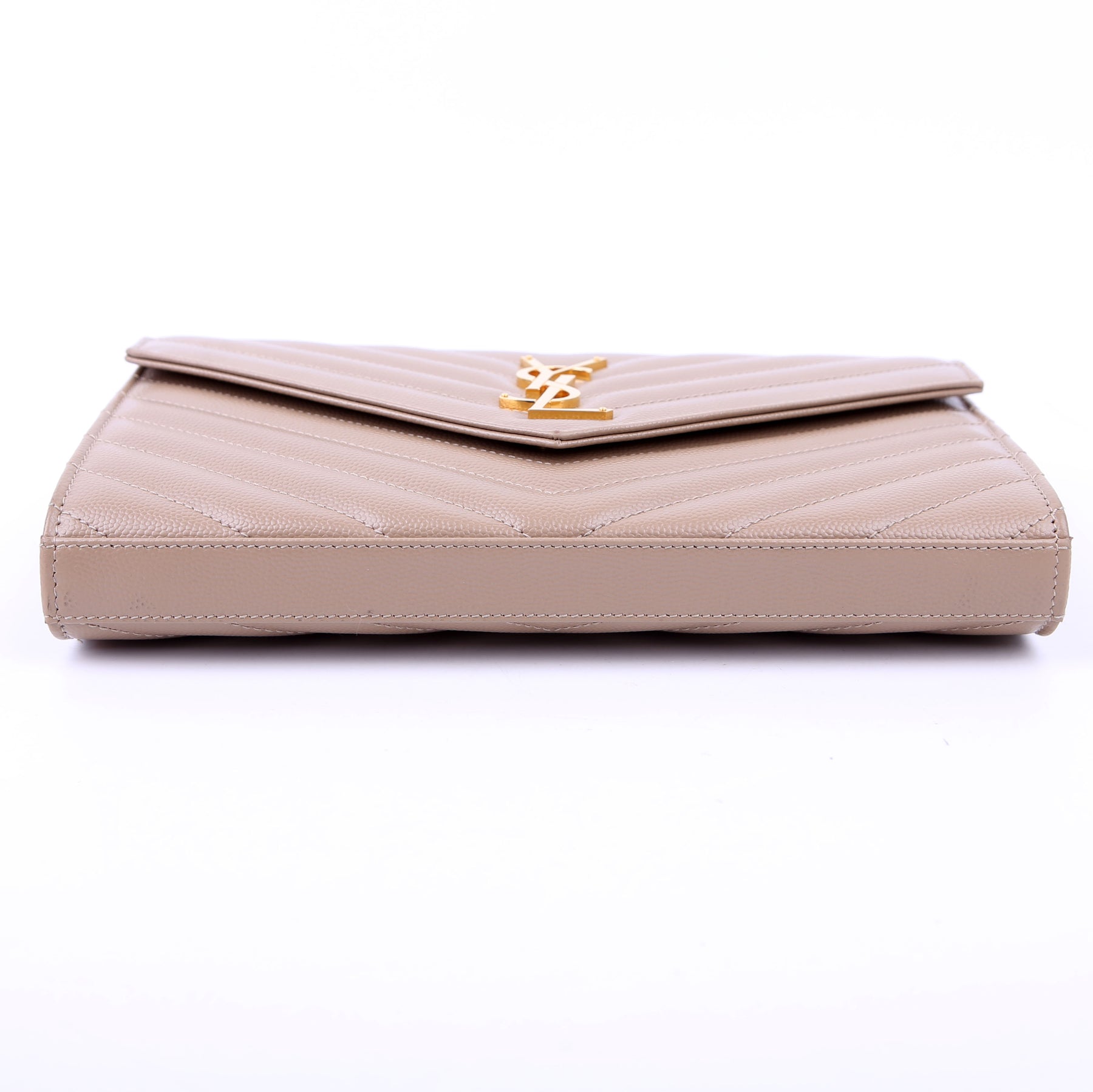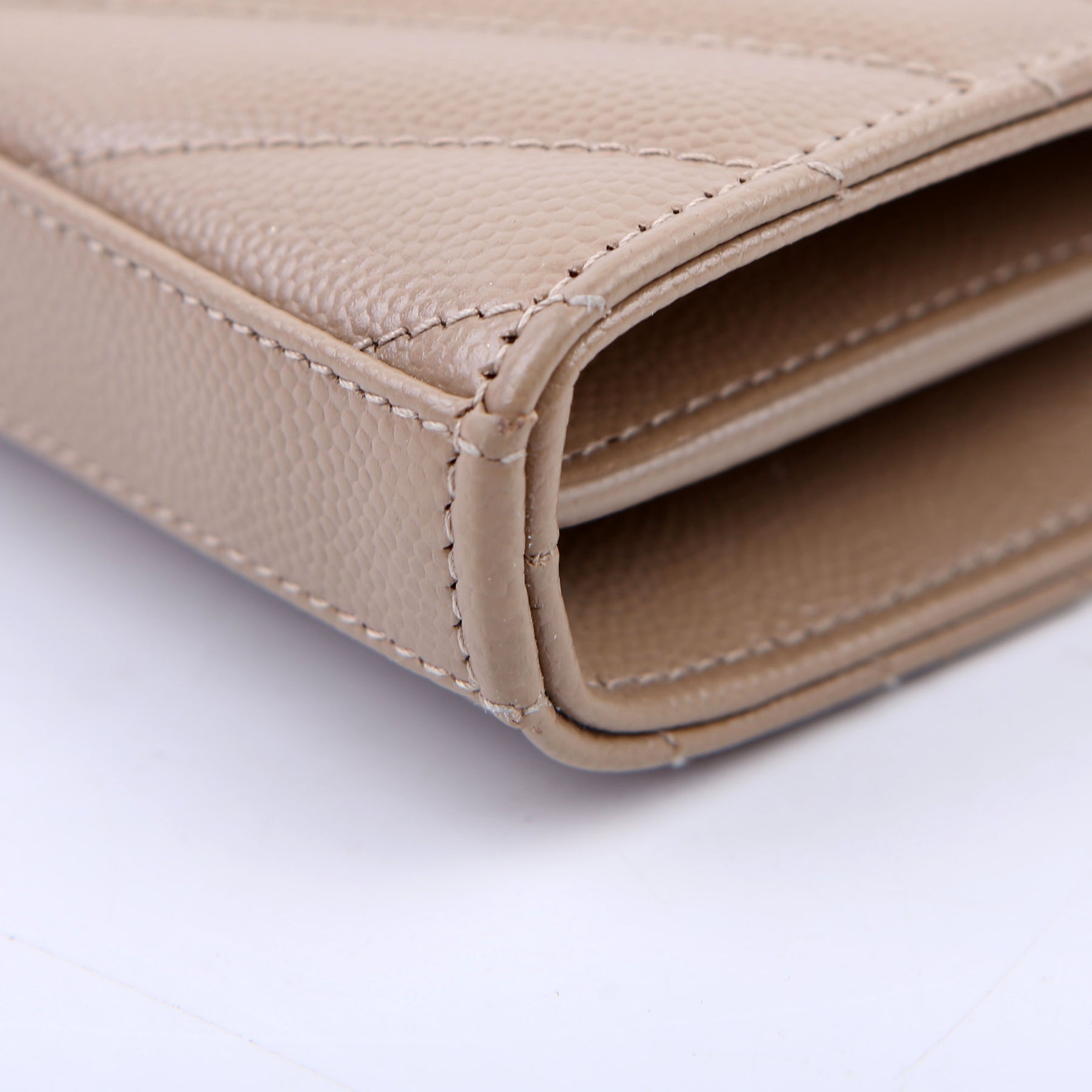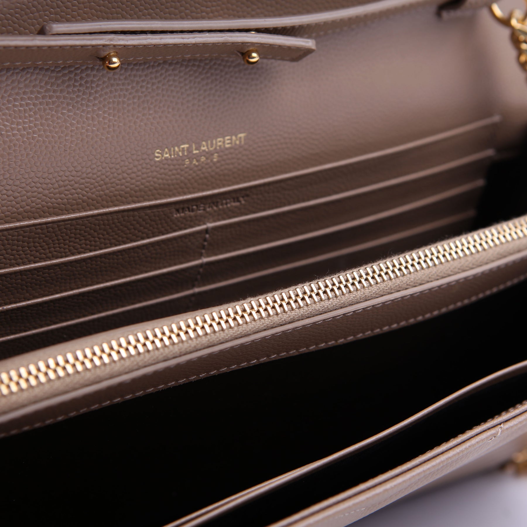 This pre-owned Saint Laurent Grain De Chain Wallet is guaranteed 100% authentic. The exterior is in the classic Saint Laurent Grain De Poudre leather.