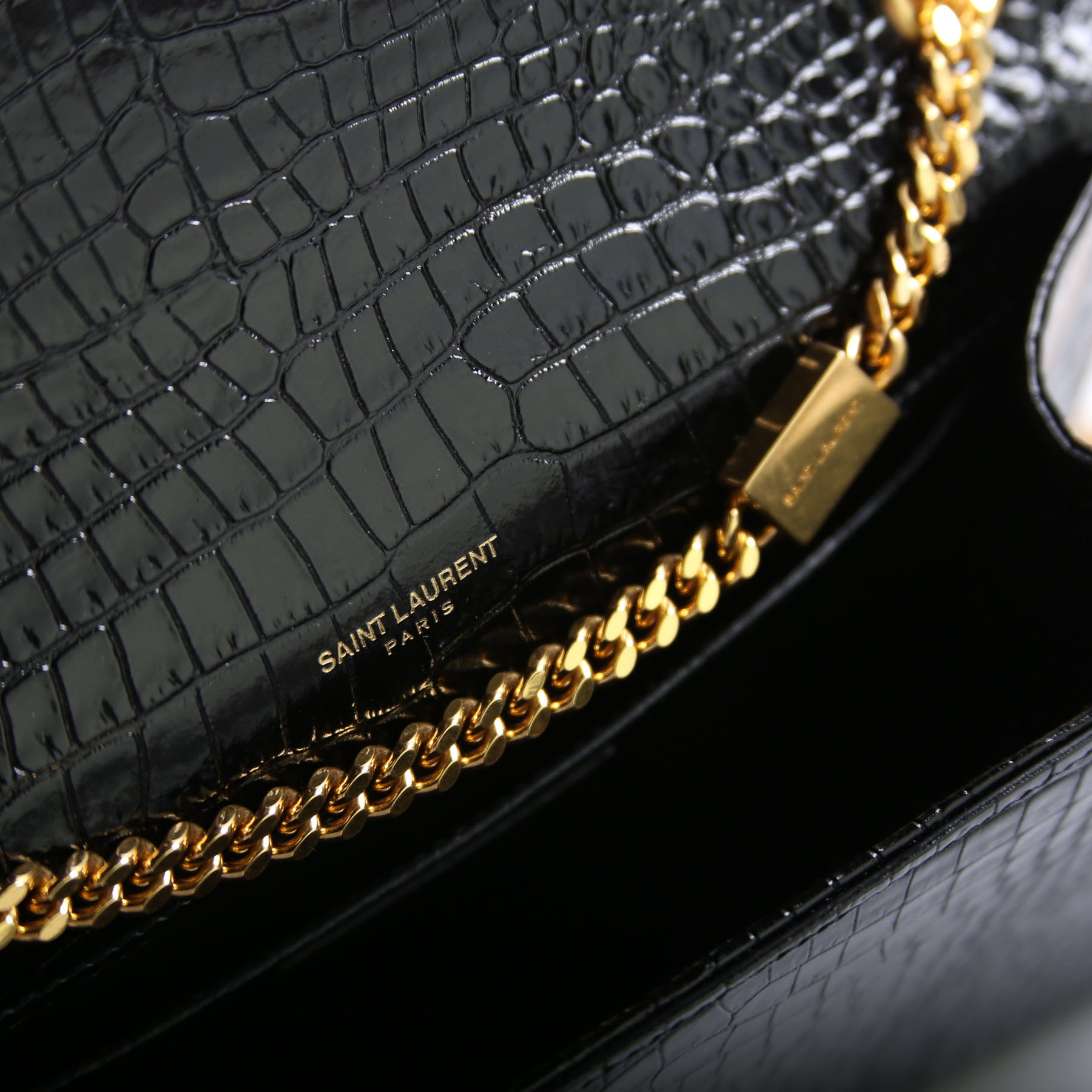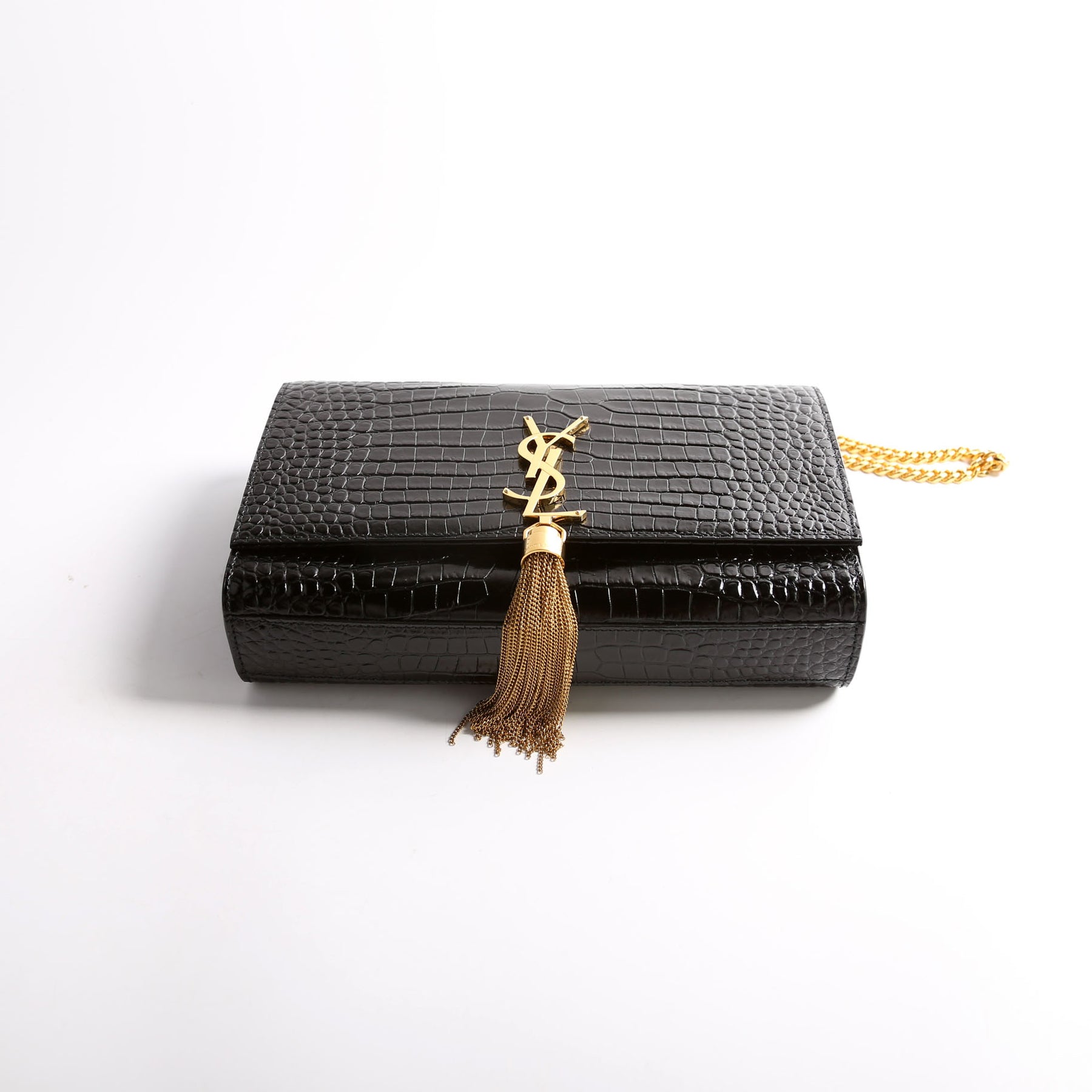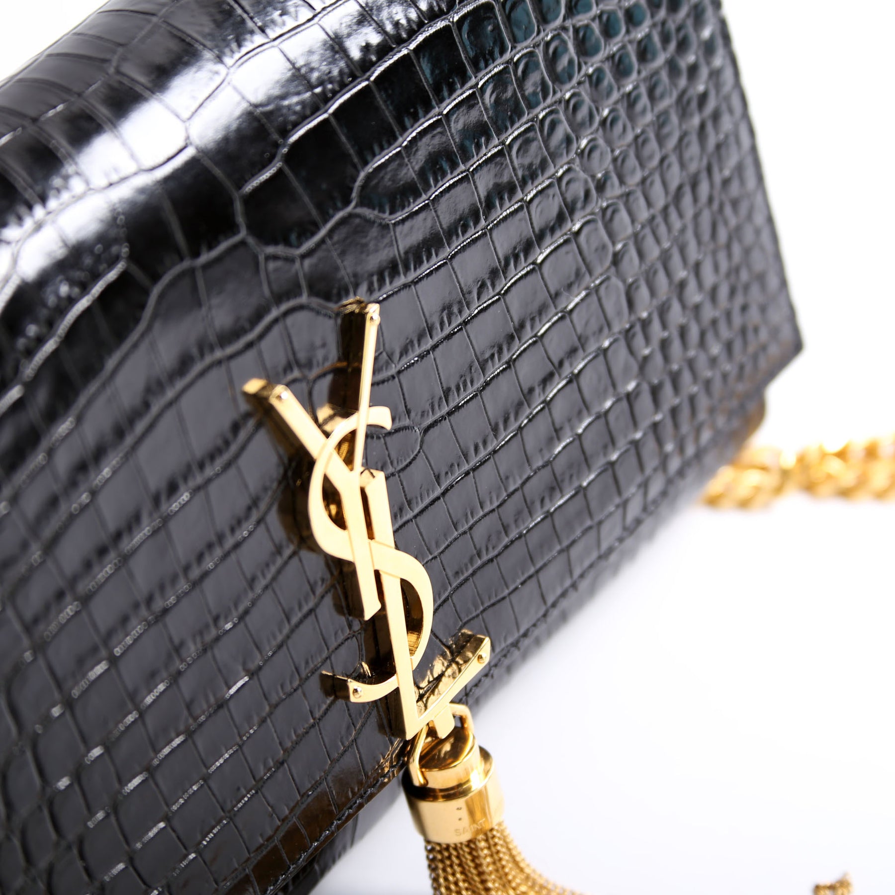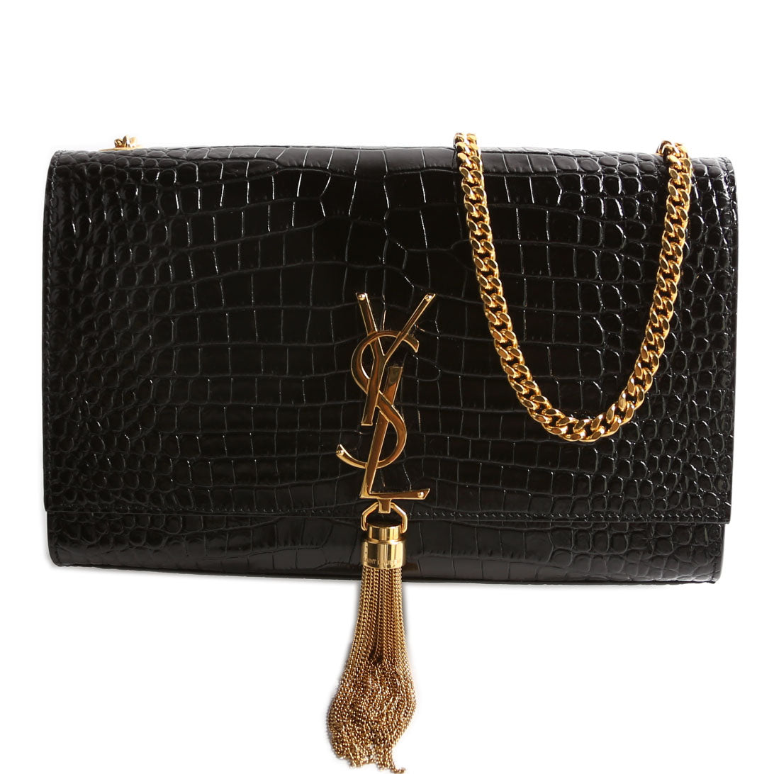 This pre-owned Saint Laurent Kate Tassel Satchel Medium is guaranteed 100% authentic. The exterior is in the classic Saint Laurent Crocodile Embossed leather.