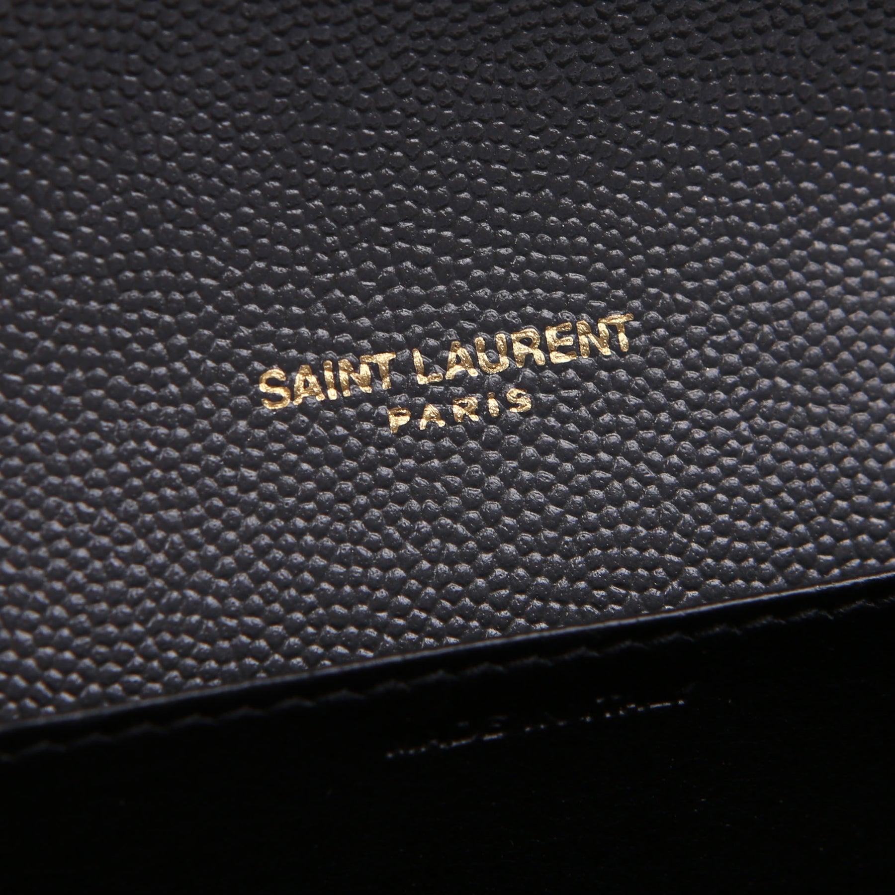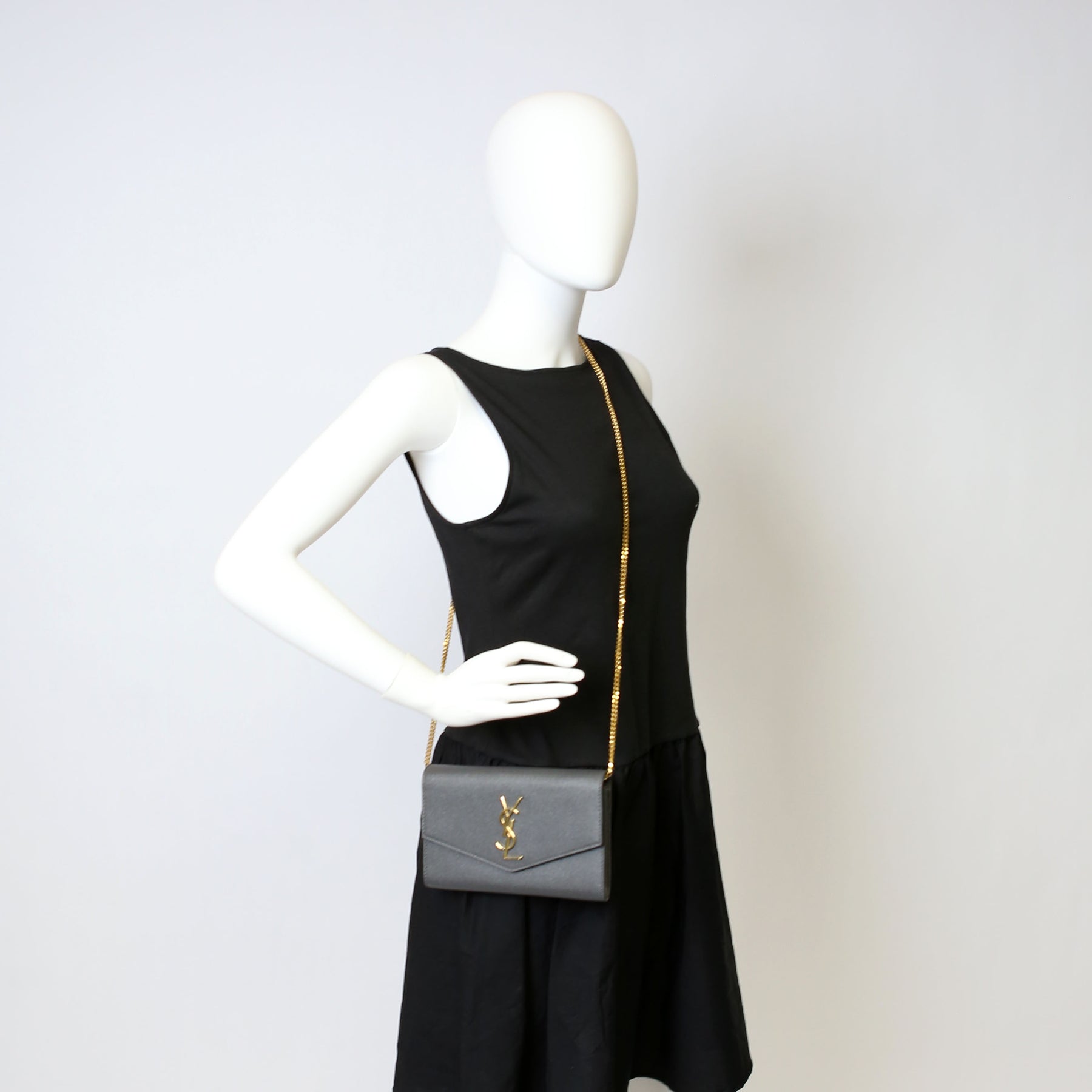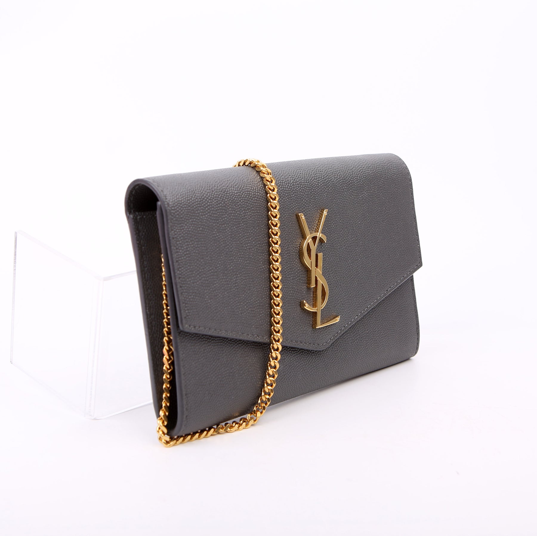 This pre-owned Saint Laurent Uptown Chain Wallet is guaranteed 100% authentic. The exterior is in the classic Saint Laurent Grain De Poudre leather.