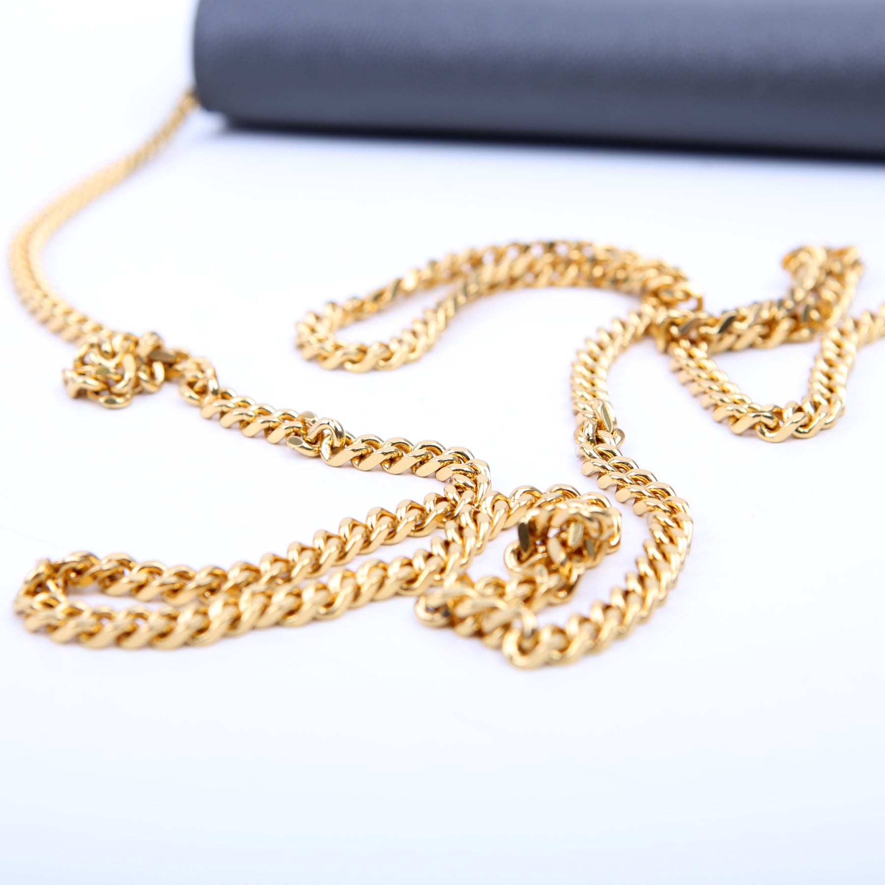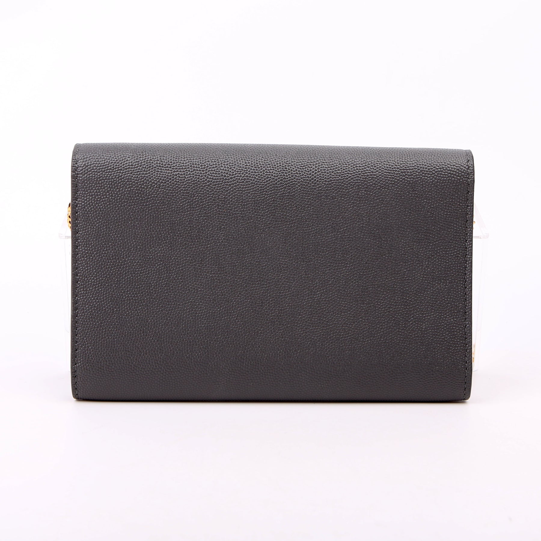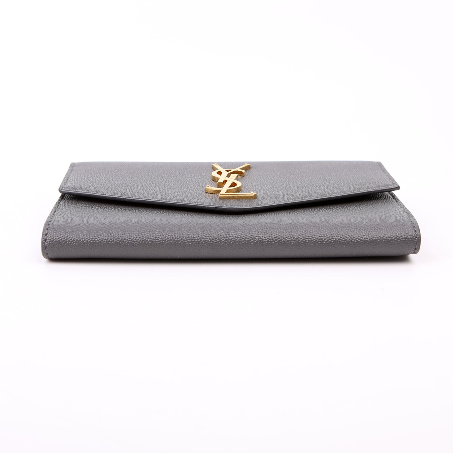 This pre-owned Saint Laurent Uptown Chain Wallet is guaranteed 100% authentic. The exterior is in the classic Saint Laurent Grain De Poudre leather.