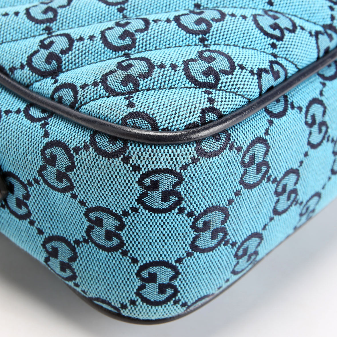 This pre-owned Gucci Marmont Small Camera is guaranteed 100% authentic. The exterior is in the classic Gucci GG Canvas