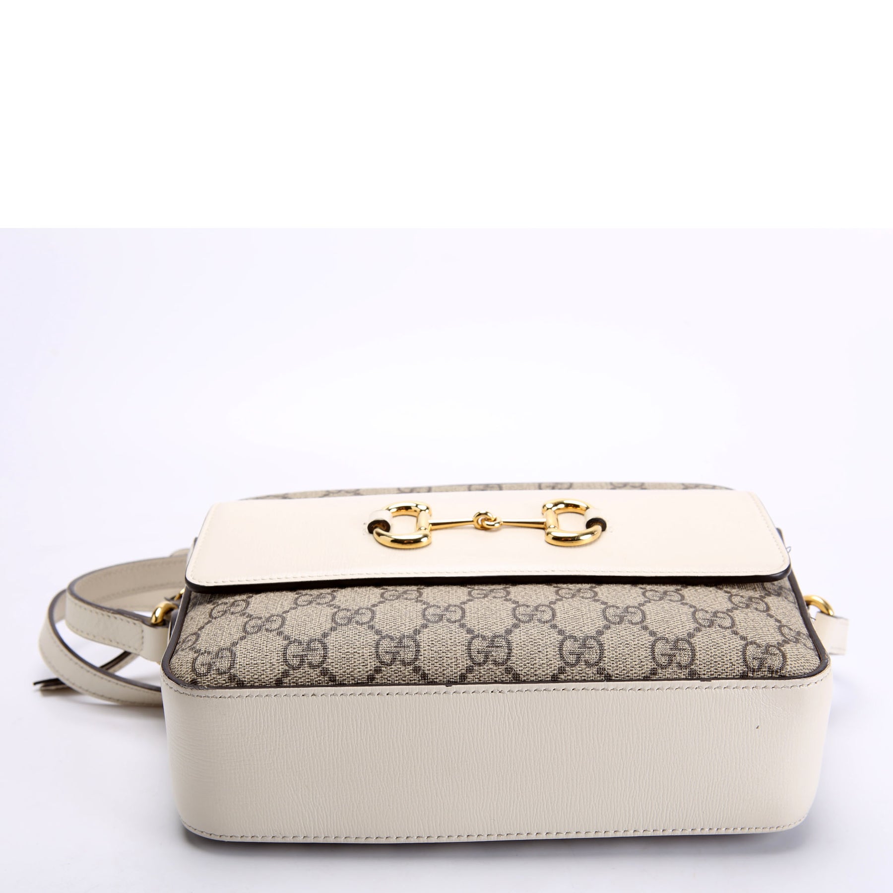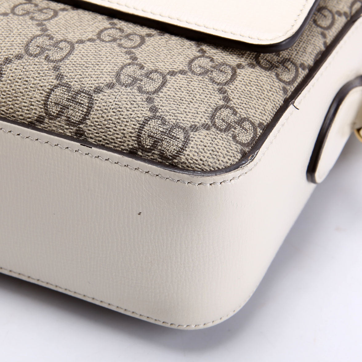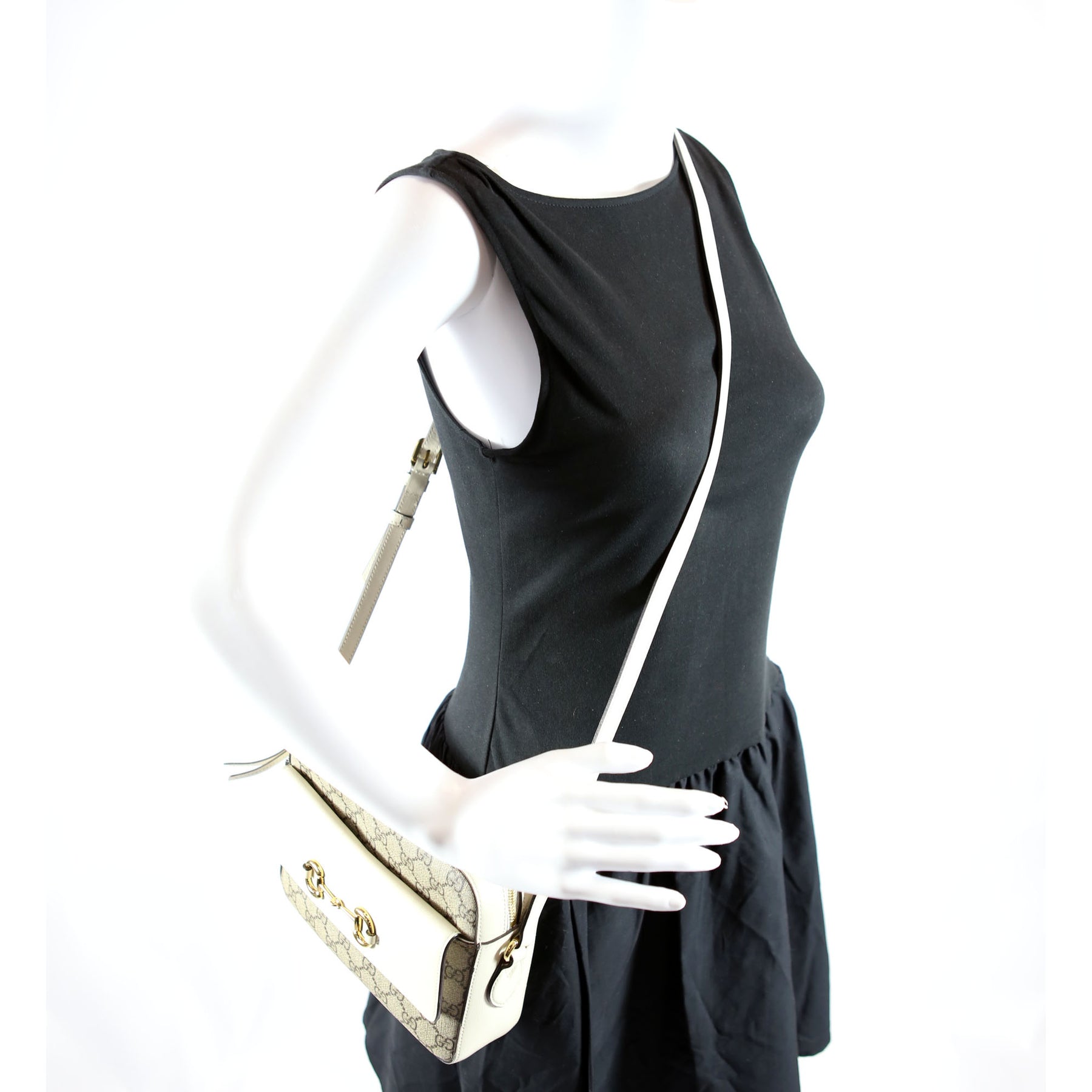 This pre-owned Gucci Horsebit 1955 Small is guaranteed 100% authentic. The exterior is in the classic Gucci Coated Canvas and Leather.
