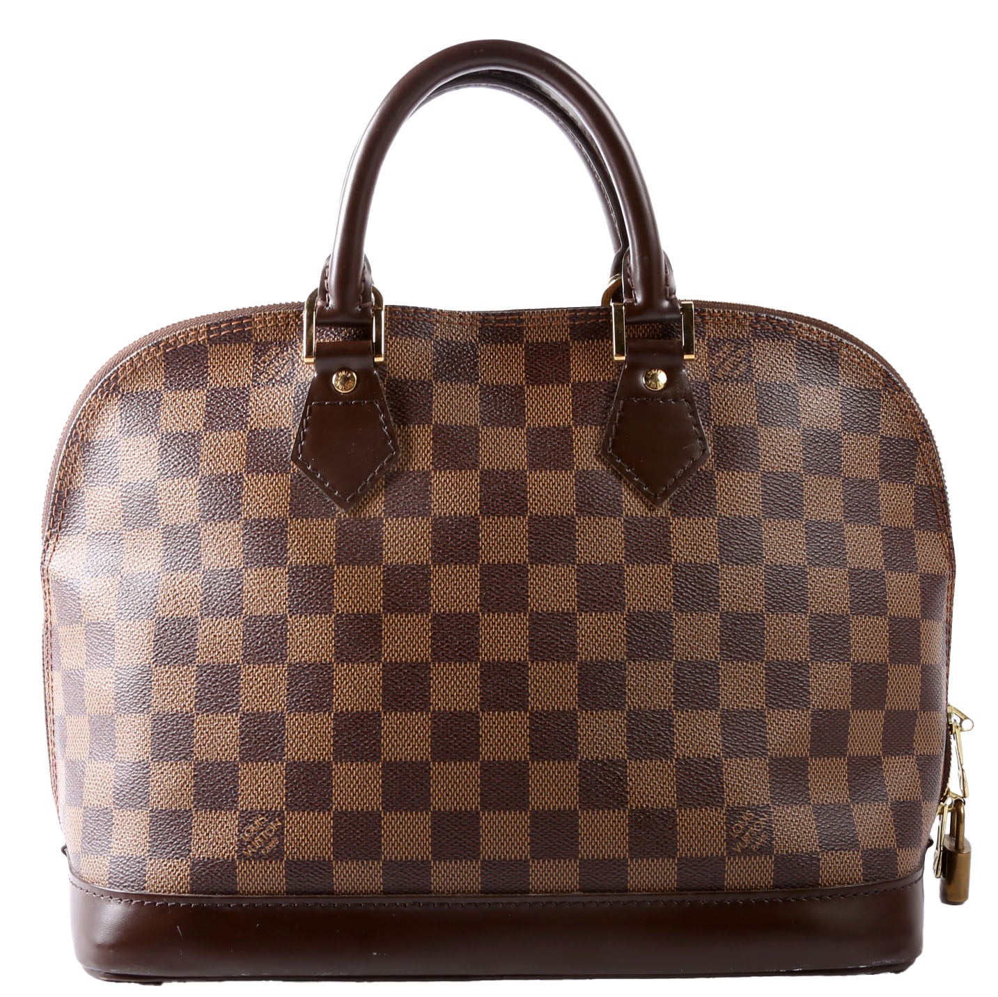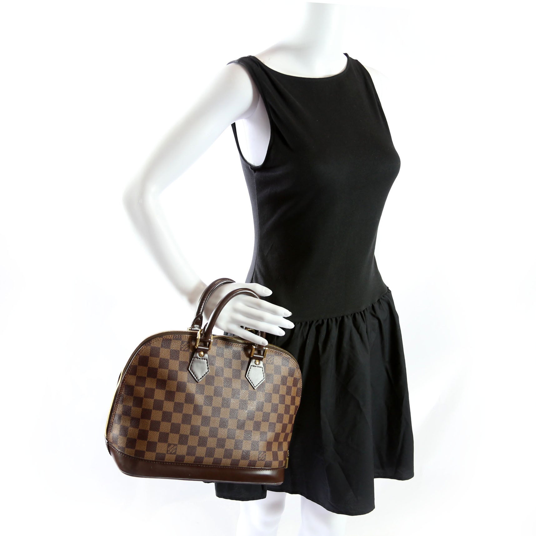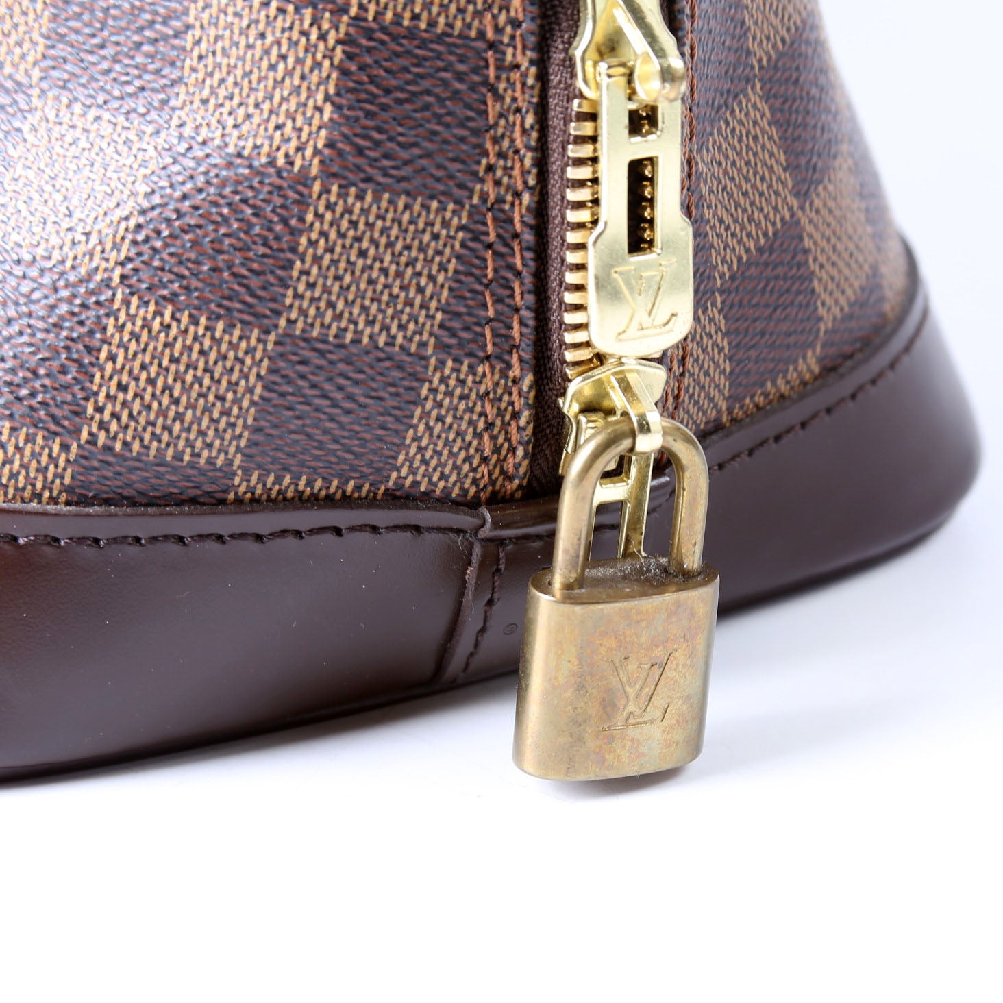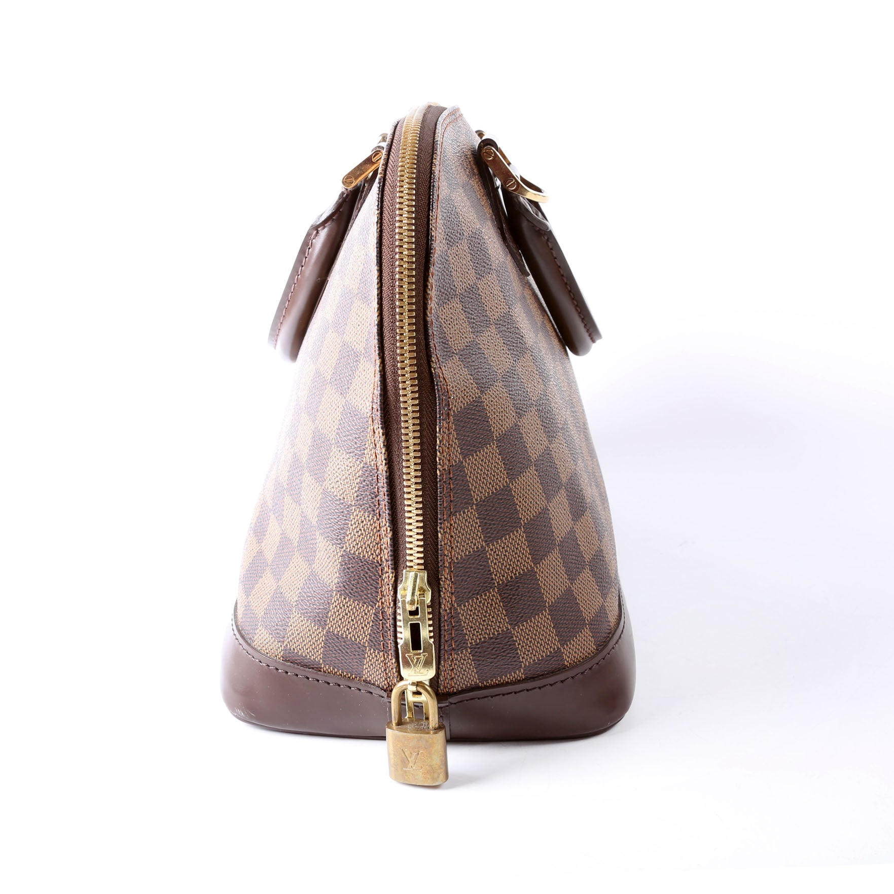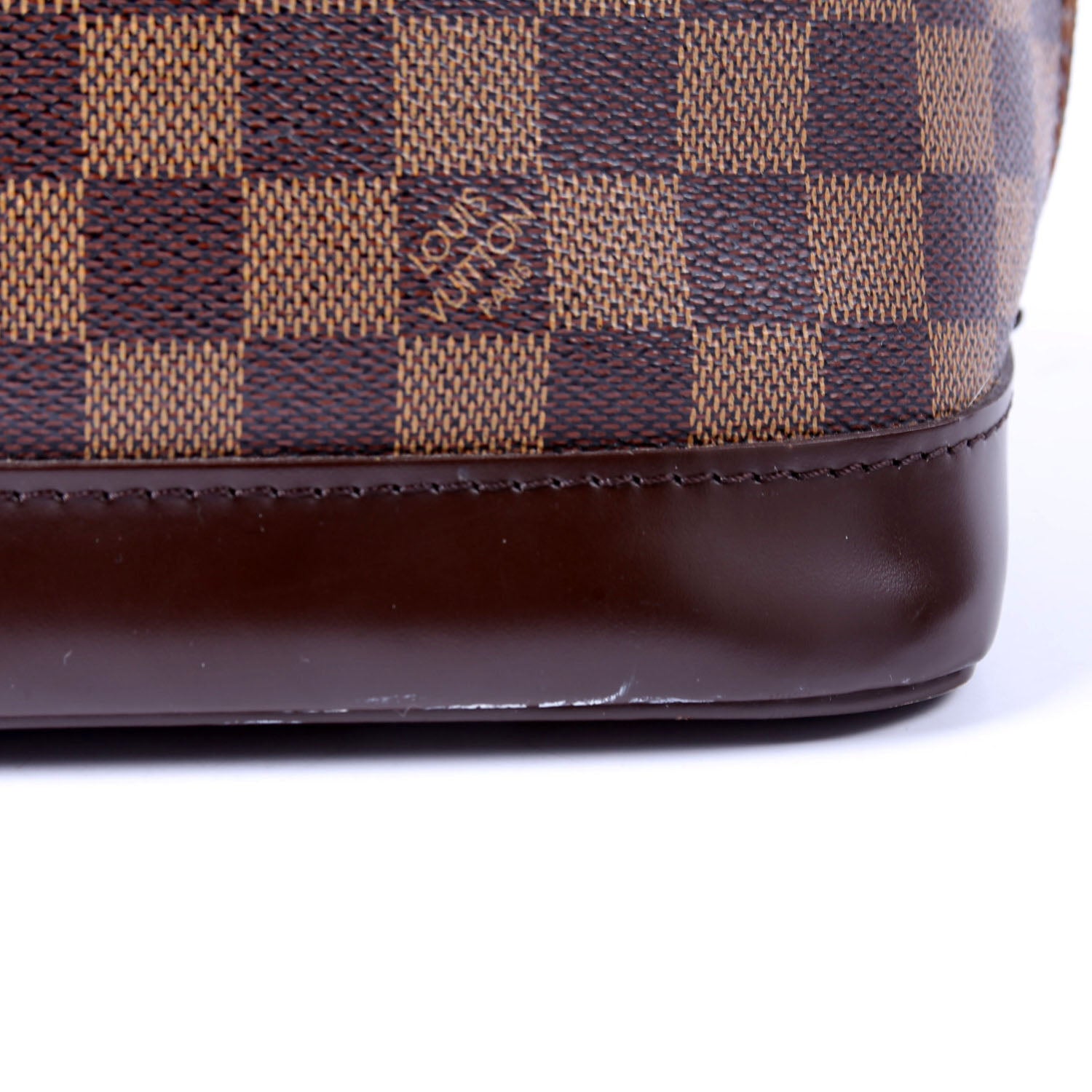 This pre-owned Louis Vuitton Alma PM is guaranteed 100% authentic. The exterior is in the classic Louis Vuitton Damier Ebene coated canvas.