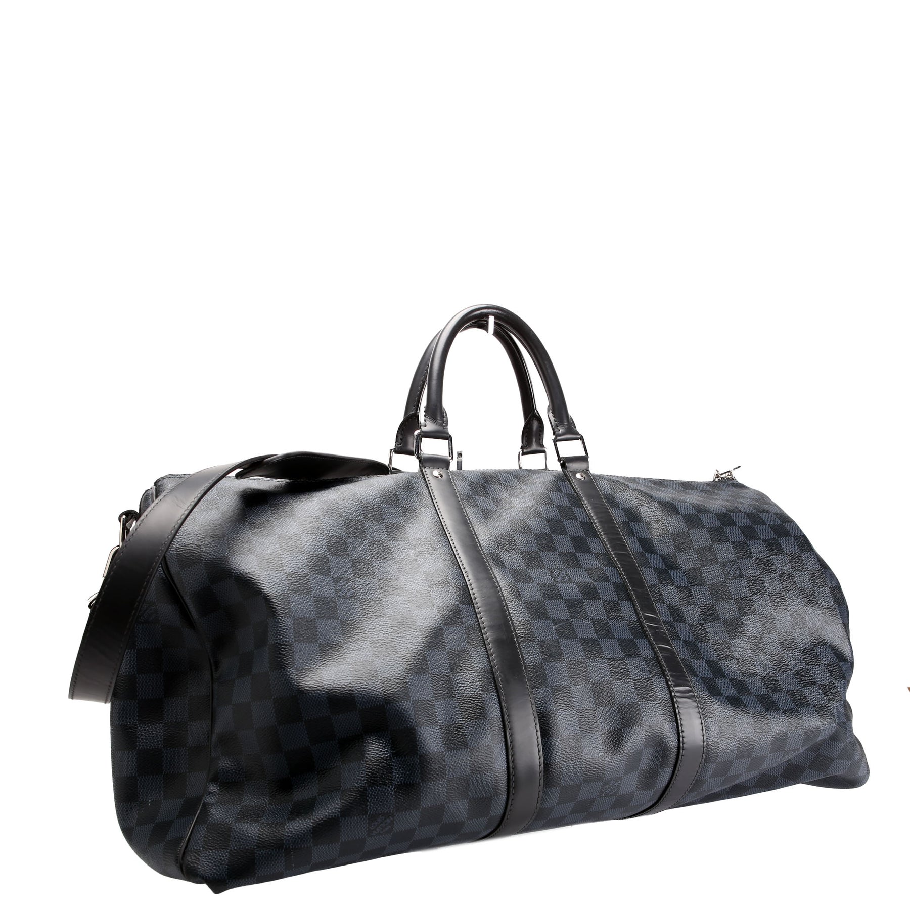 This pre-owned Louis Vuitton Keepall 55 with Strap is guaranteed 100% authentic. The exterior is in the classic Louis Vuitton Damier Ebene Cobalt Graphite coated canvas.