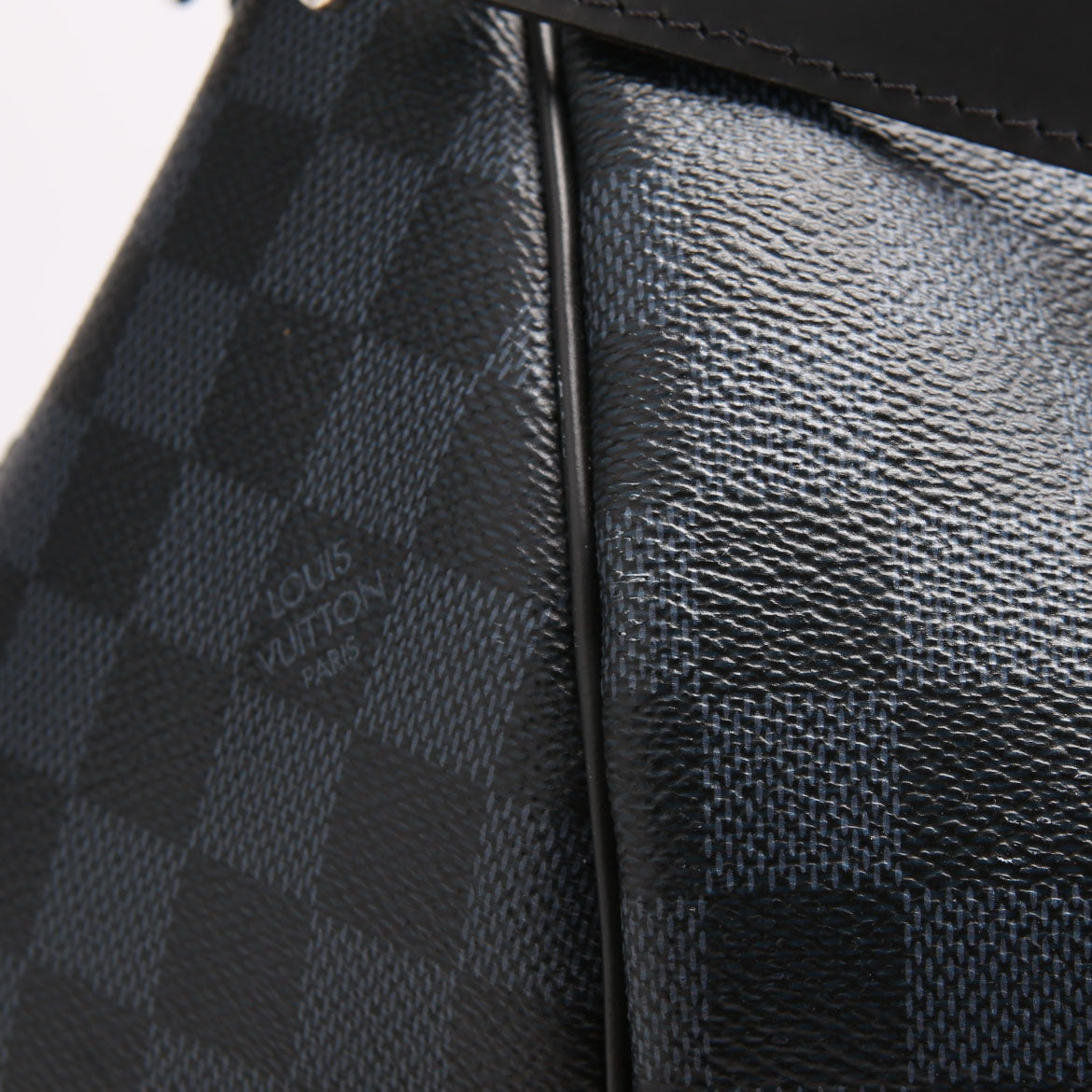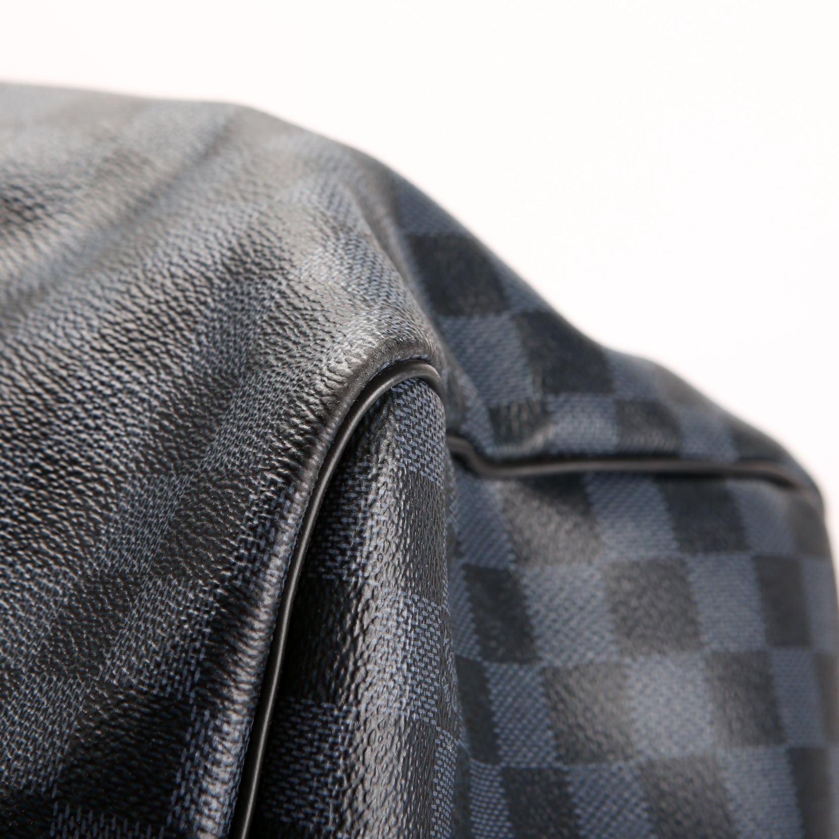 Exterior: The exterior coated canvas shows minor white paint stains. The corners show rubbing and wear. The leather detailing have signs of wear and minor scratching.