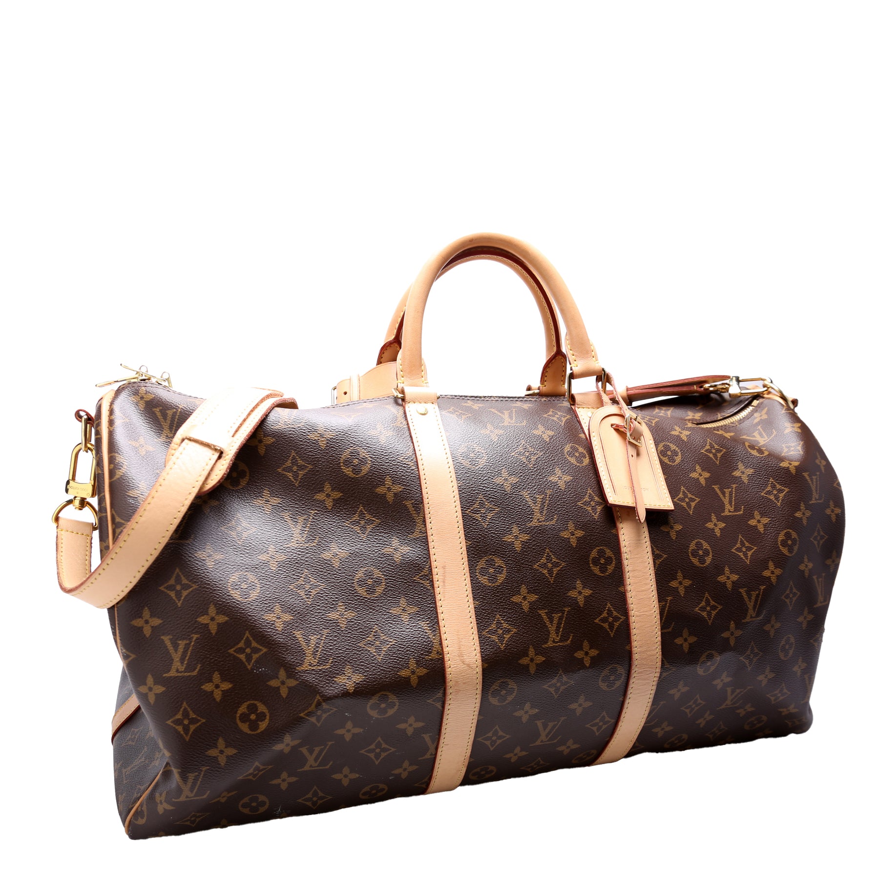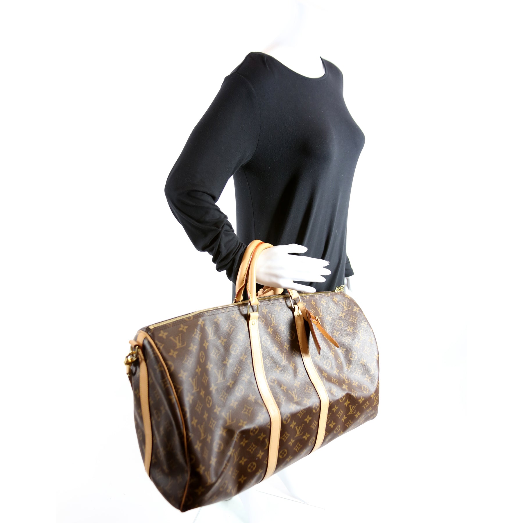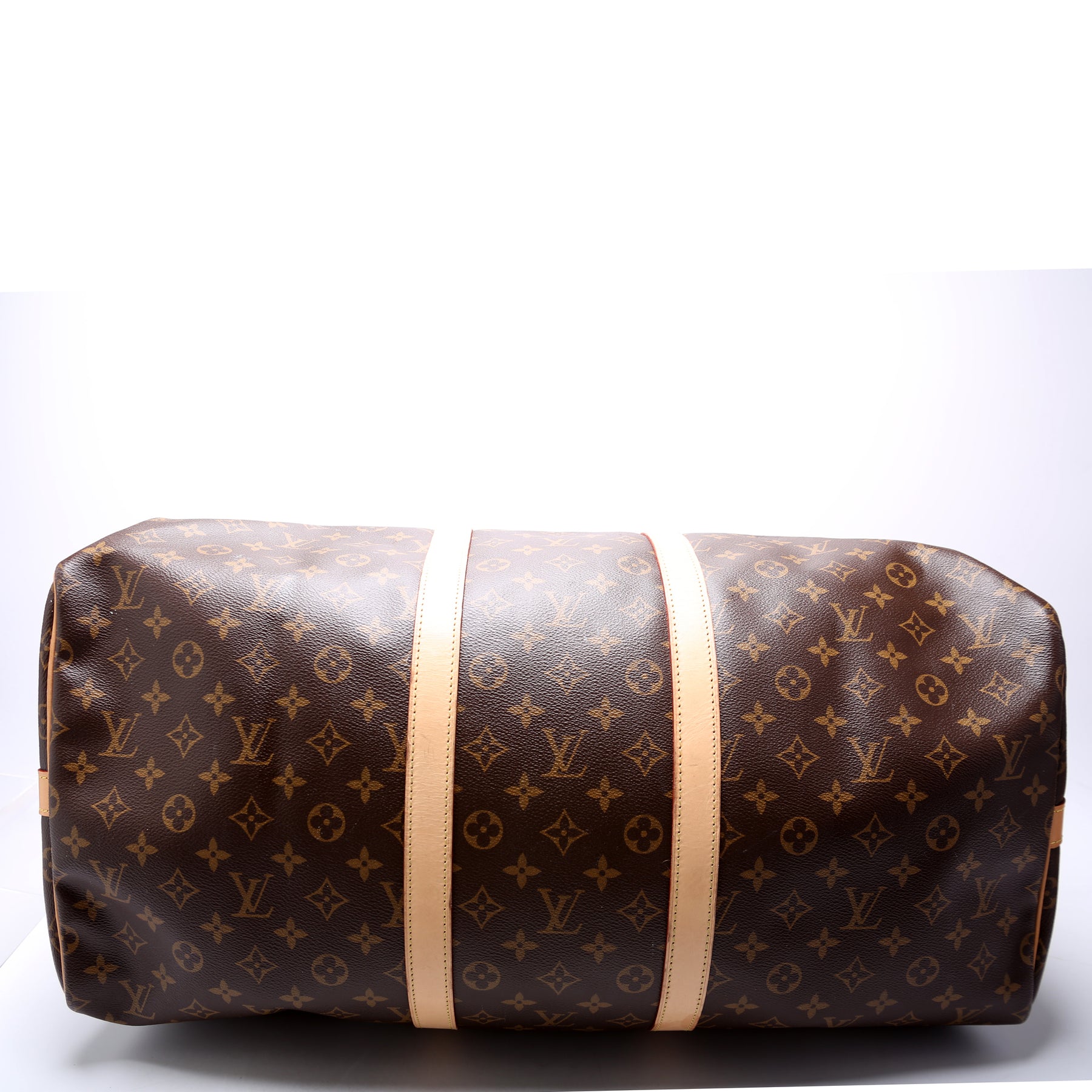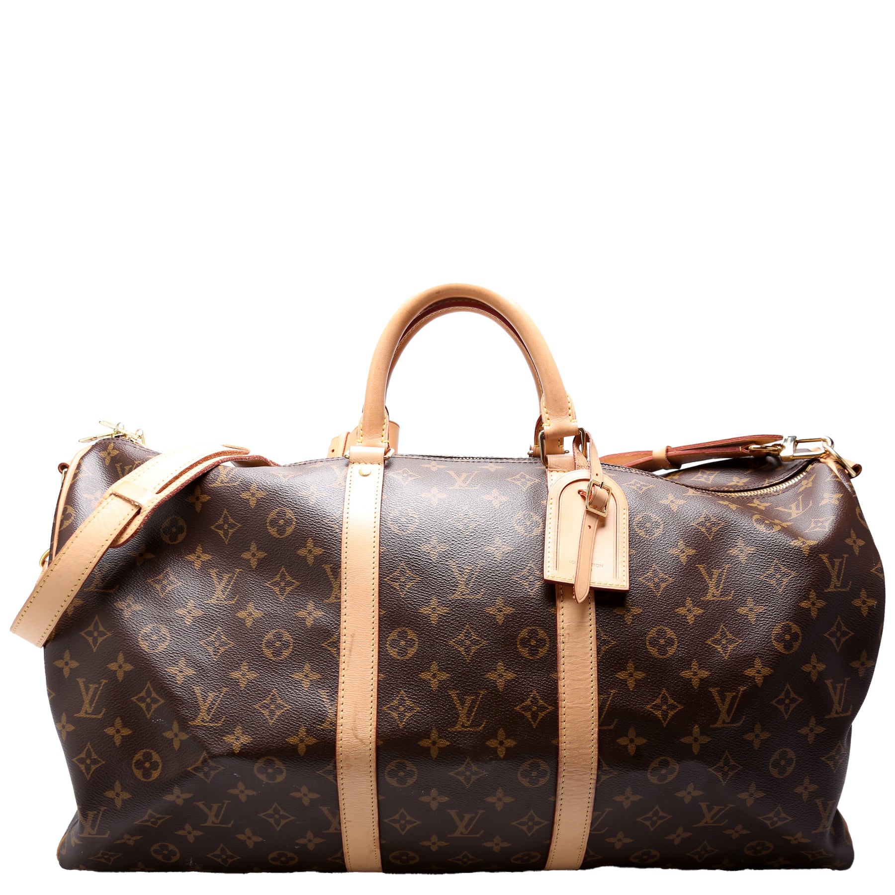 This pre-owned Louis Vuitton Keepall 55 is guaranteed 100% authentic. The exterior is in the classic Louis Vuitton Monogram coated canvas.