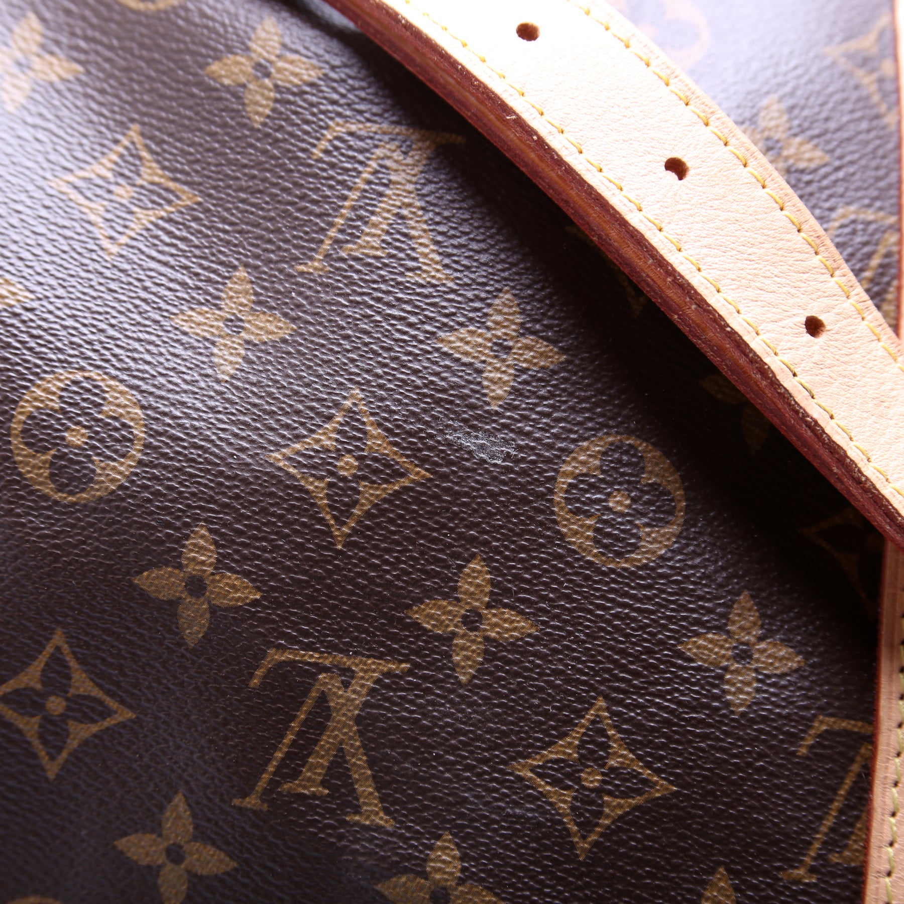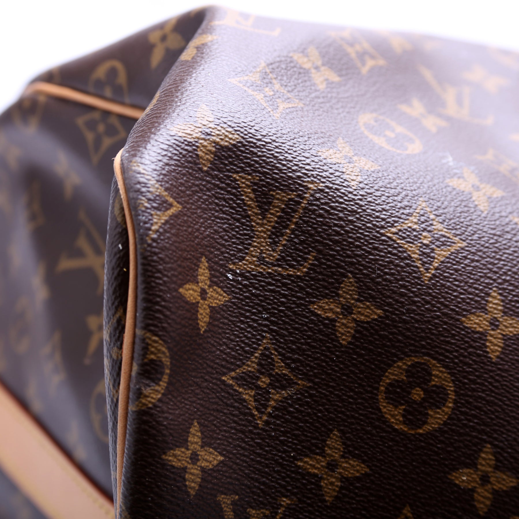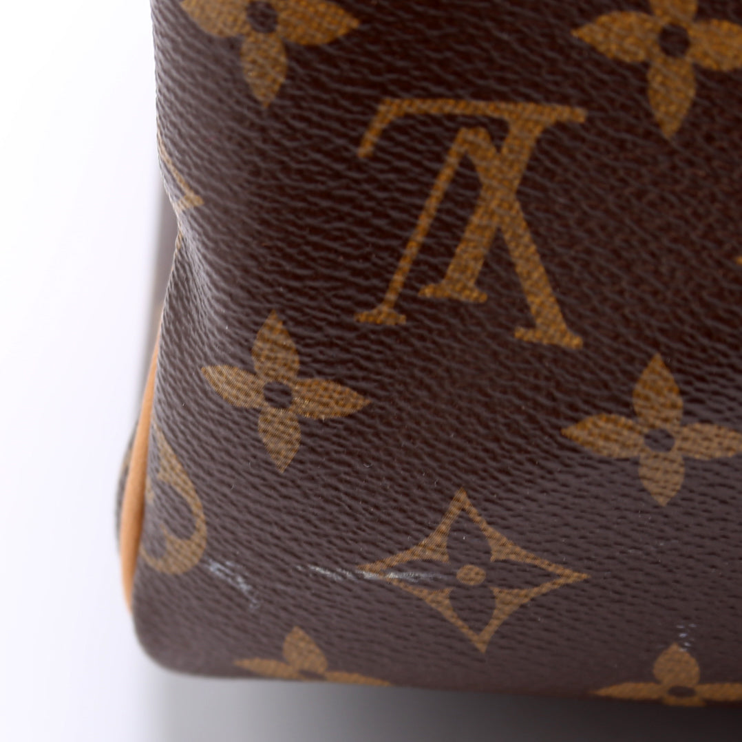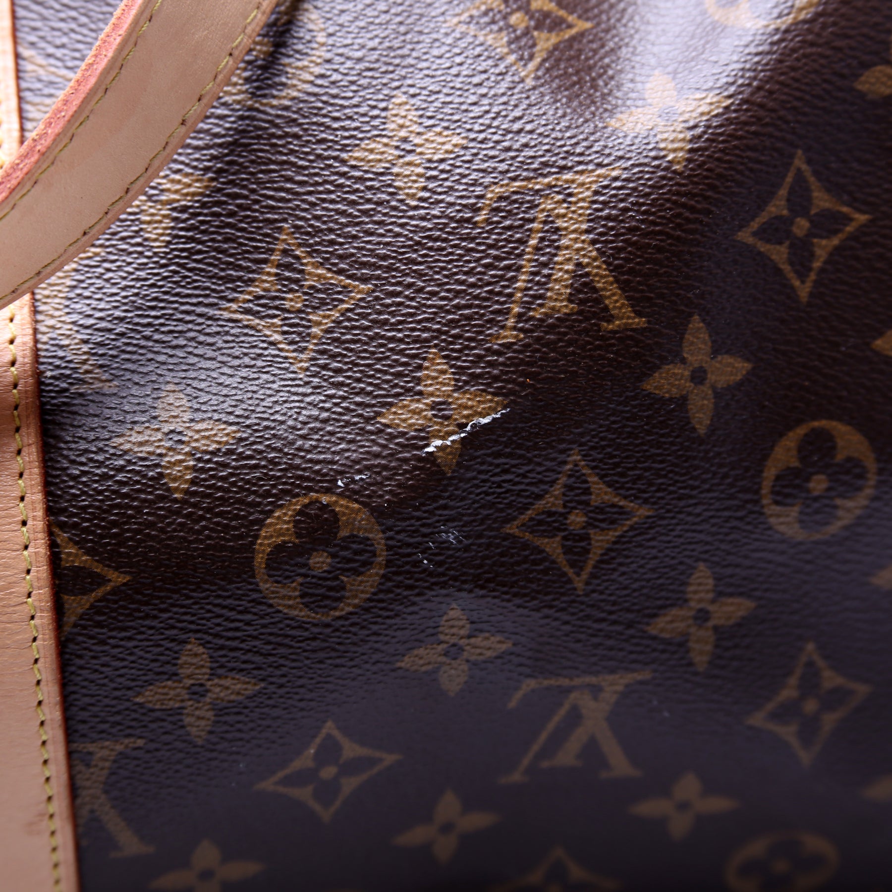 Exterior: The exterior Monogram coated canvas is free of any rips or cracks. There are minor scuffs and scratches throughout. The corners and leather details show minor wear. The leather shows minor discoloration.