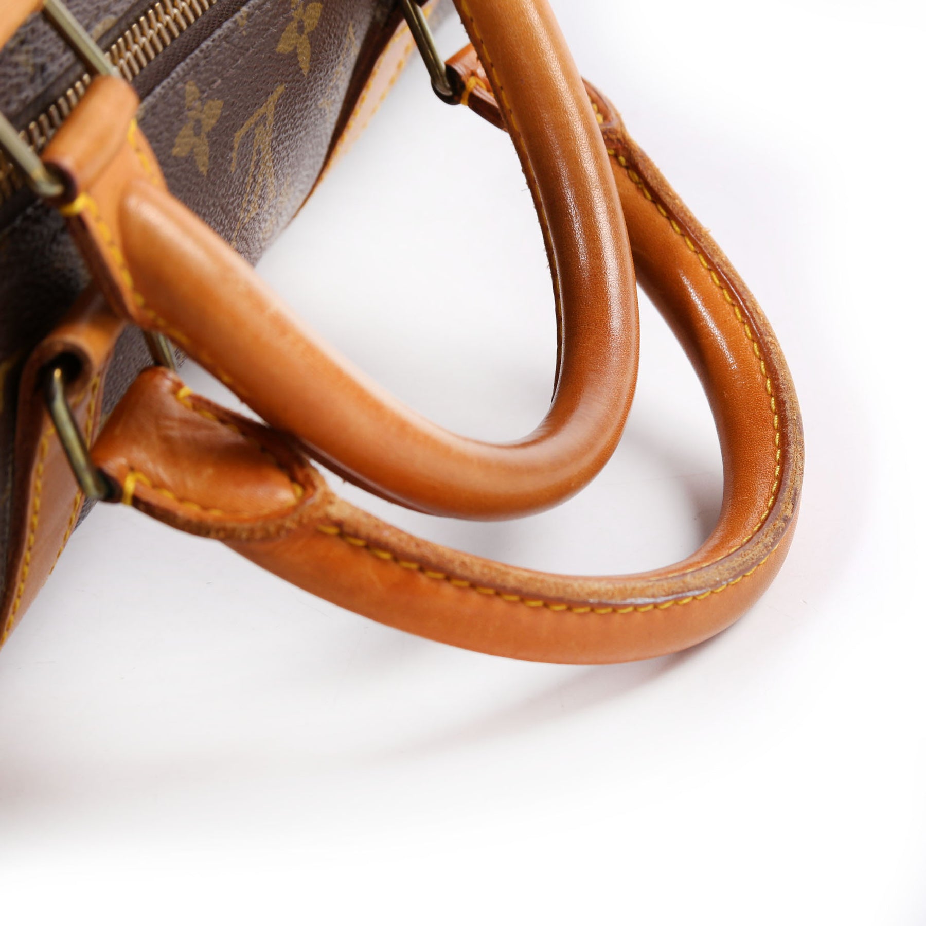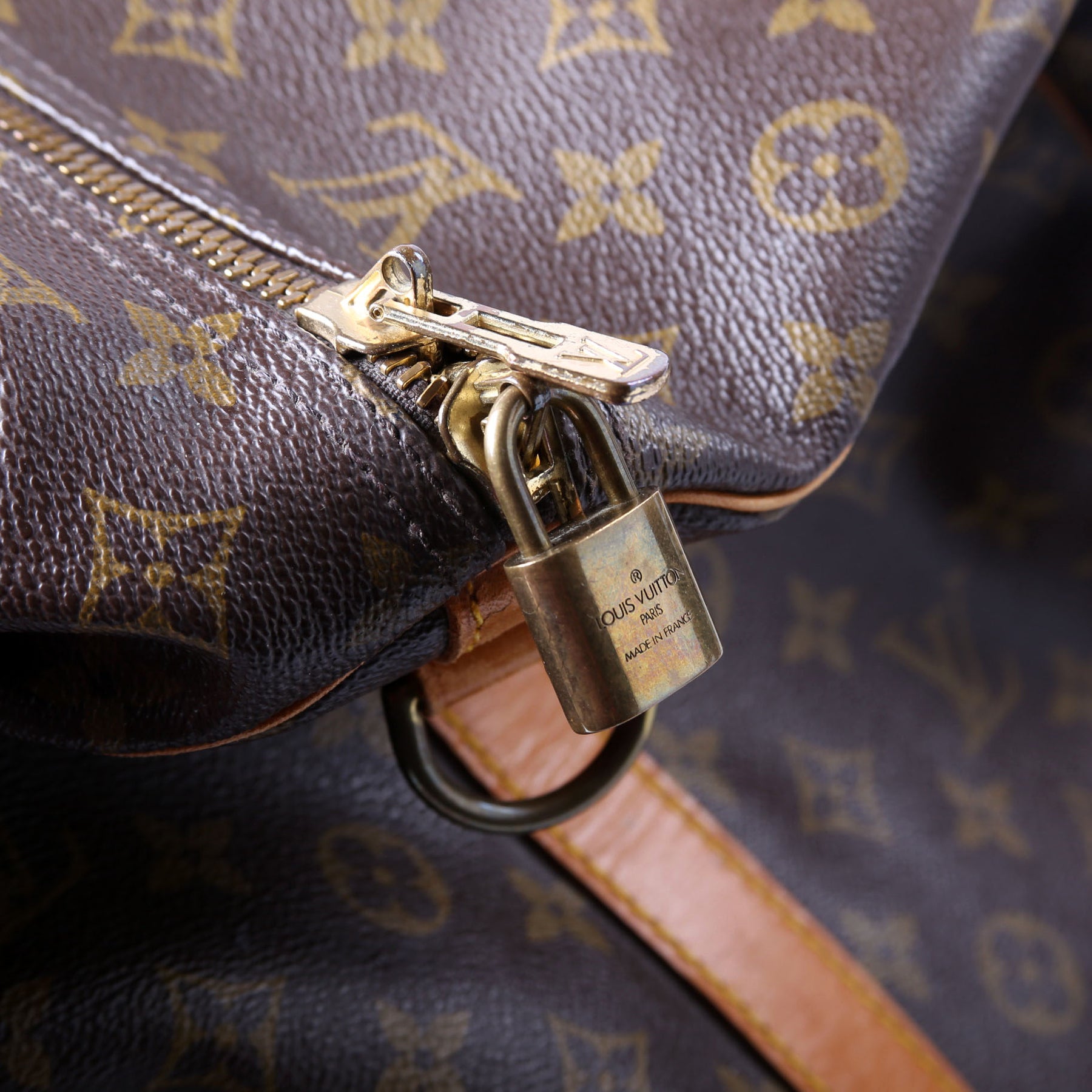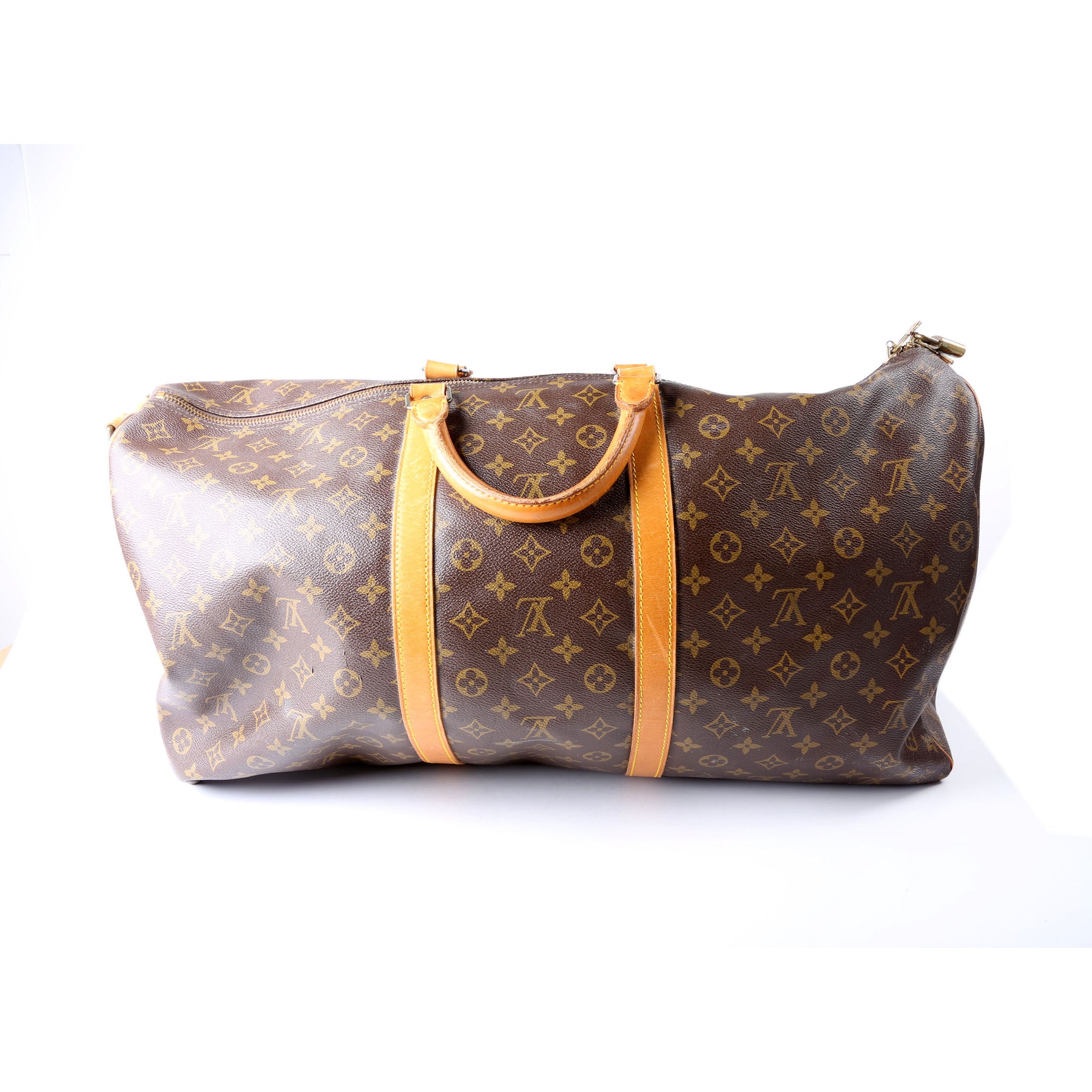 This pre-owned Louis Vuitton Keepall 60 is guaranteed 100% authentic. The exterior is in the classic Louis Vuitton Monogram coated canvas.