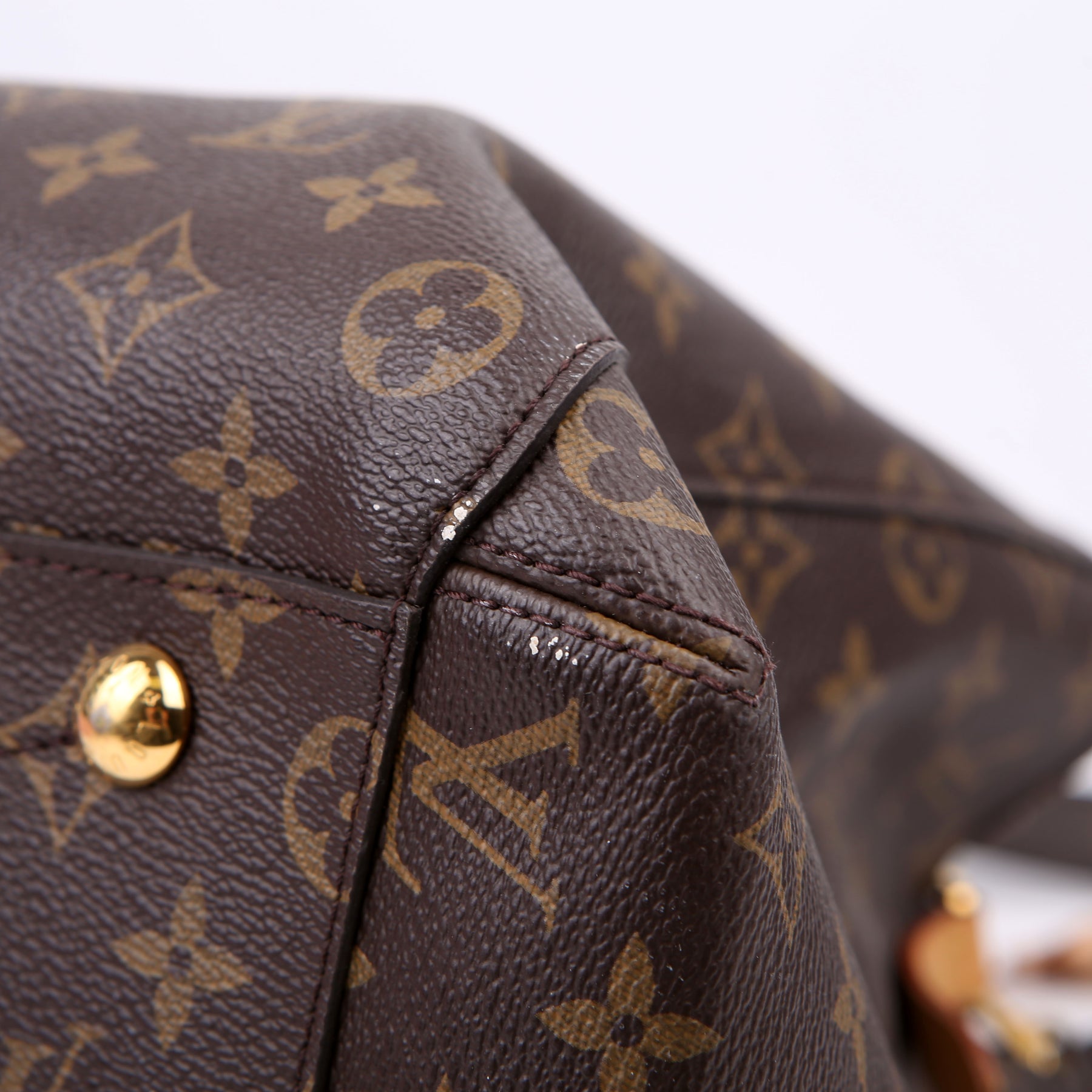 Exterior: The exterior has minor scuffs and marks throughout. The corners and edges show minor wear. The leather tabs show minor wear and discoloration. The structure is misshapen throughout.