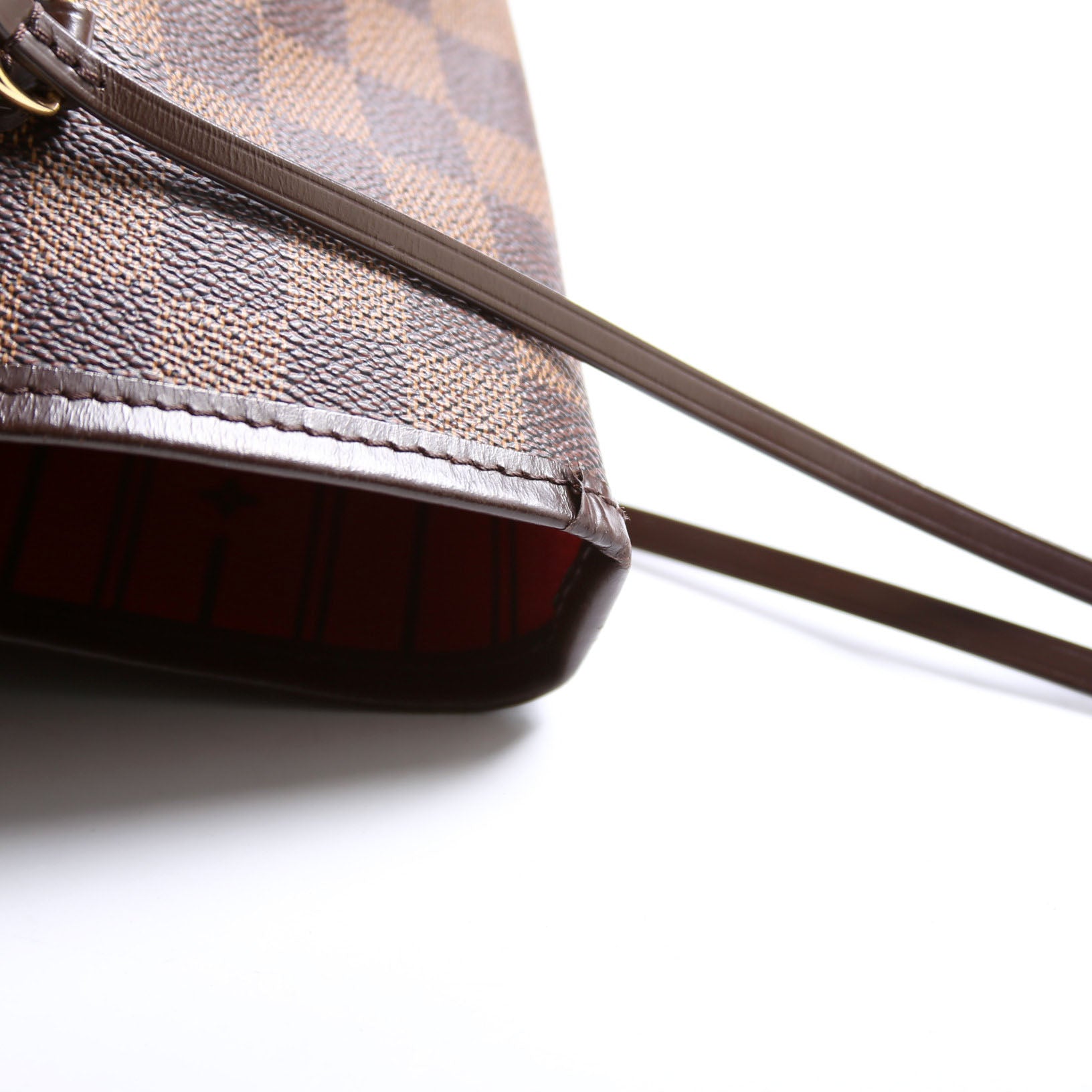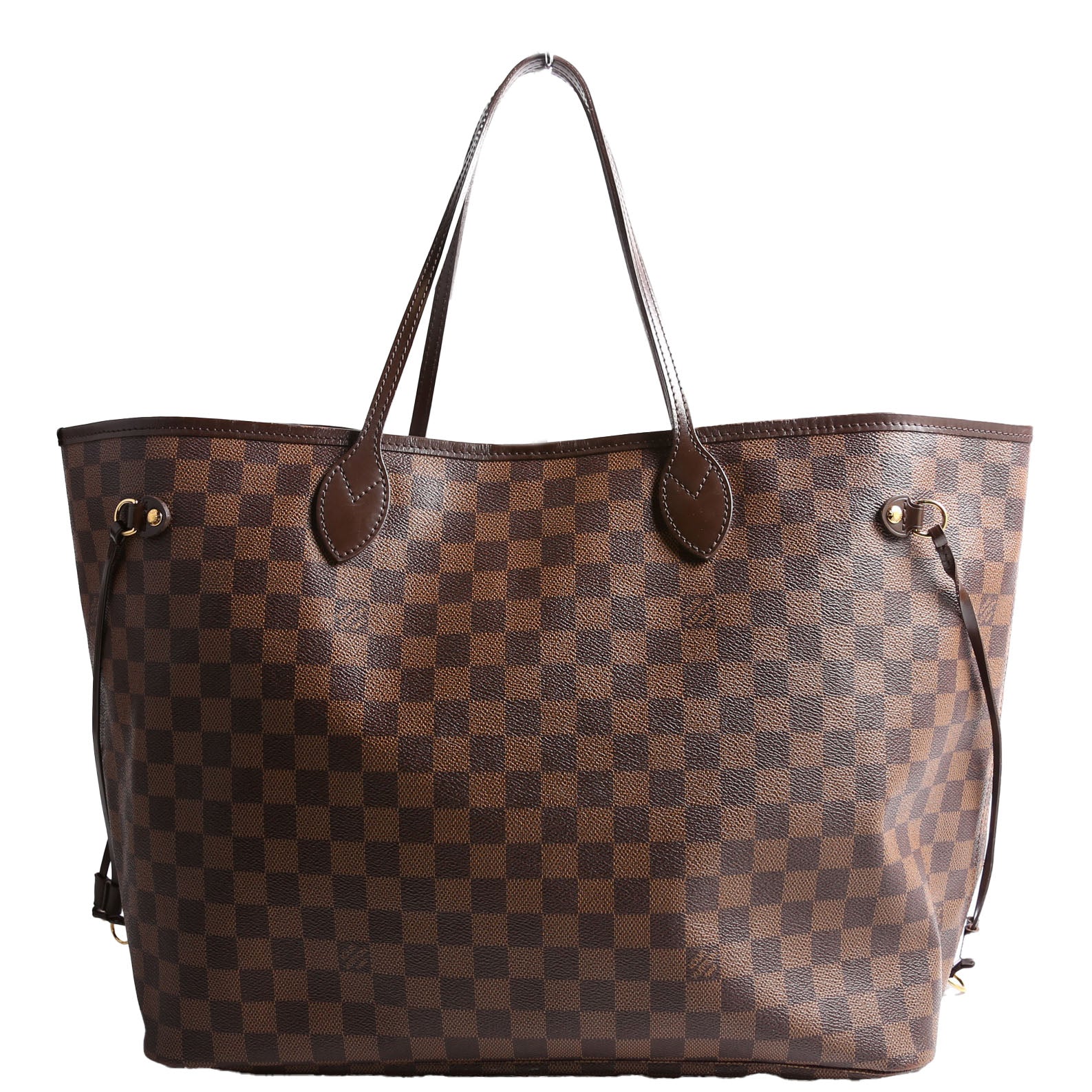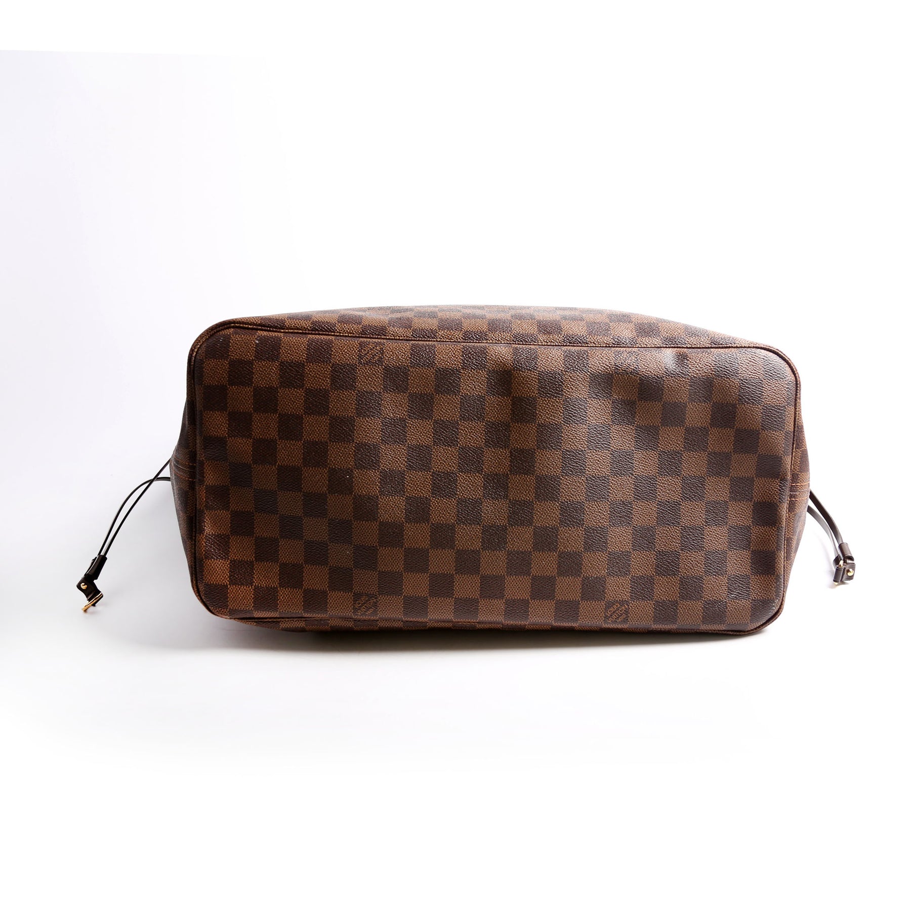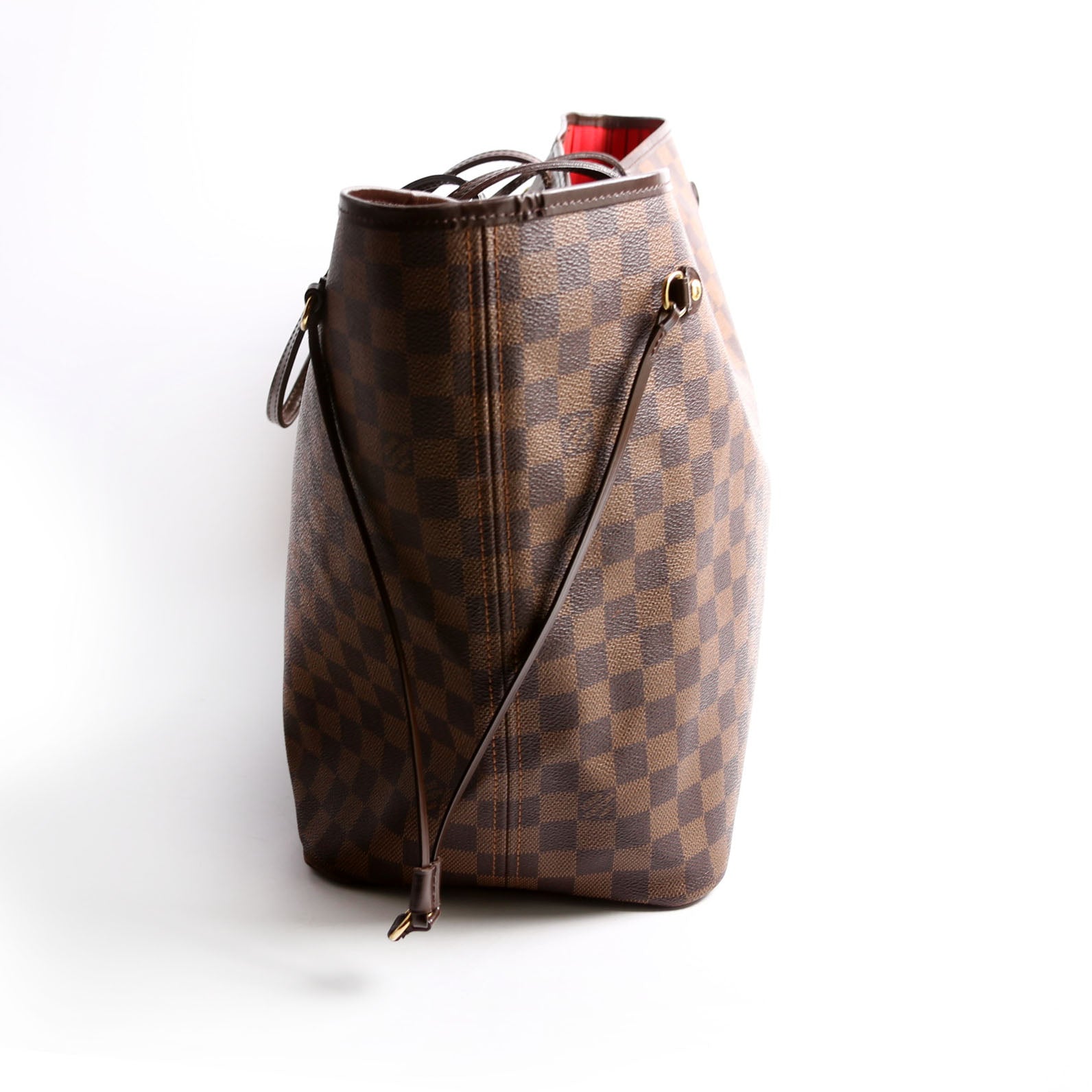 These pre-owned Louis Vuitton Neverfull GM are guaranteed 100% authentic. The exterior is in the classic Louis Vuitton Damier Ebene coated canvas.