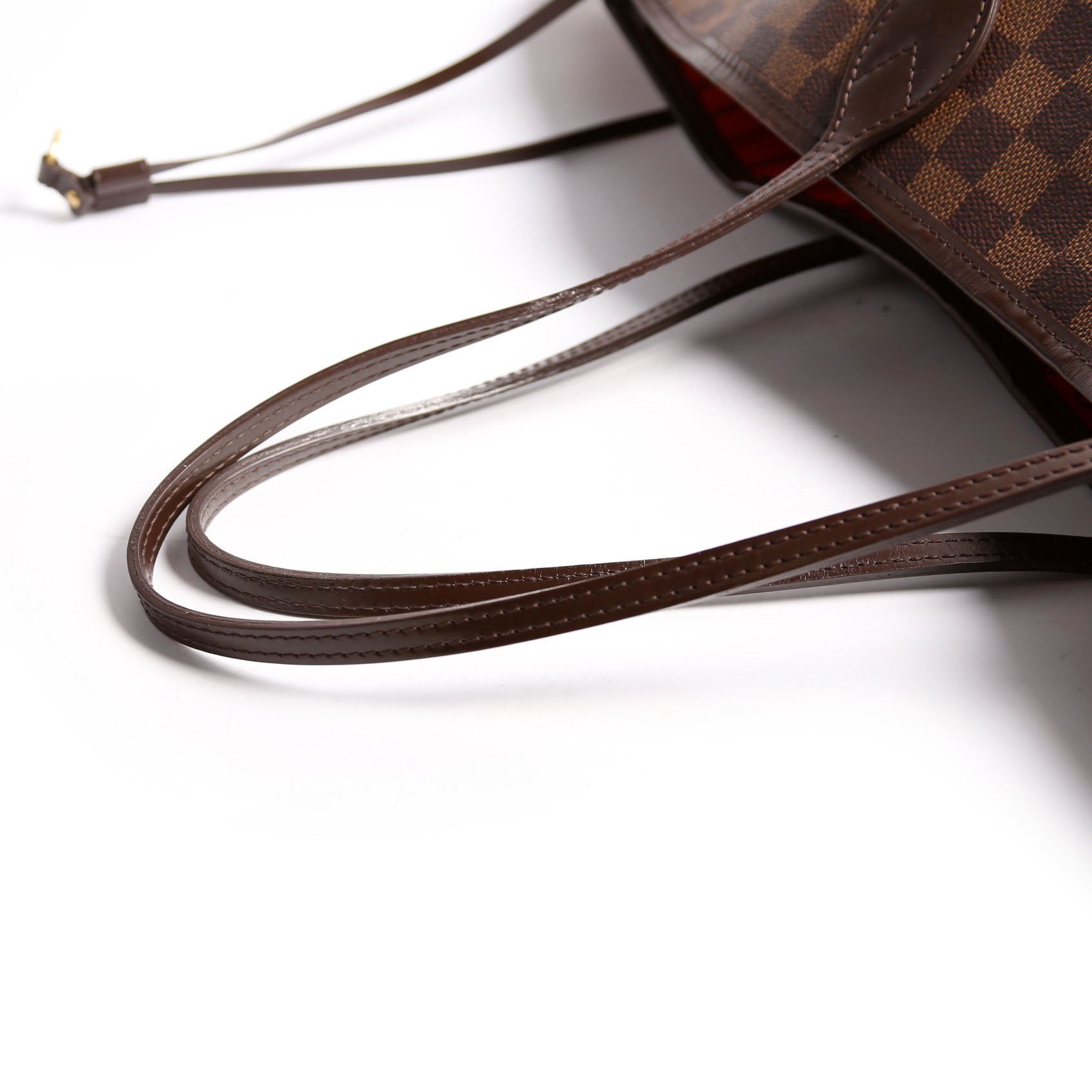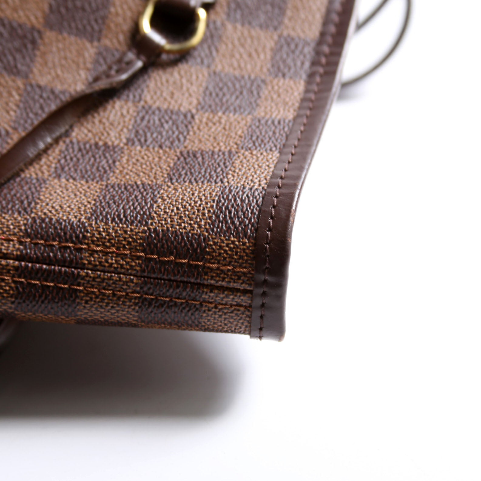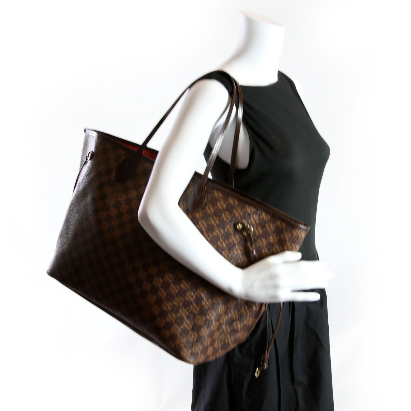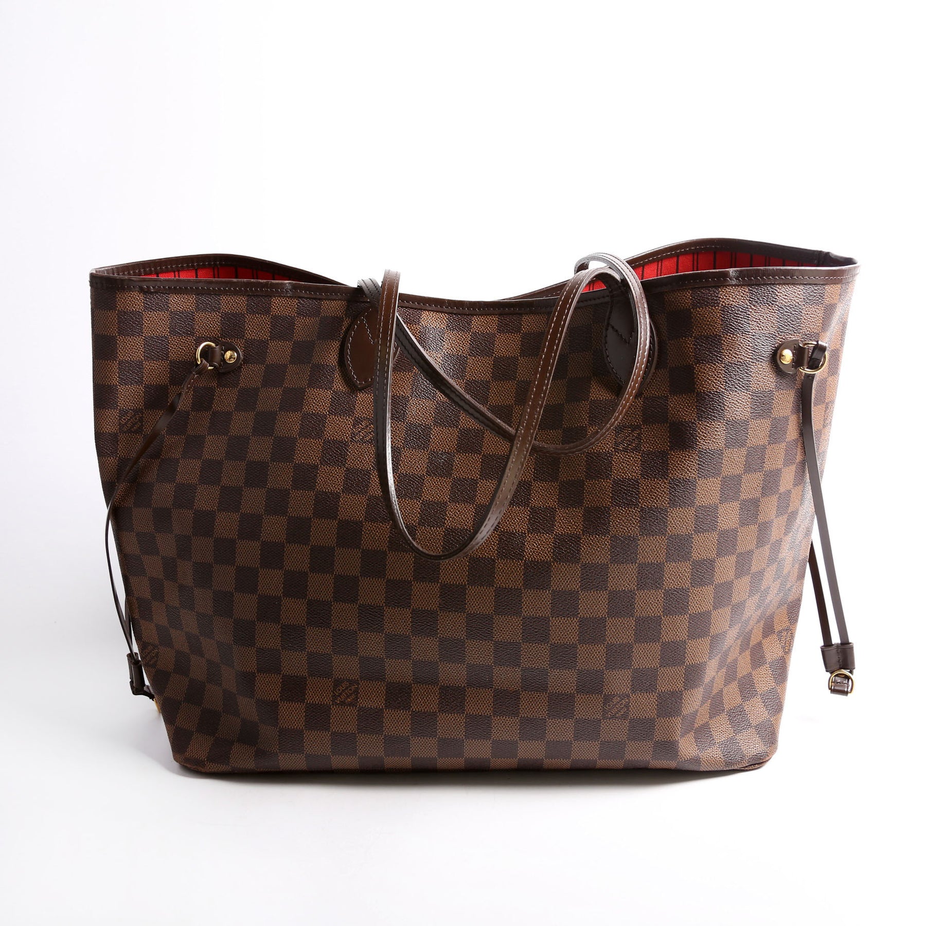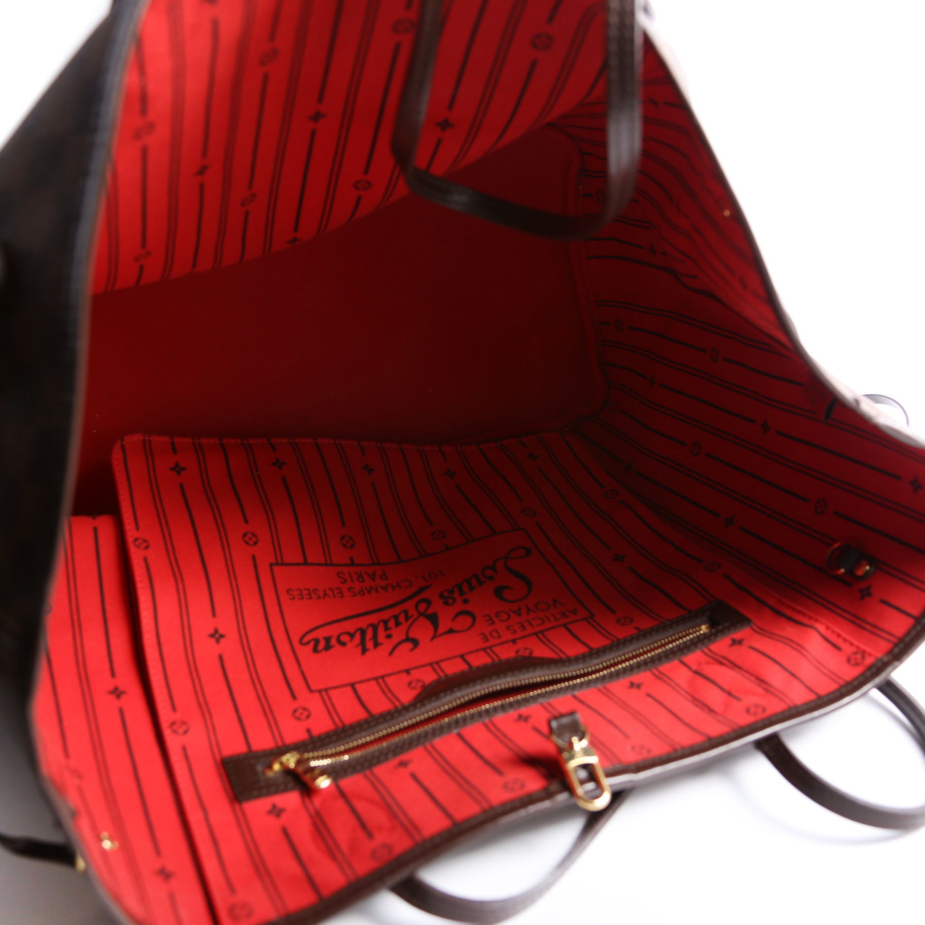 These pre-owned Louis Vuitton Neverfull GM are guaranteed 100% authentic. The exterior is in the classic Louis Vuitton Damier Ebene coated canvas.