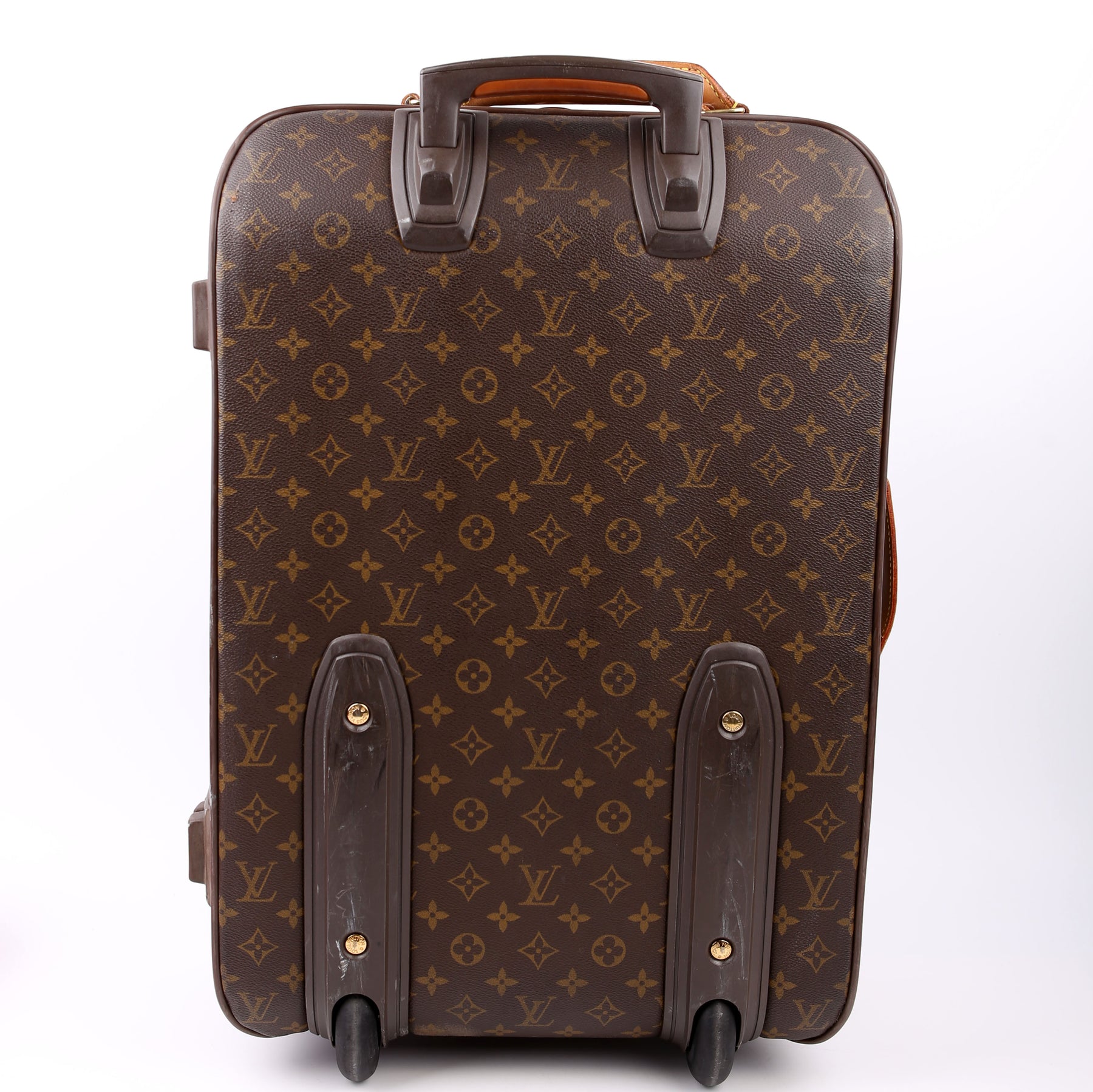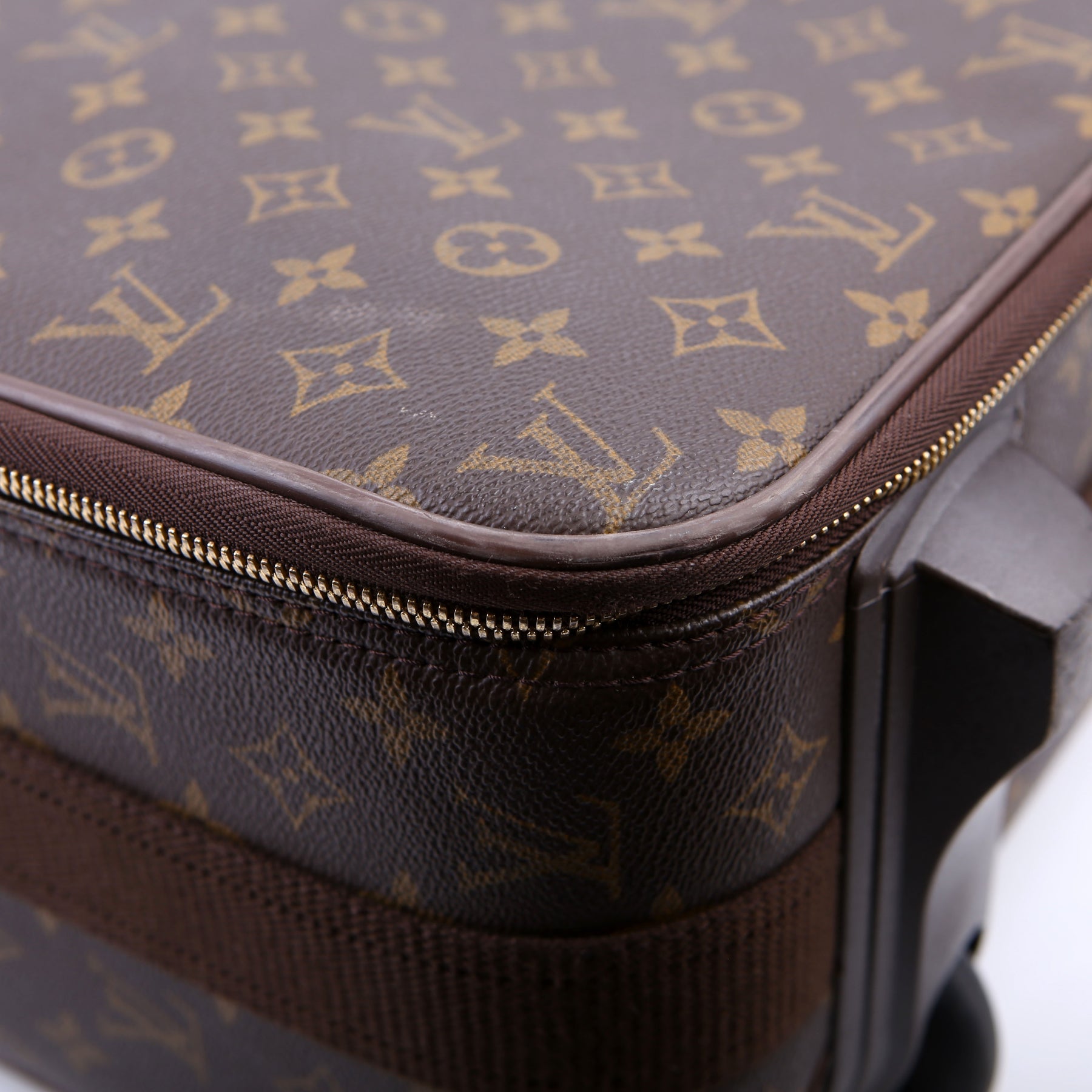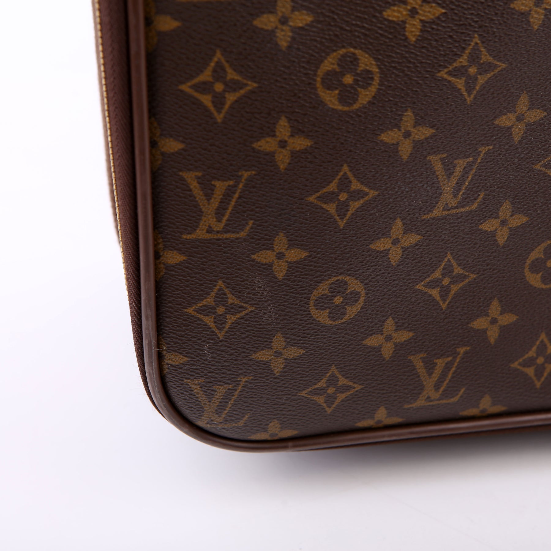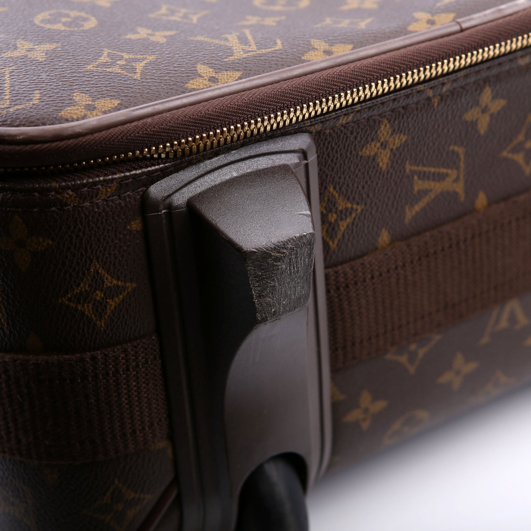 This pre-owned Louis Vuitton Pegase 55 is guaranteed 100% authentic. The exterior is in the classic Louis Vuitton Monogram coated canvas.
