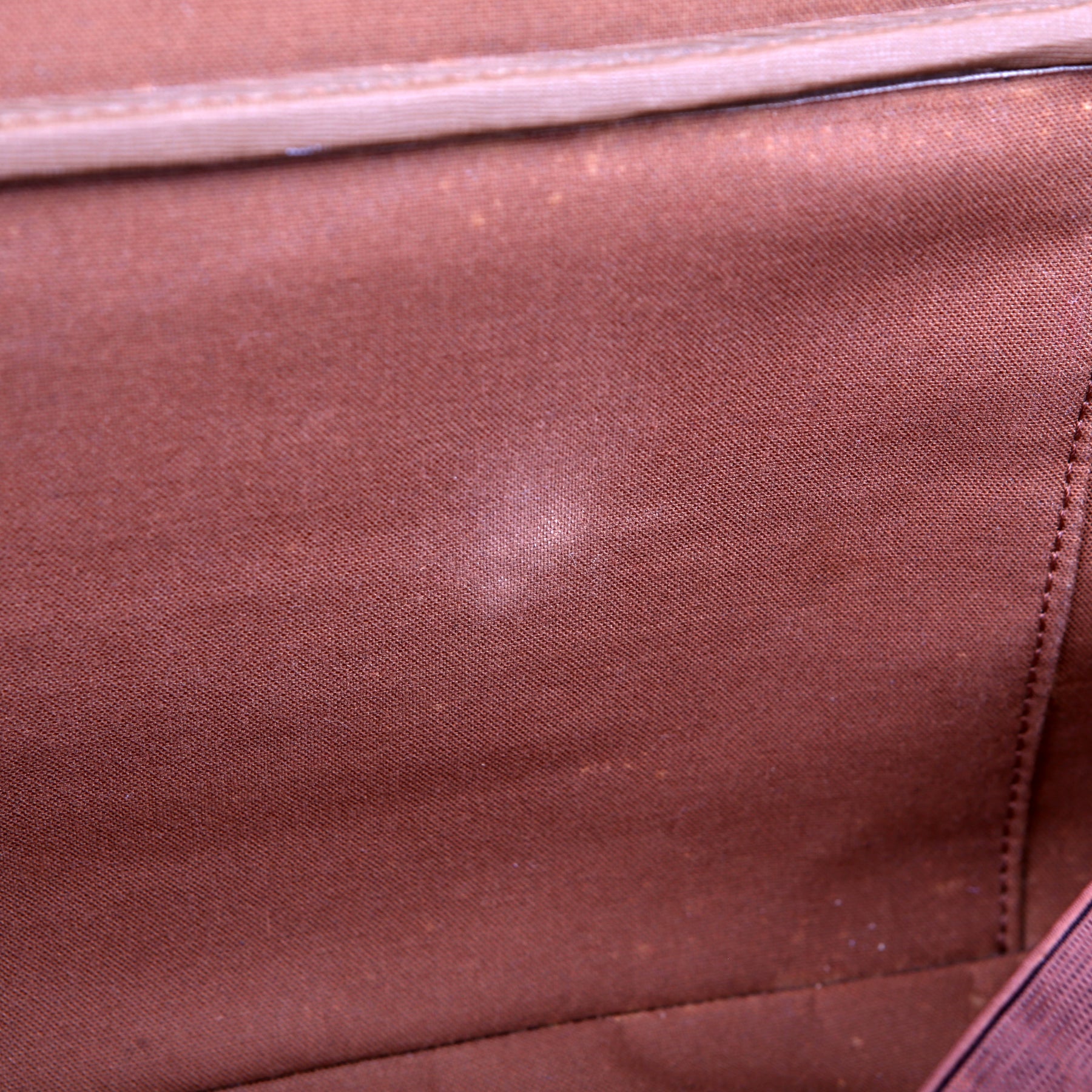 Exterior: The exterior has large scuffs and scratches throughout. There is minor discoloration throughout the coated canvas. The leather tabs show minor wear and discoloration. The exterior features one open pocket.