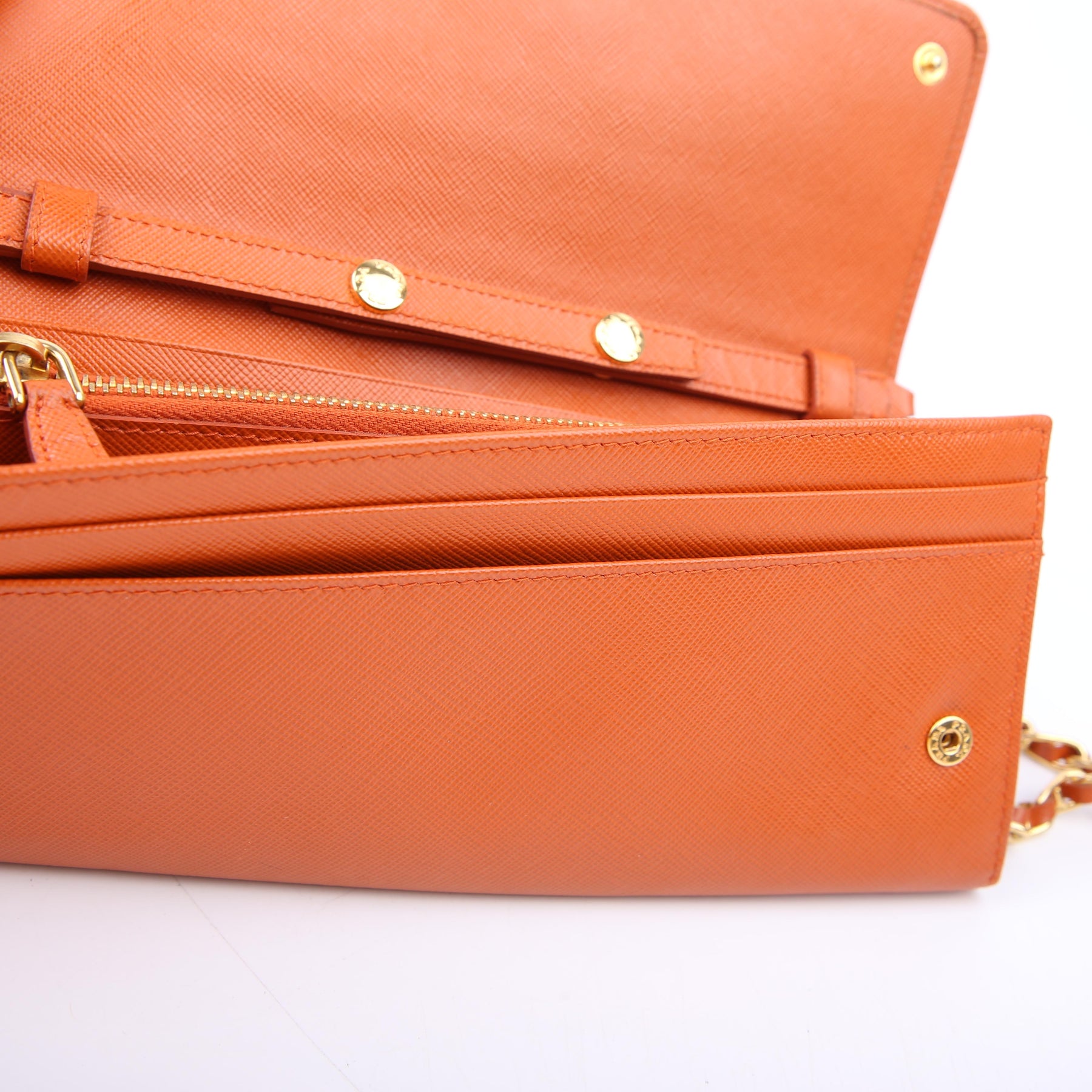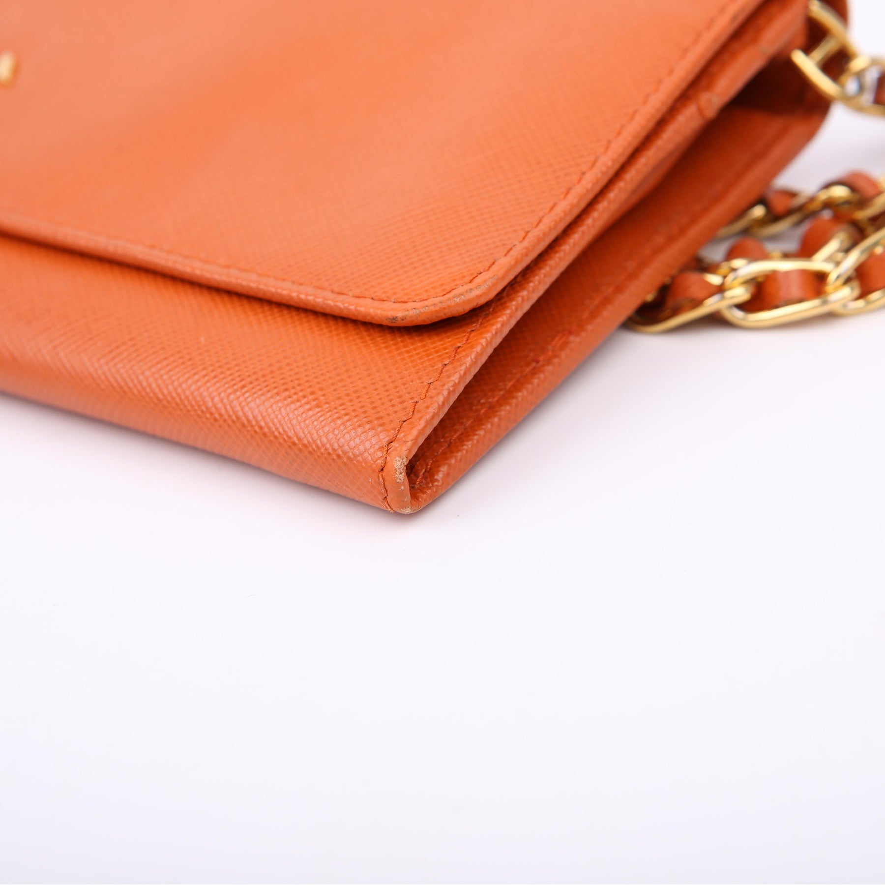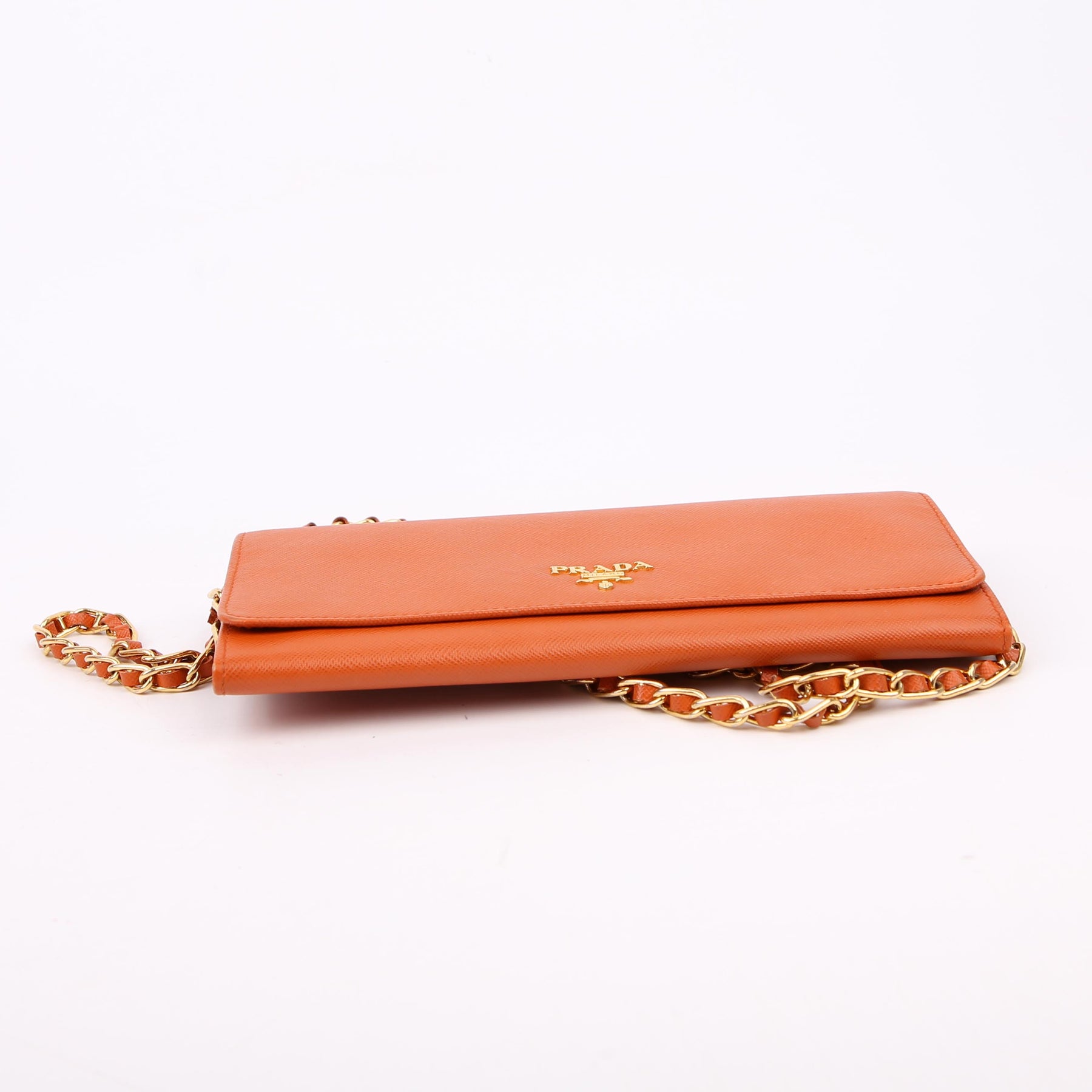 This pre-owned Prada Saffiano Oro Wallet On Chain is guaranteed 100% authentic. The exterior is in the classic Prada Saffiano leather.