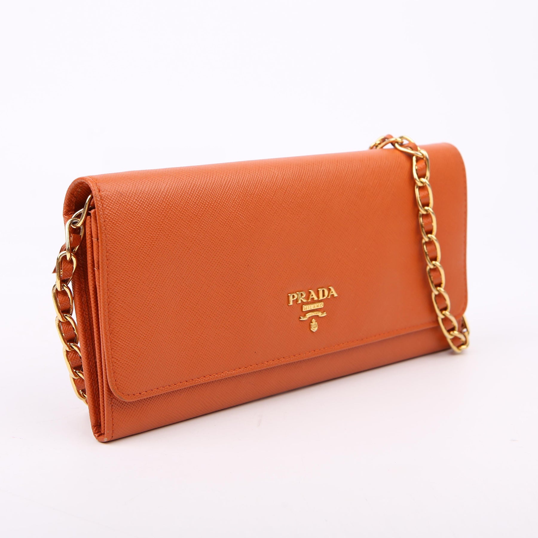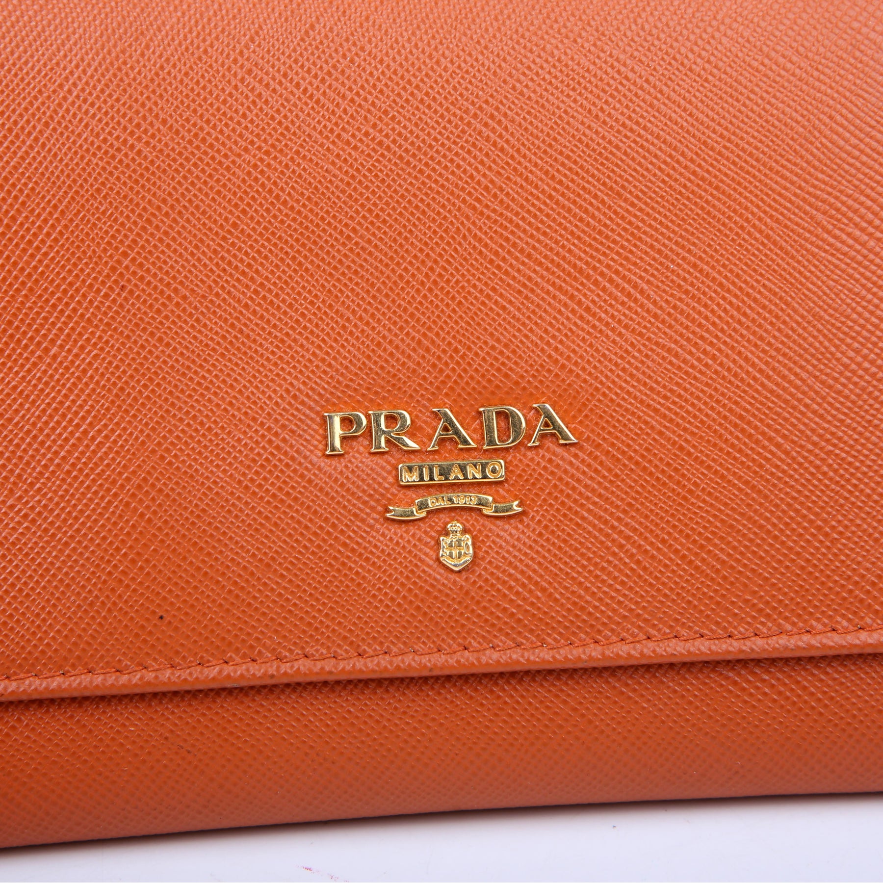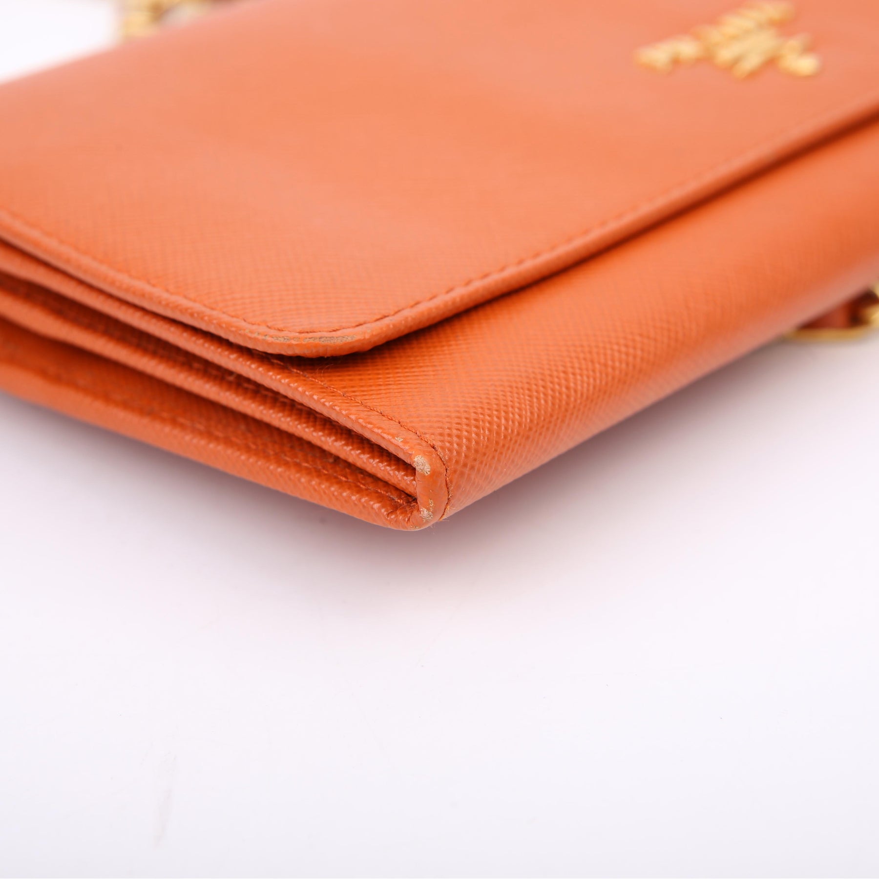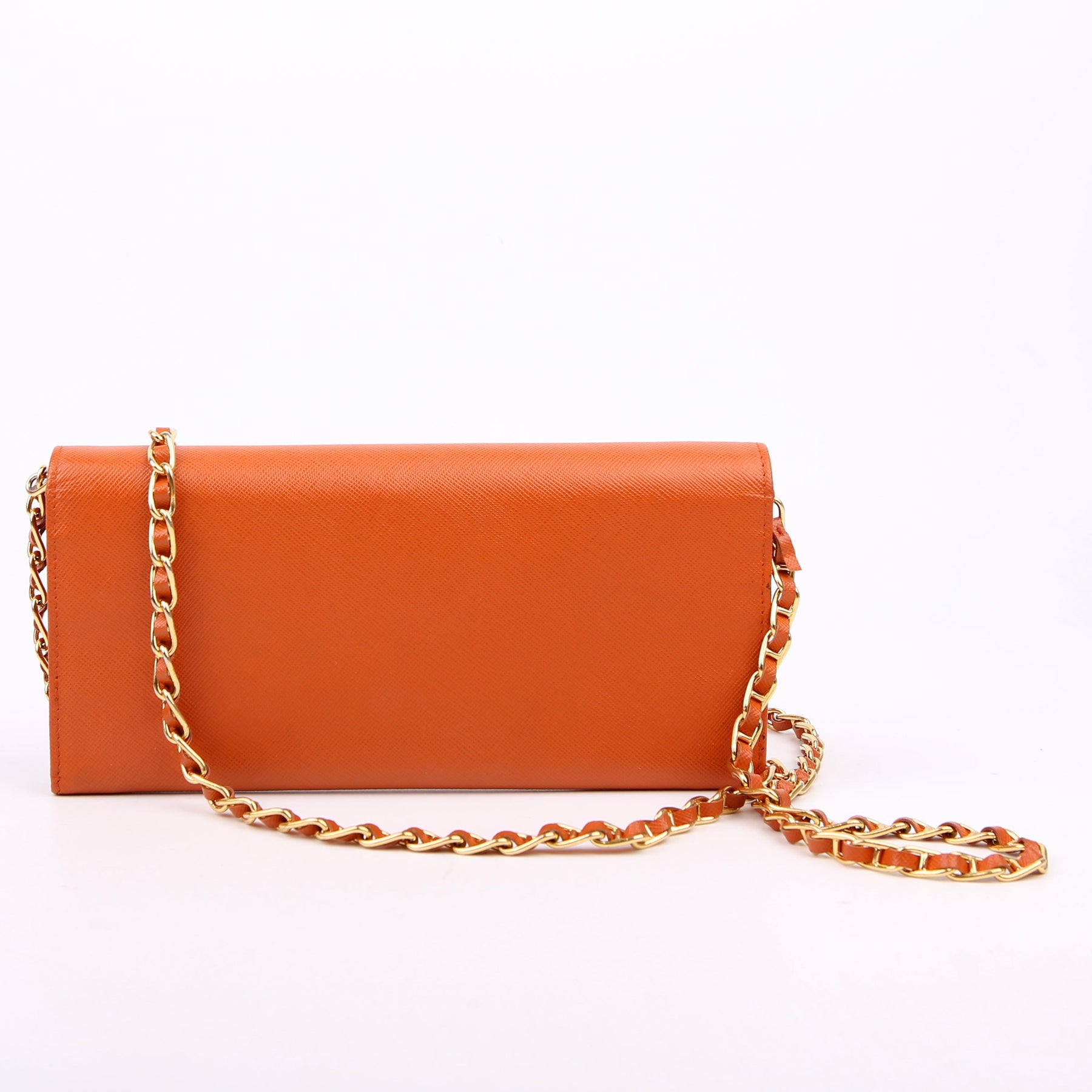 This pre-owned Prada Saffiano Oro Wallet On Chain is guaranteed 100% authentic. The exterior is in the classic Prada Saffiano leather.