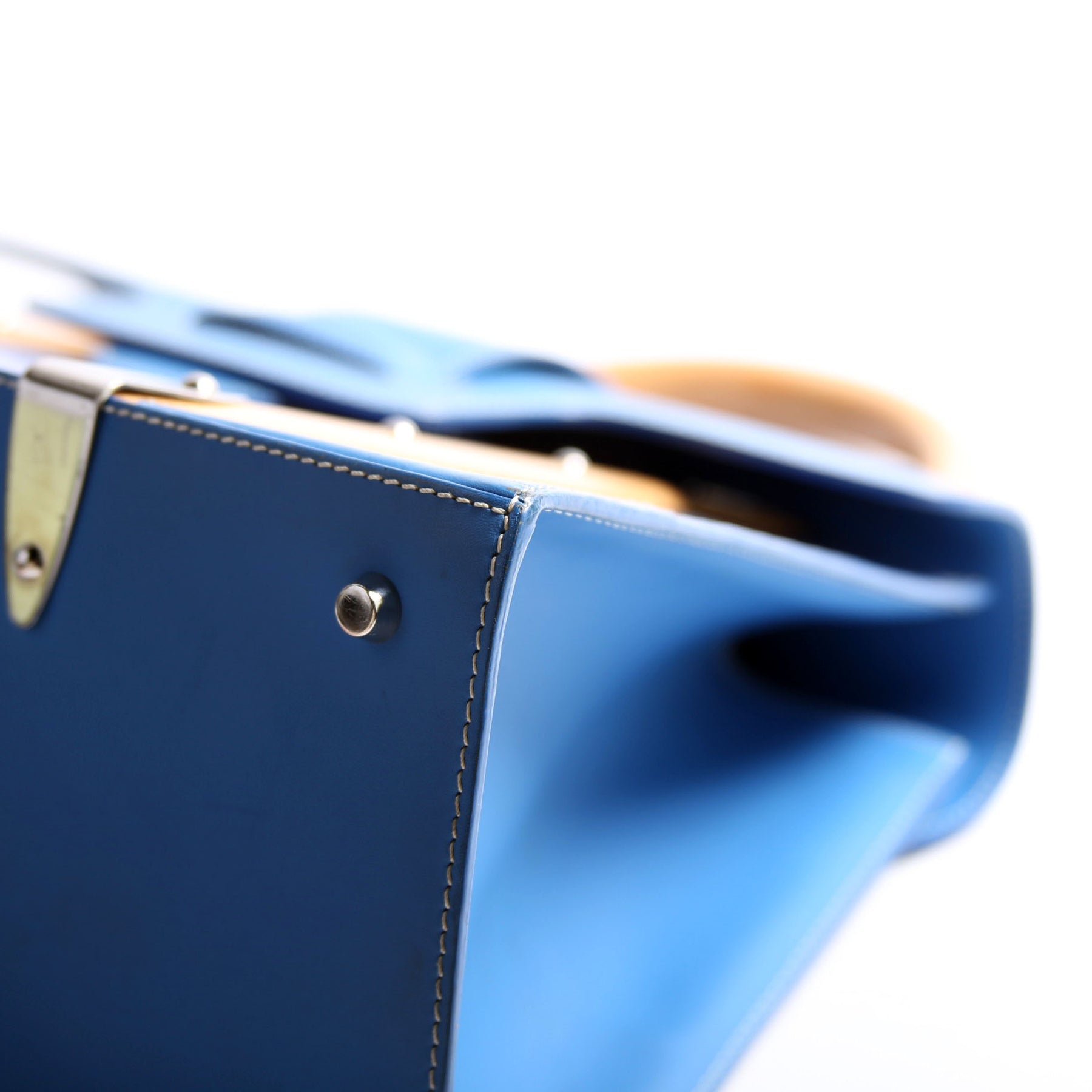 Exterior: The exterior shows wear throughout. There are scratches and scuff marks throughout. The leather tabs by the handles show missing paint and creasing. The corners also show rubbing.