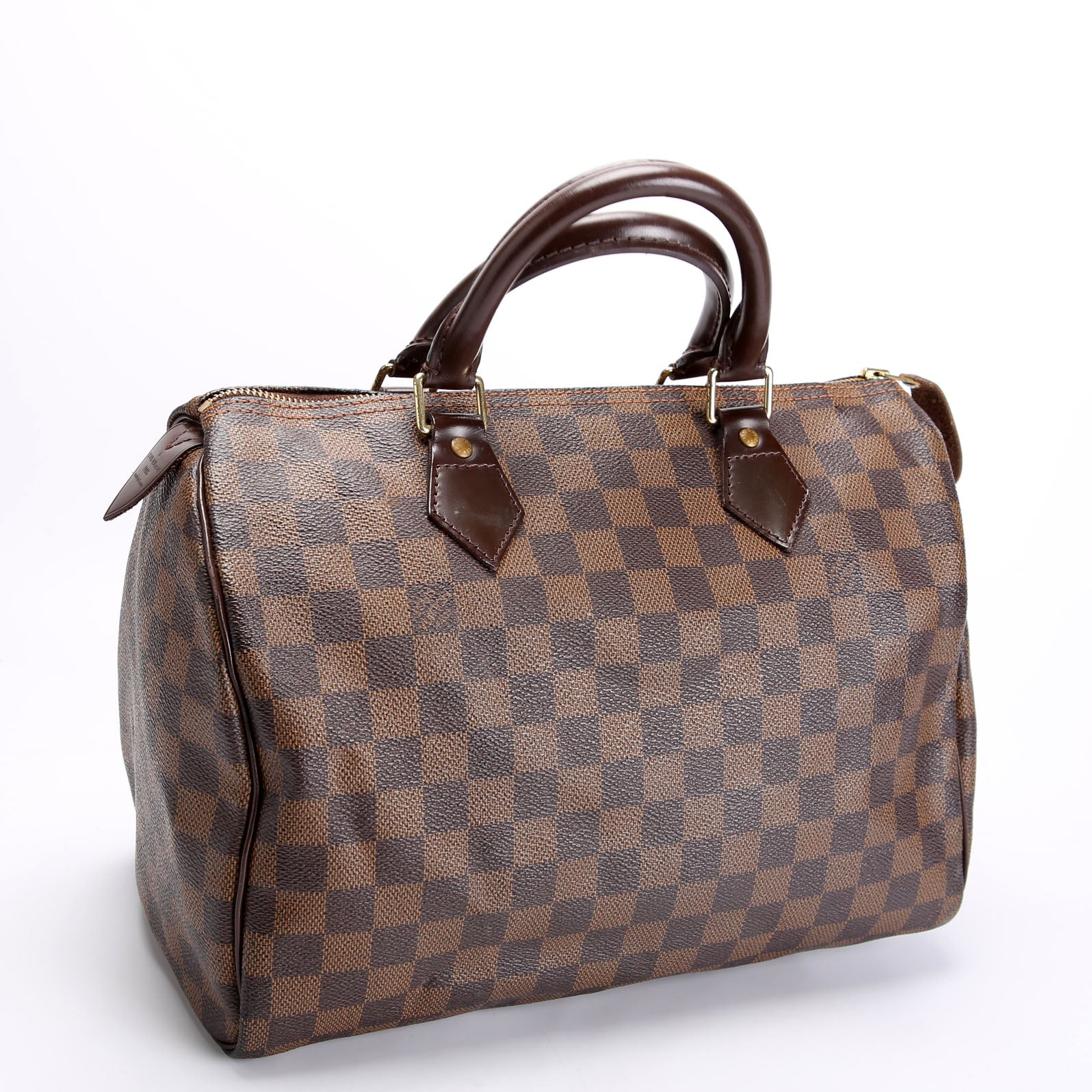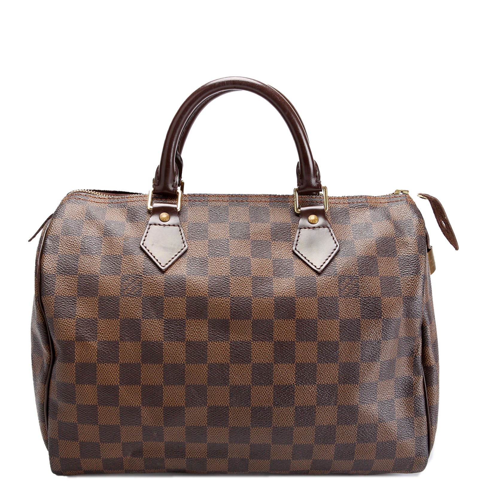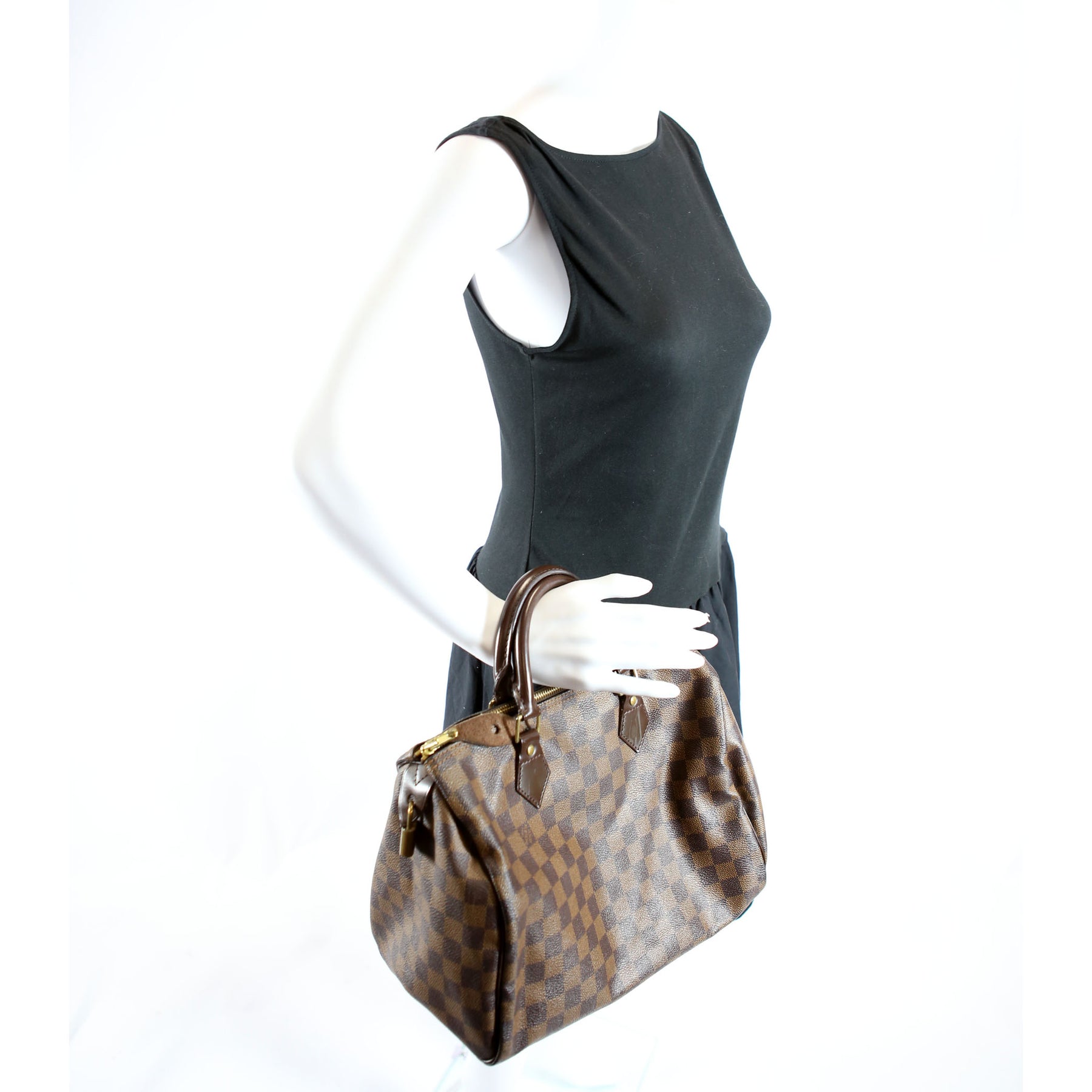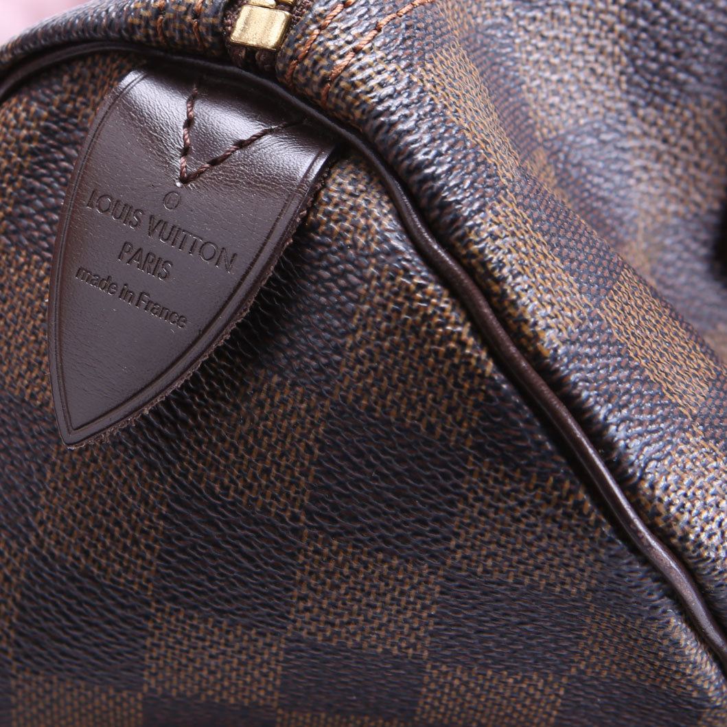 This pre-owned Louis Vuitton Speedy 30 is guaranteed 100% authentic. The exterior is in the classic Louis Vuitton Damier Ebene Coated Canvas.