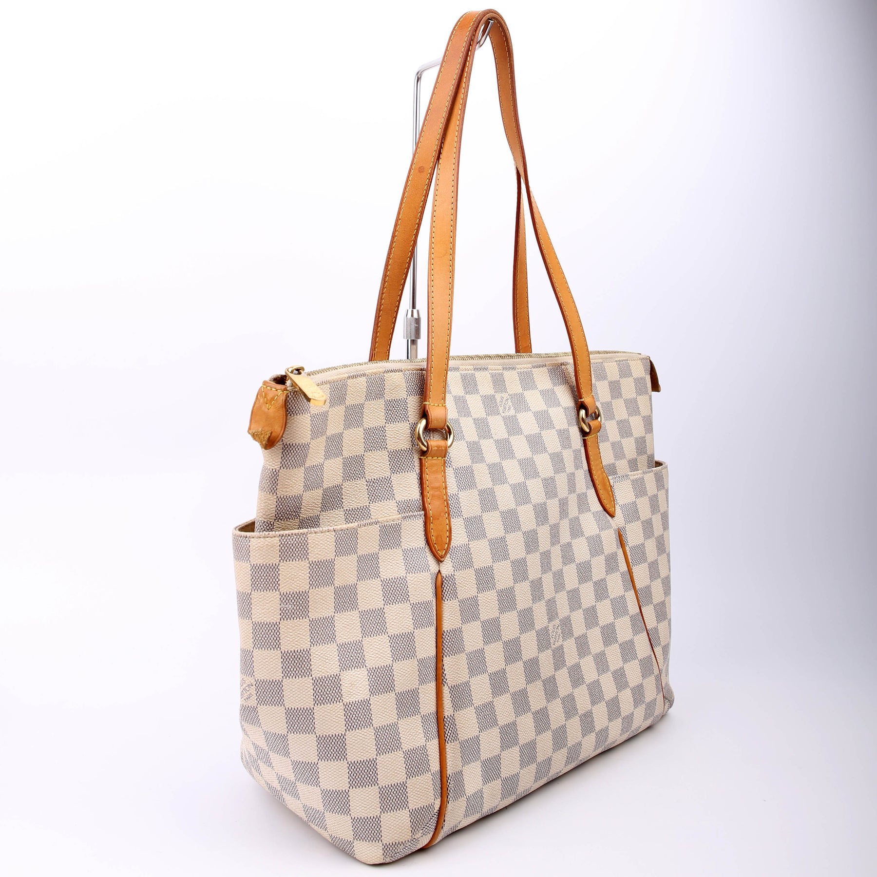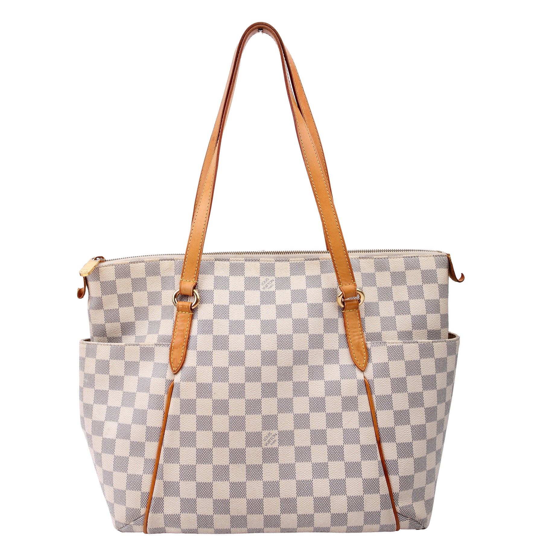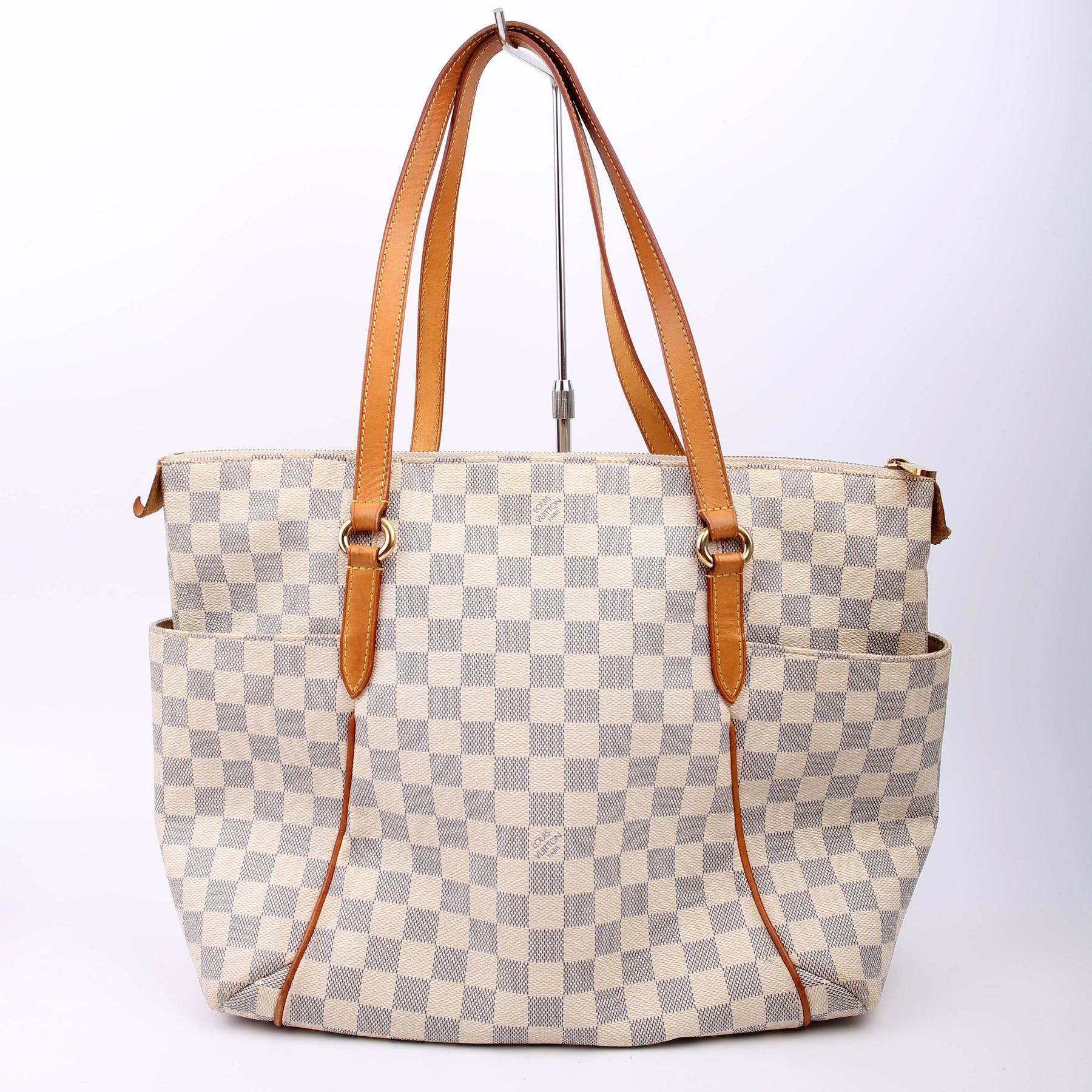 This pre-owned Louis Vuitton Totally MM is guaranteed 100% authentic. The exterior is in the classic Louis Vuitton Damier Azur coated canvas.