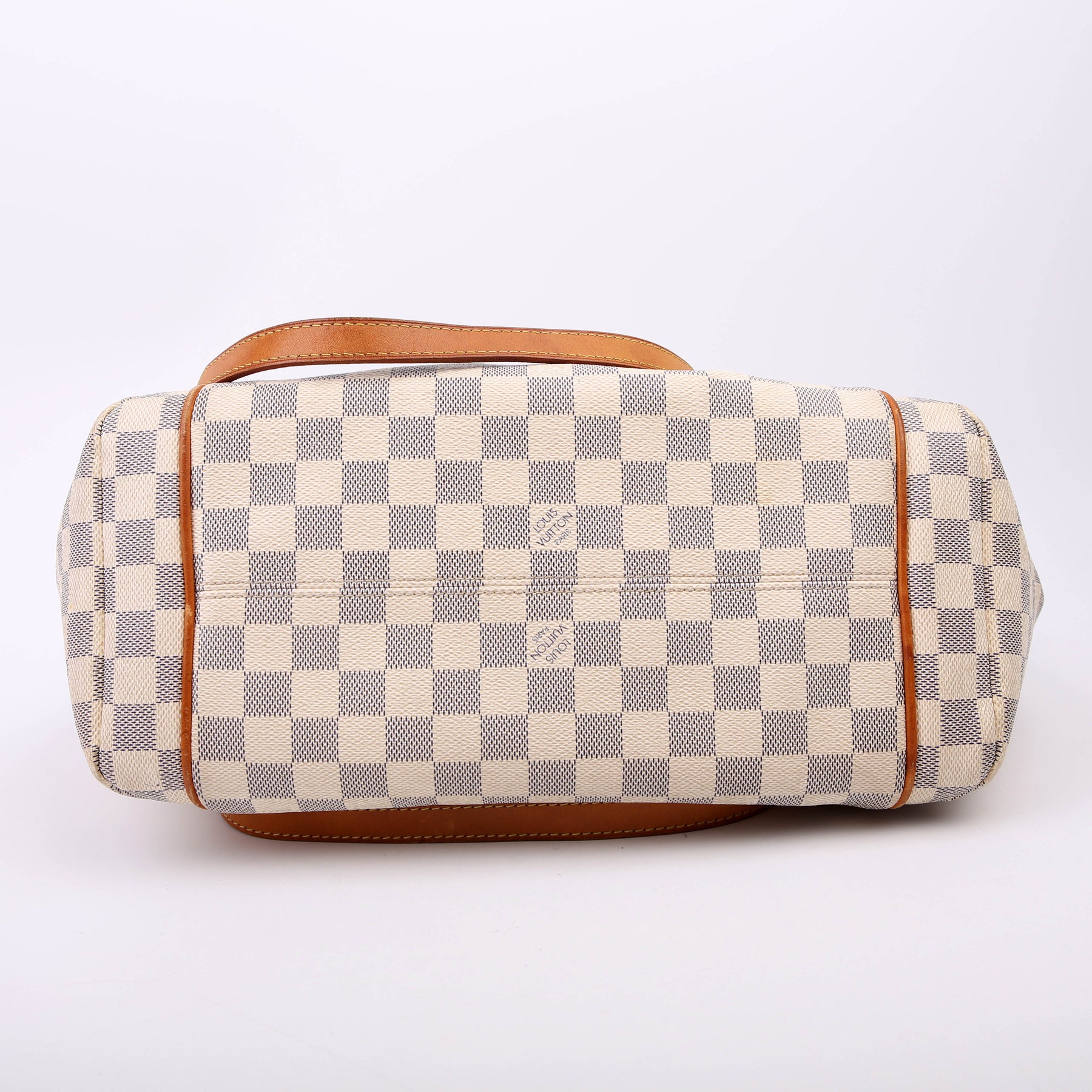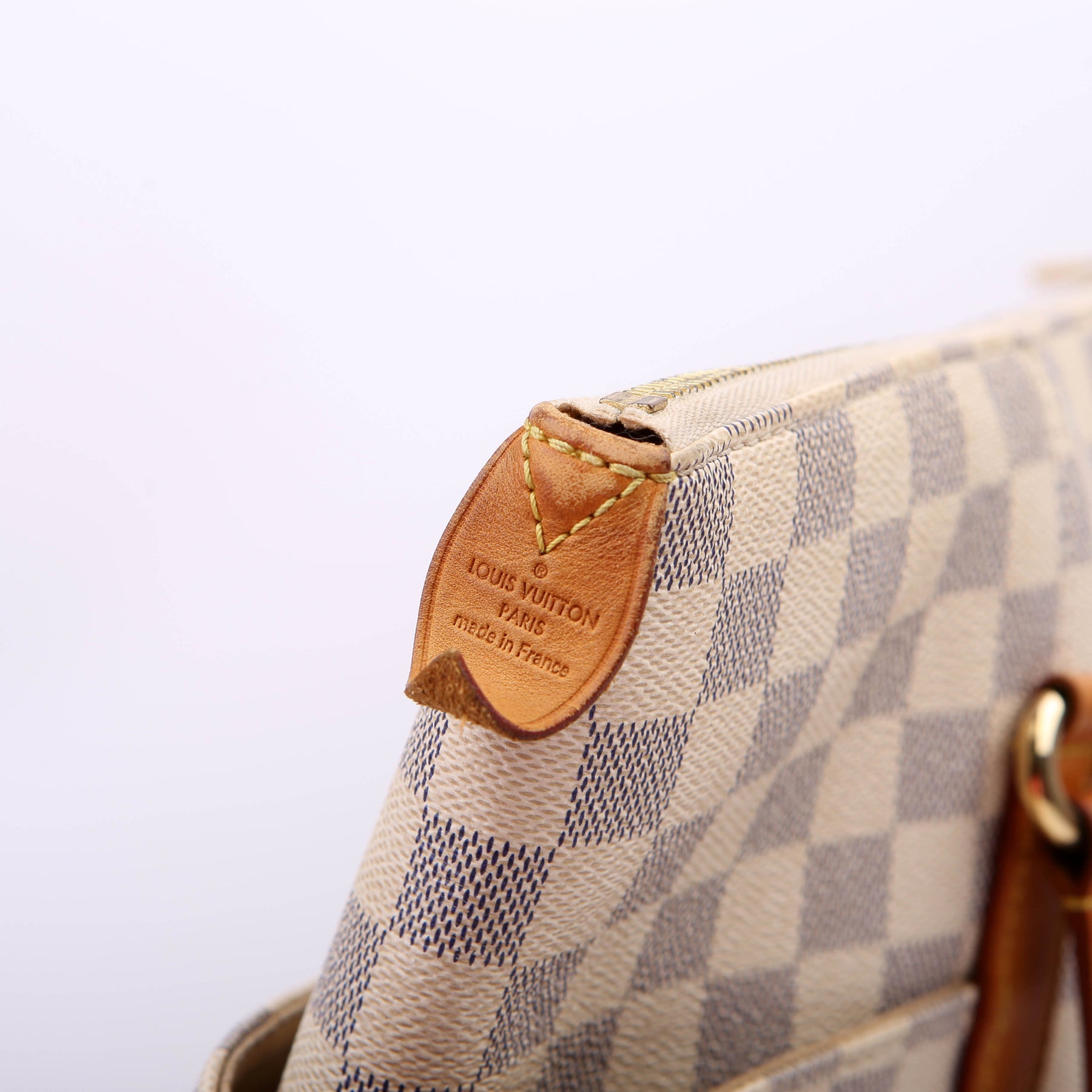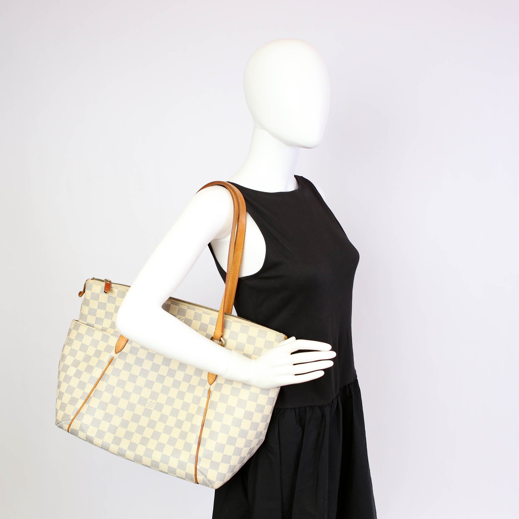 This pre-owned Louis Vuitton Totally MM is guaranteed 100% authentic. The exterior is in the classic Louis Vuitton Damier Azur coated canvas.