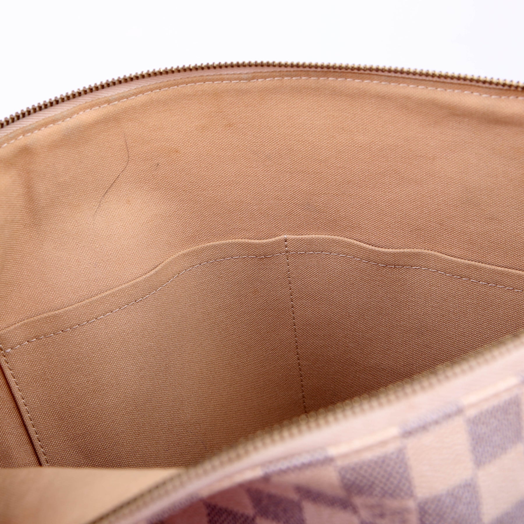 Hardware: The zipper operates properly and runs smoothly. The hardware shows minor wear and discoloration.