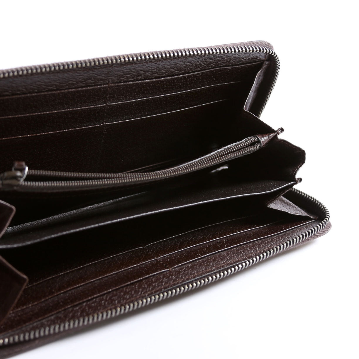 Interior: The interior is free from wear. It features twelve card slots, three open sections, and one zip closure pocket.