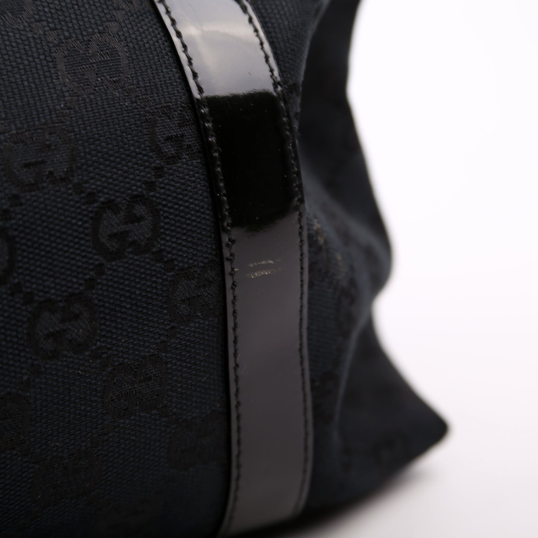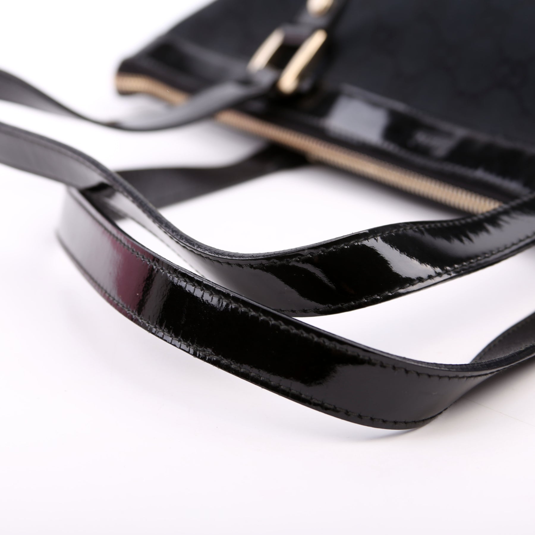 Exterior: The exterior canvas is free of any rips or cracks. The patent leather has minor scratches.