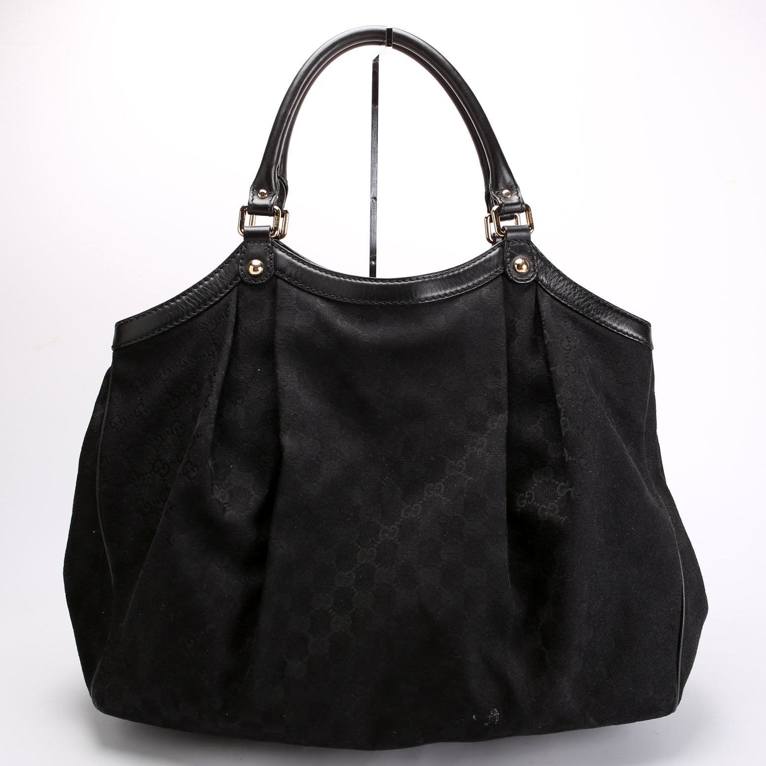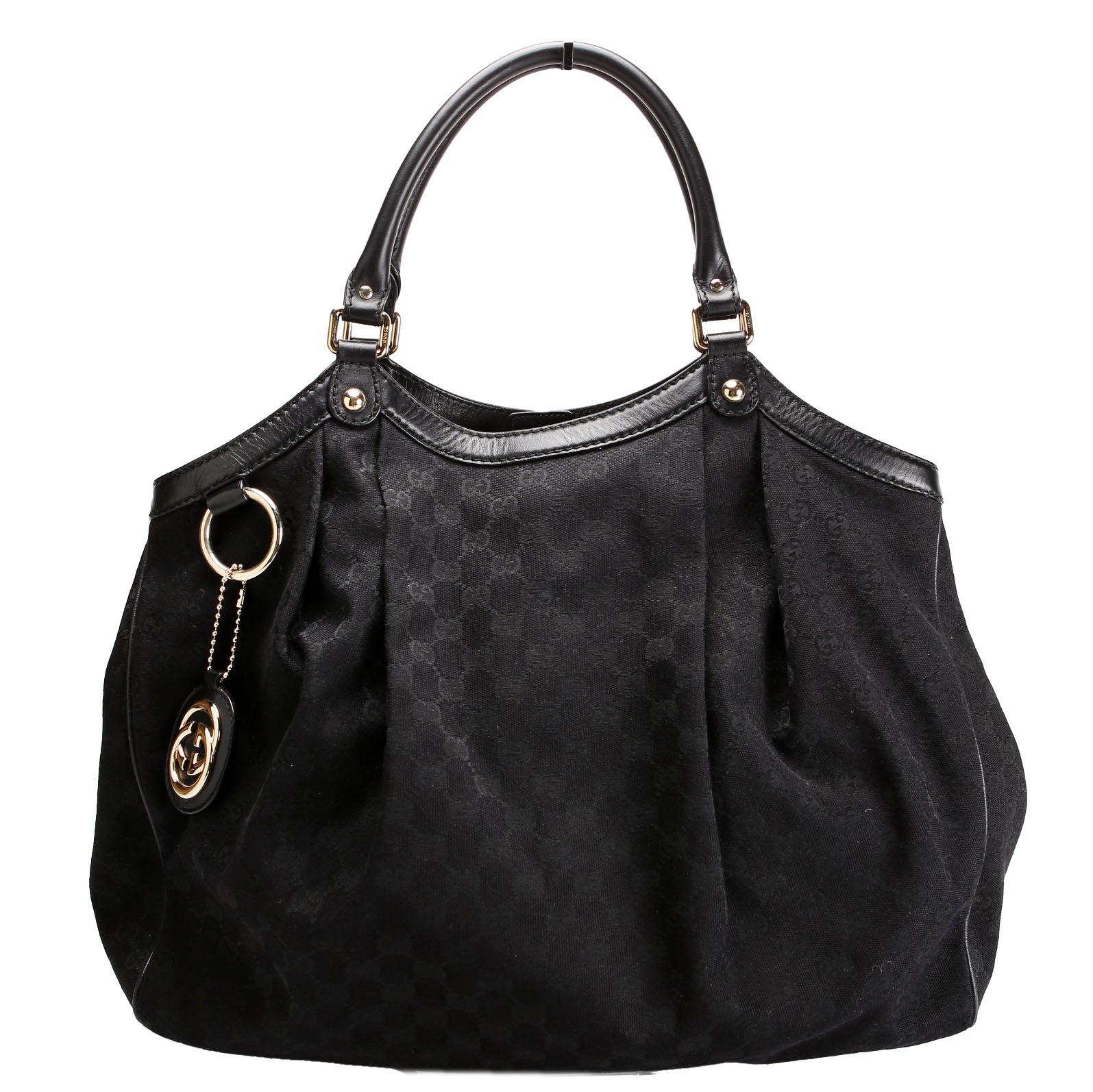 This pre-owned Gucci 211943 Sukey GG Canvas Large is guaranteed 100% authentic. The exterior is in the classic Gucci GG canvas material.