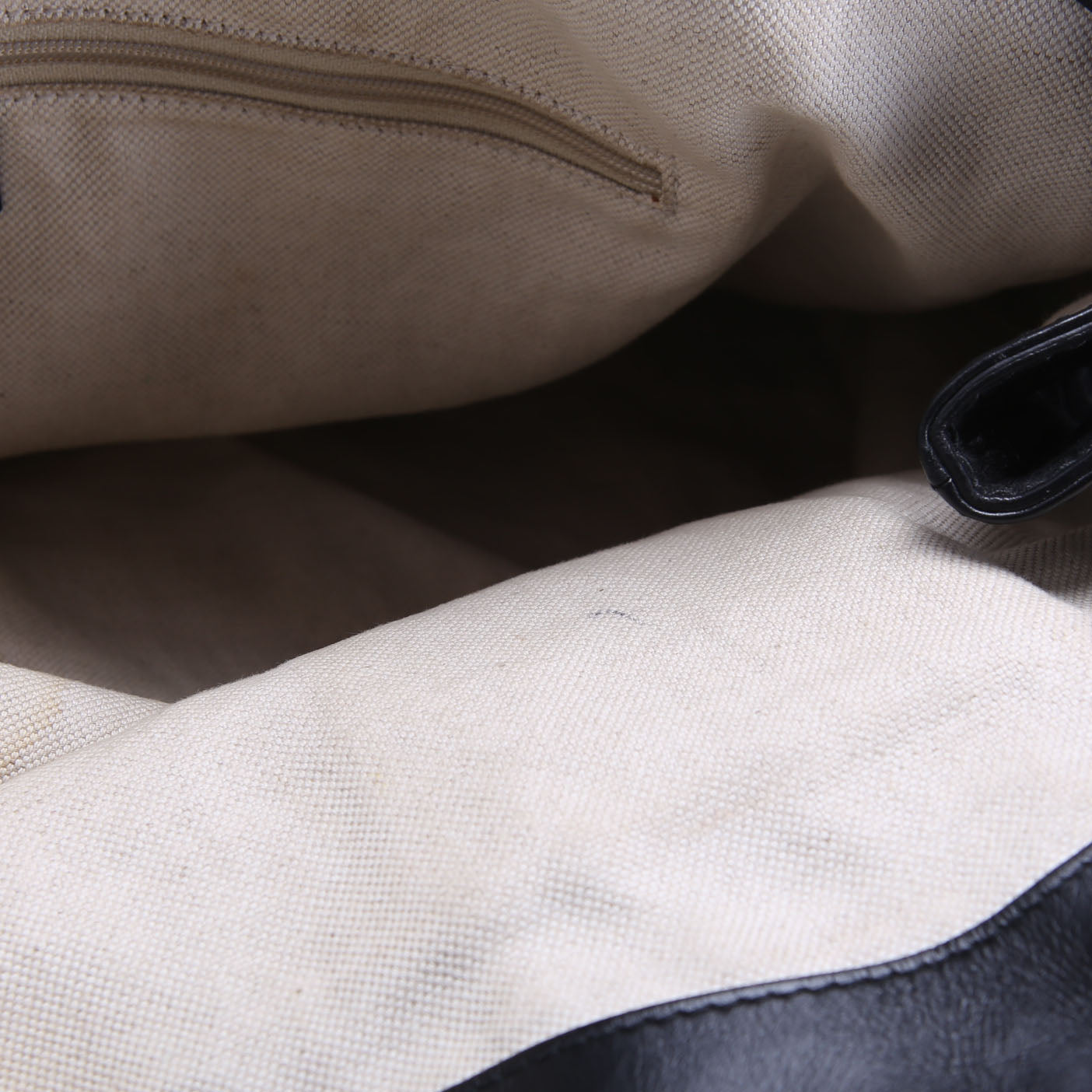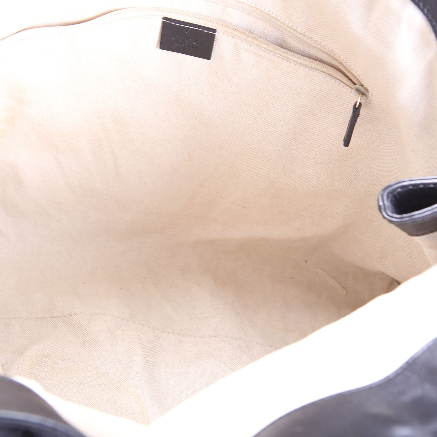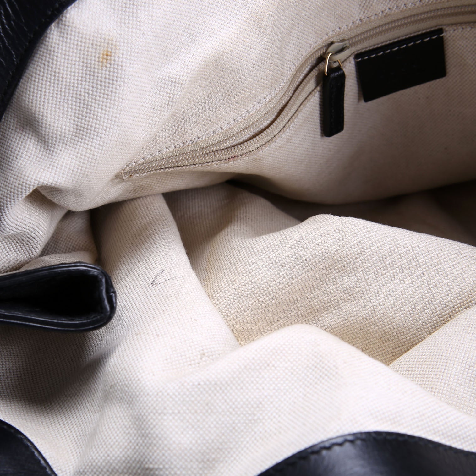 Interior: The interior has staining as pictured. The interior has one zipper pocket.
