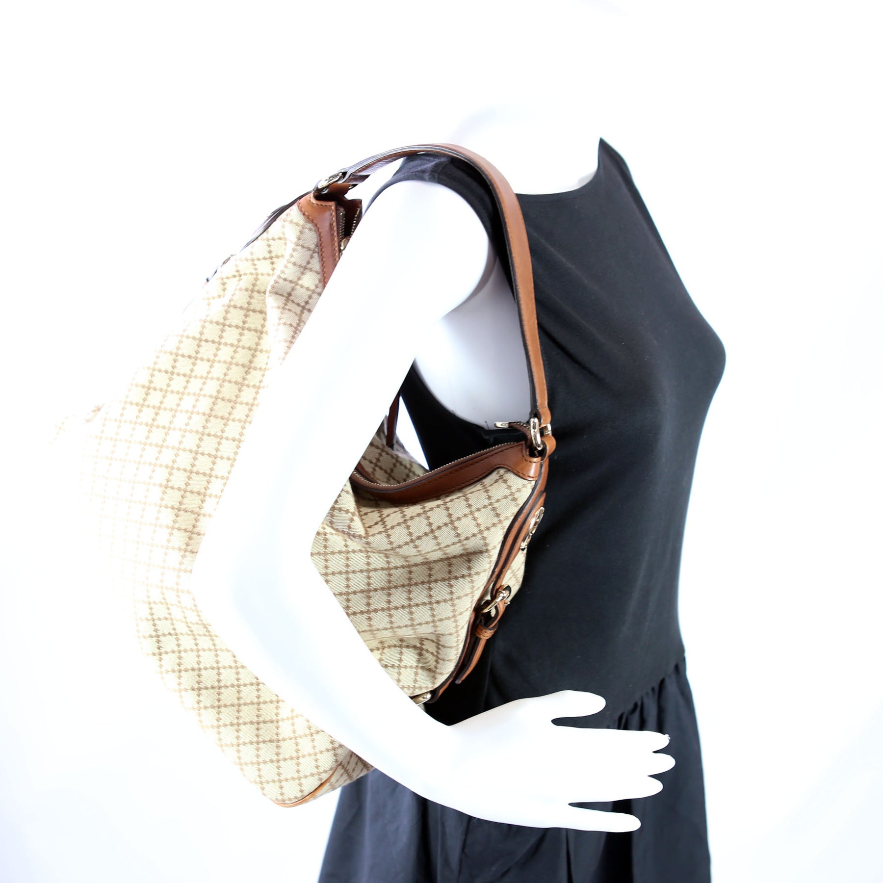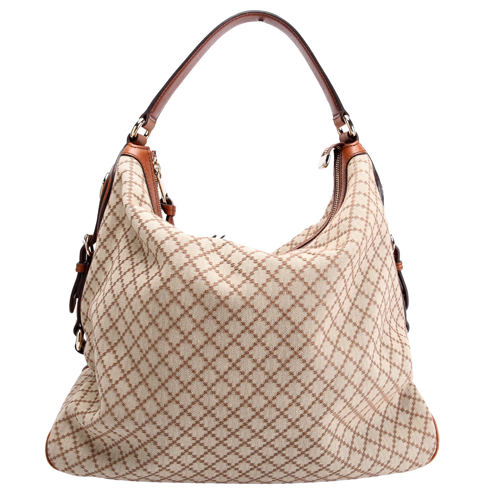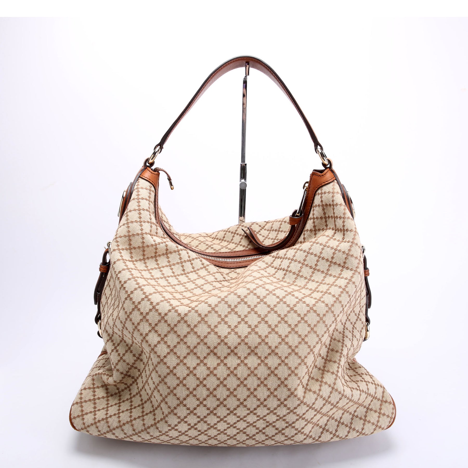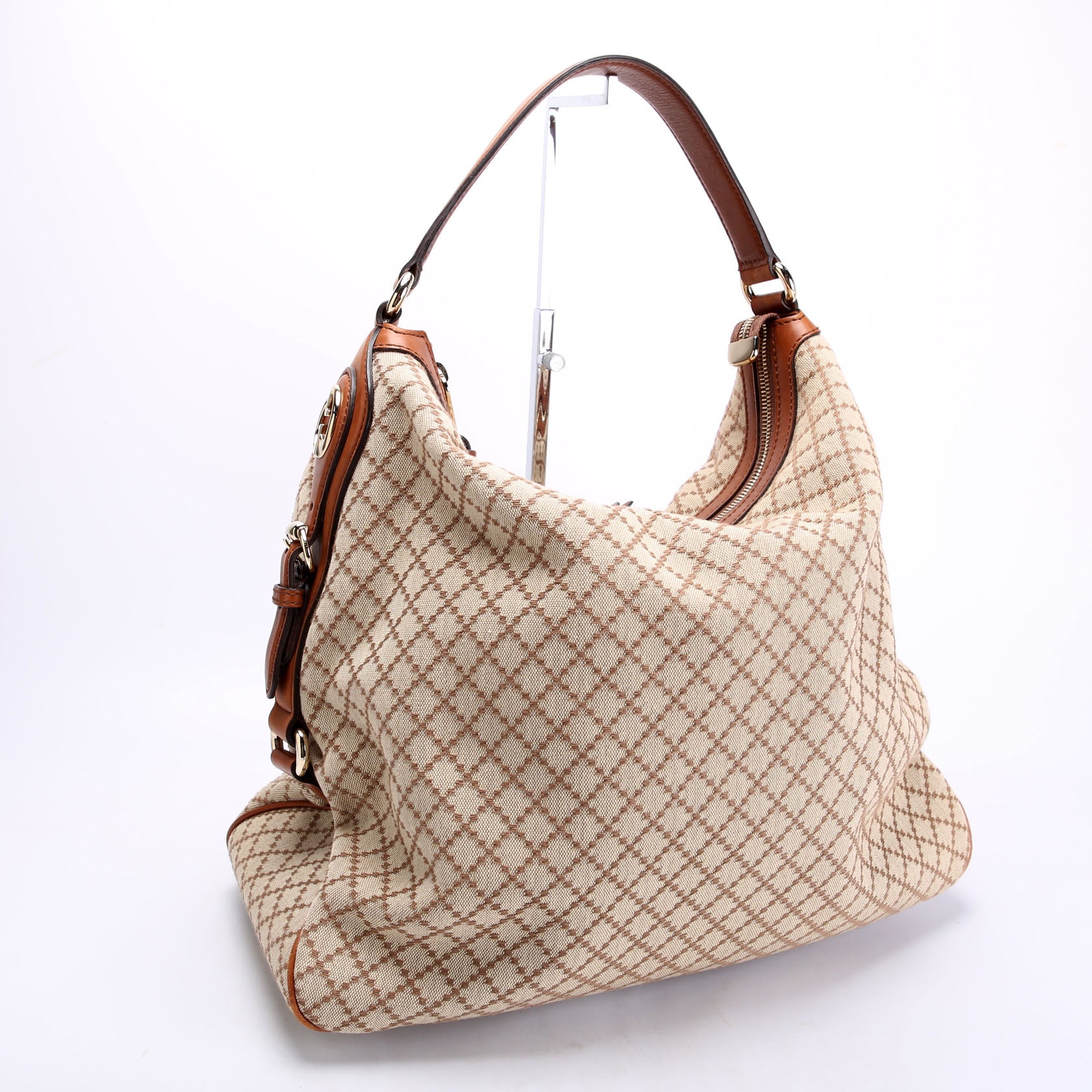 This pre-owned Gucci Diamante Hobo is guaranteed 100% authentic. The exterior is in the classic Gucci Canvas..