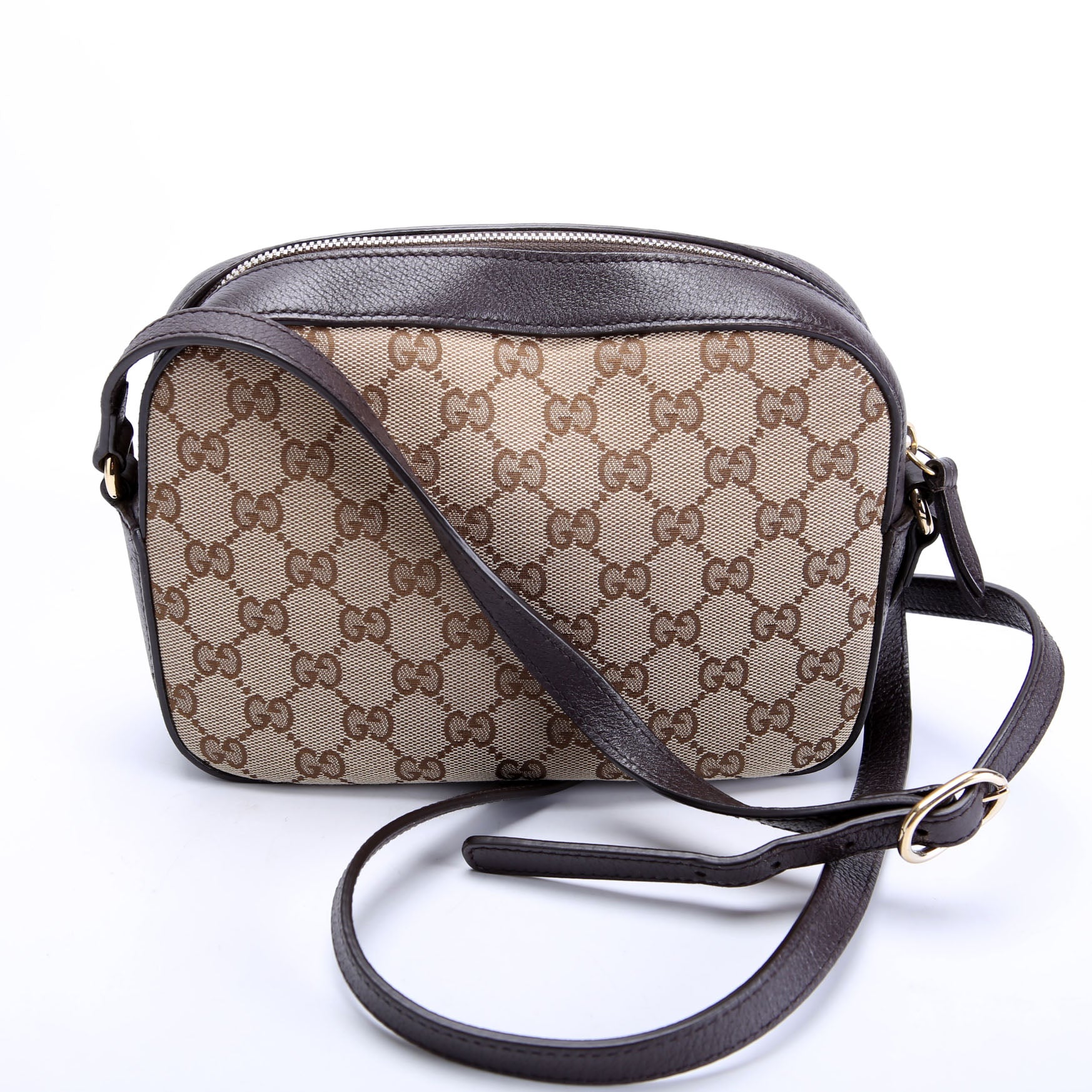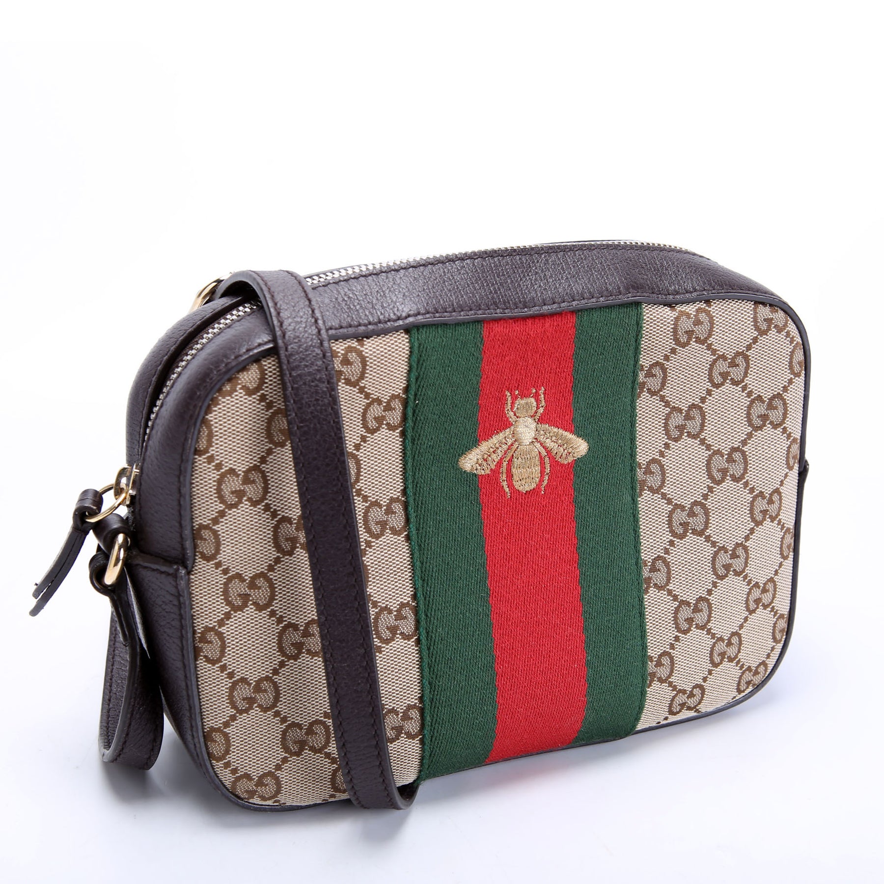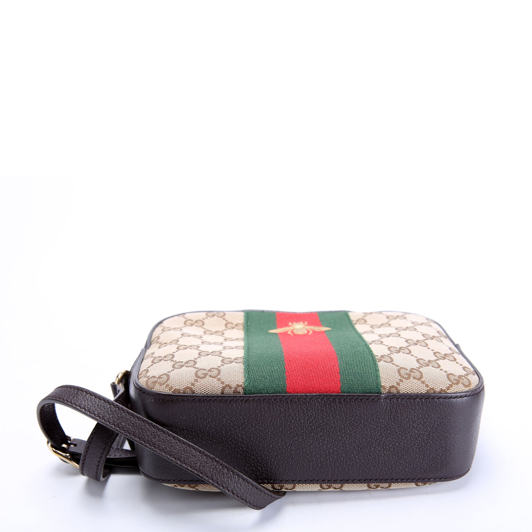 This pre-owned Gucci Bee Camera Bag is guaranteed 100% authentic. The exterior is in the Gucci GG Canvas.