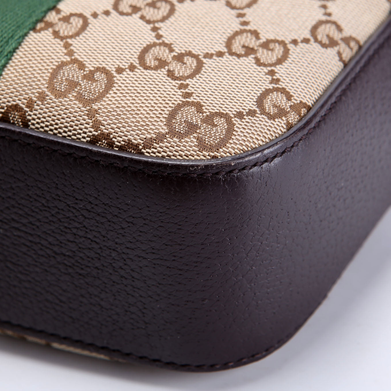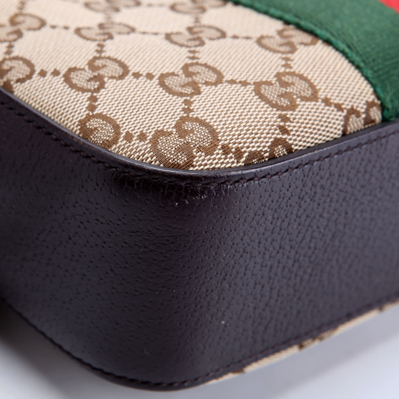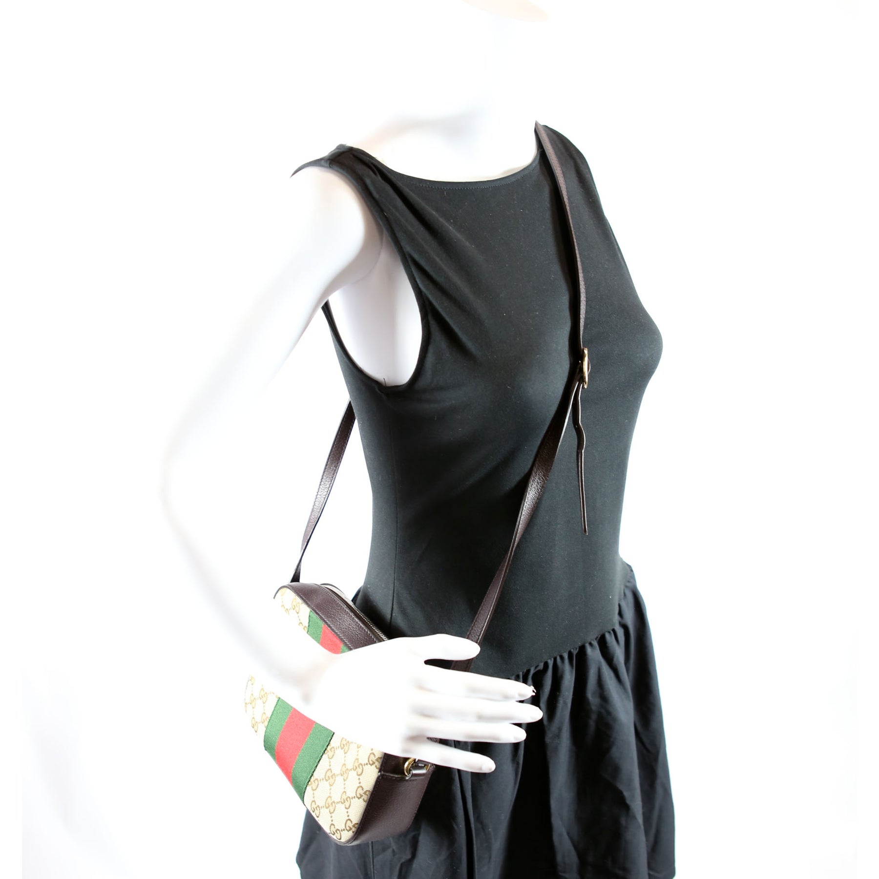 This pre-owned Gucci Bee Camera Bag is guaranteed 100% authentic. The exterior is in the Gucci GG Canvas.