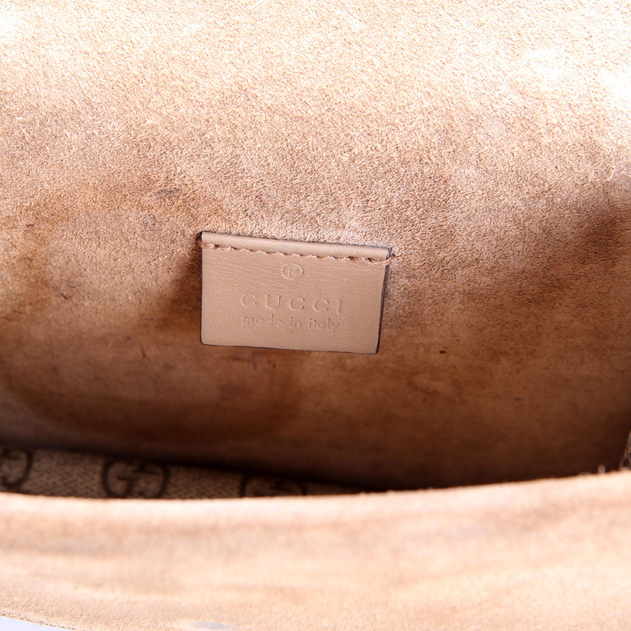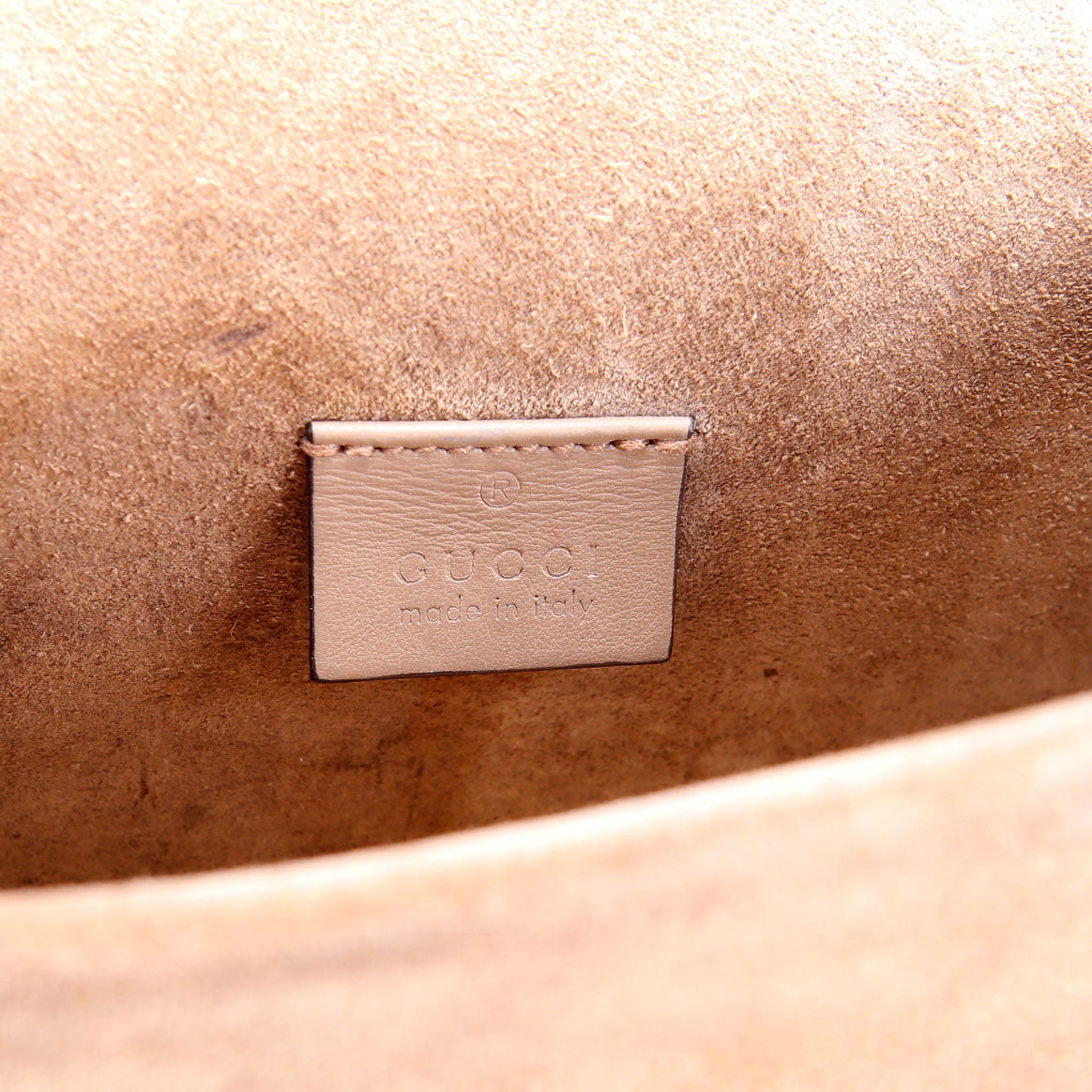 Interior: The interior shows minor stain throughout the suede and features one open pocket.