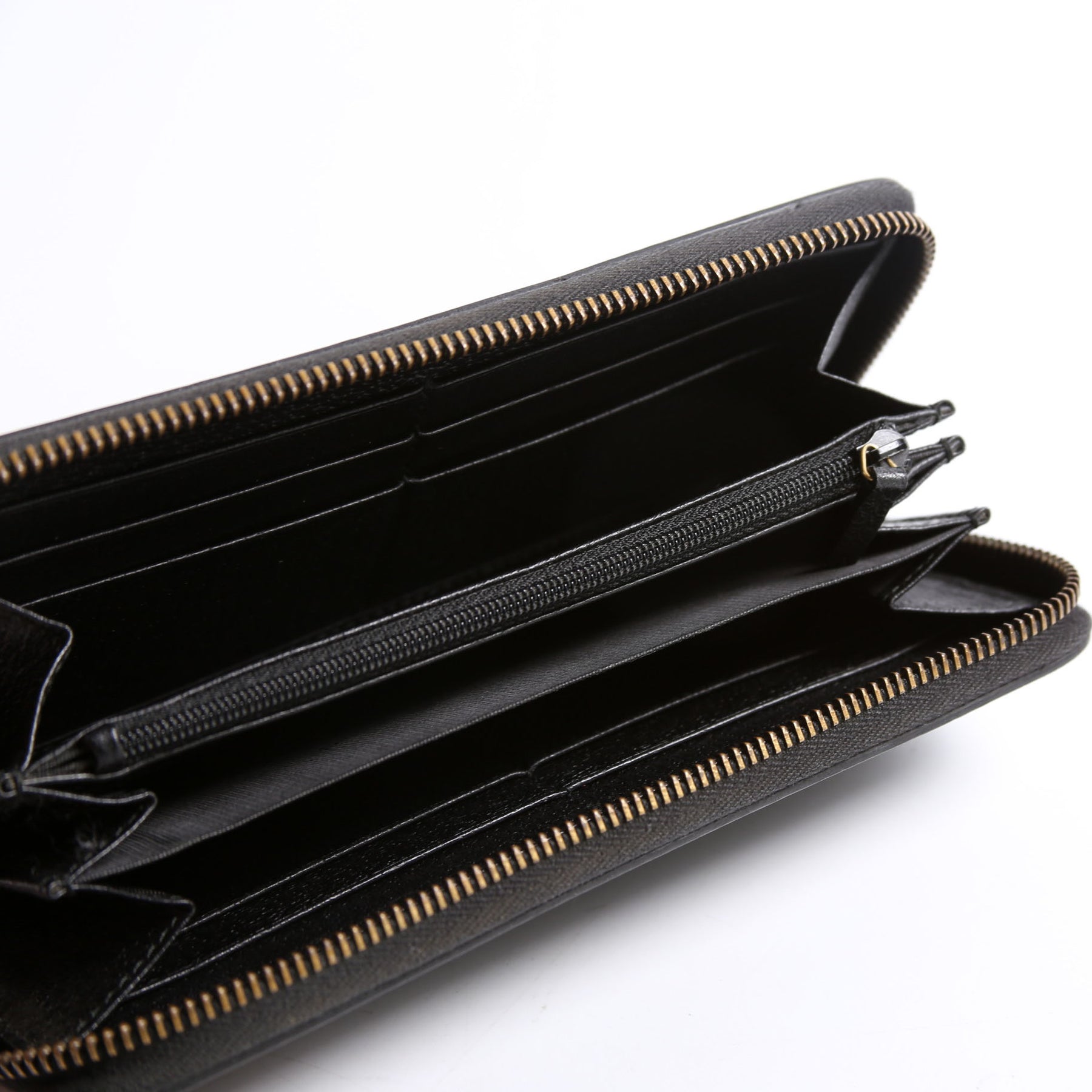 Interior: Free of major wear and features three bill slots, twelve card slots, and one zip closure coin pouch.