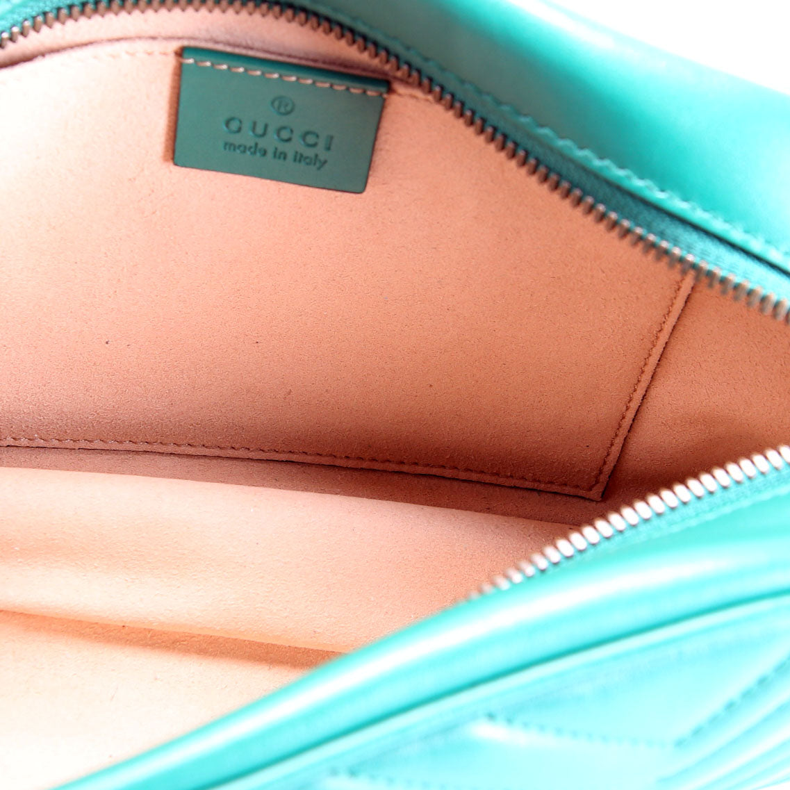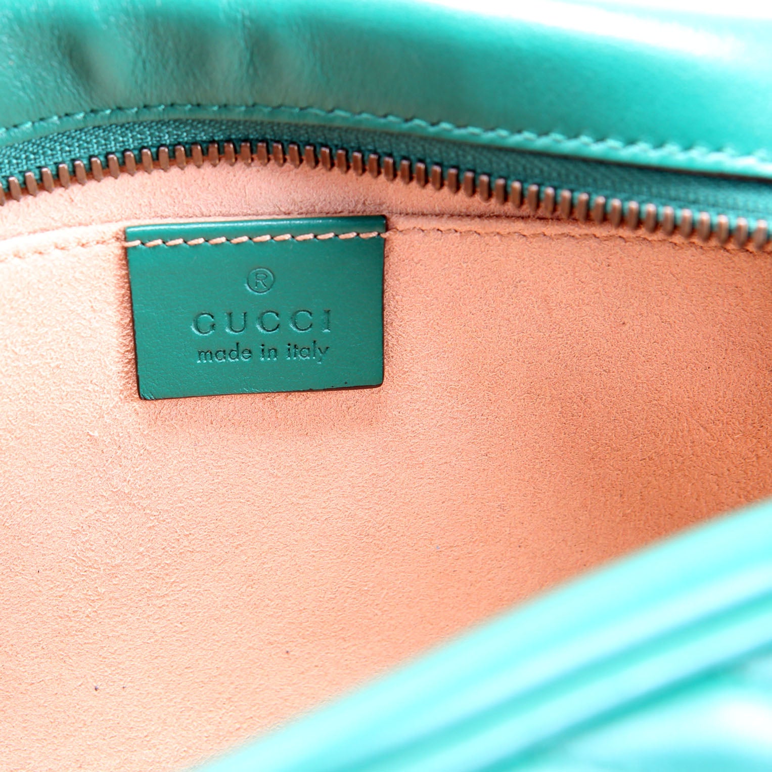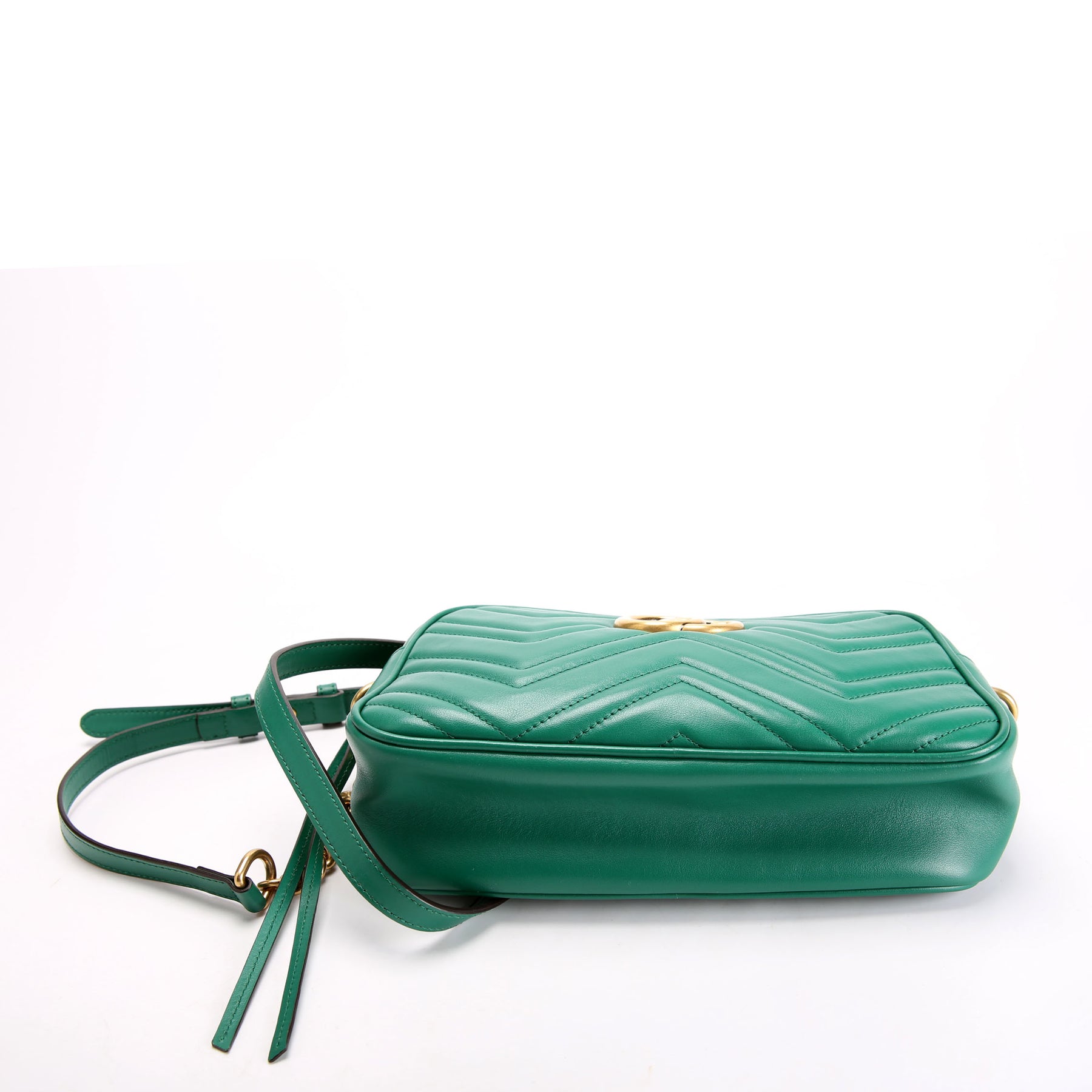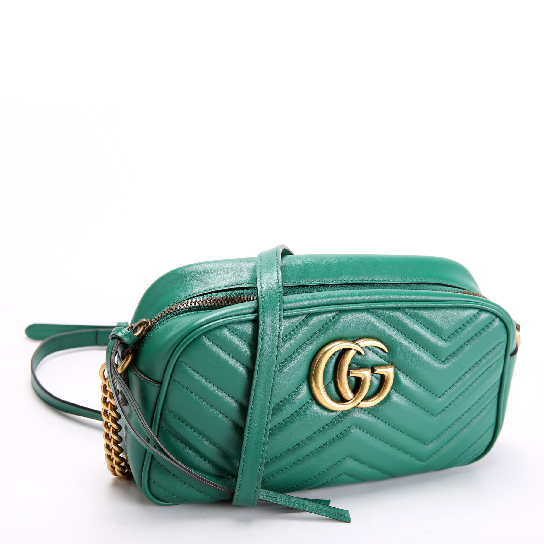 This pre-owned Gucci Small Leather Camera Bag is guaranteed 100% authentic. The exterior is in the classic Gucci Marmont Leather.