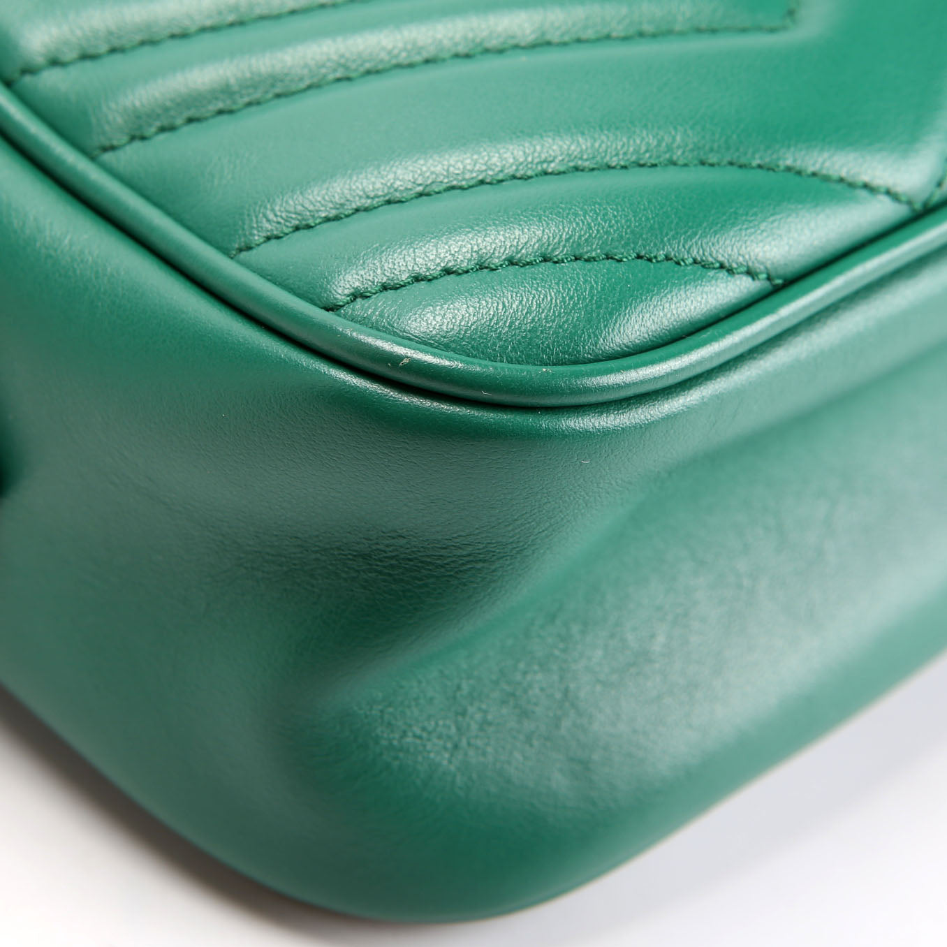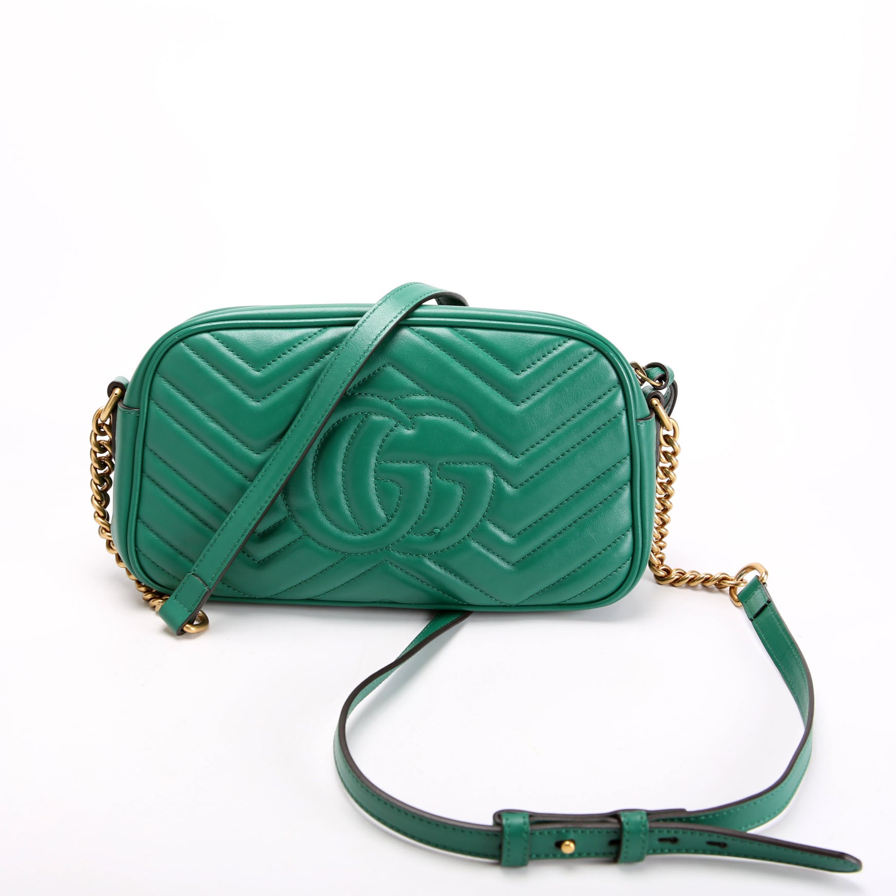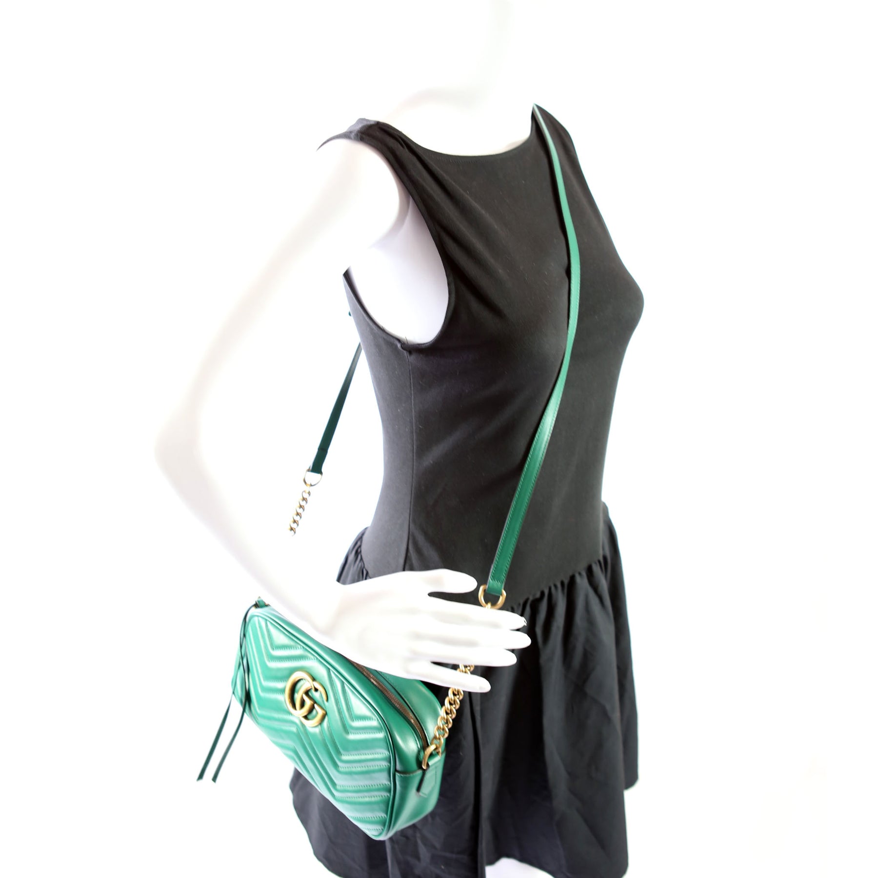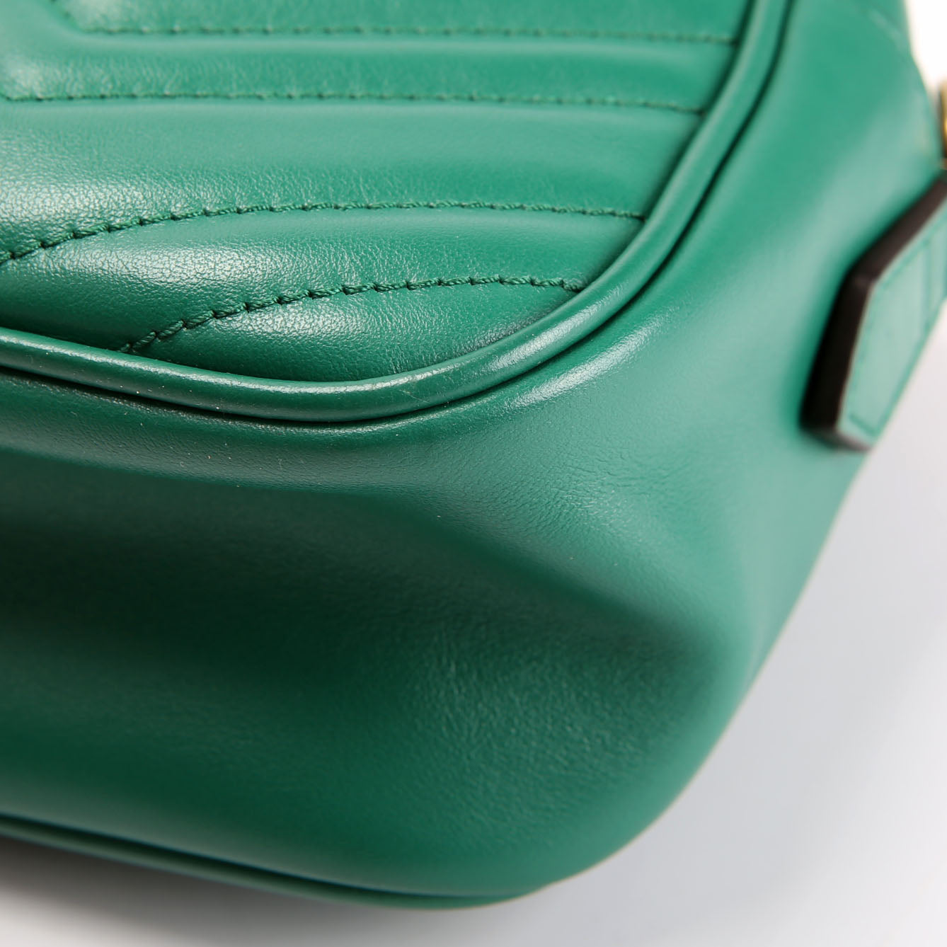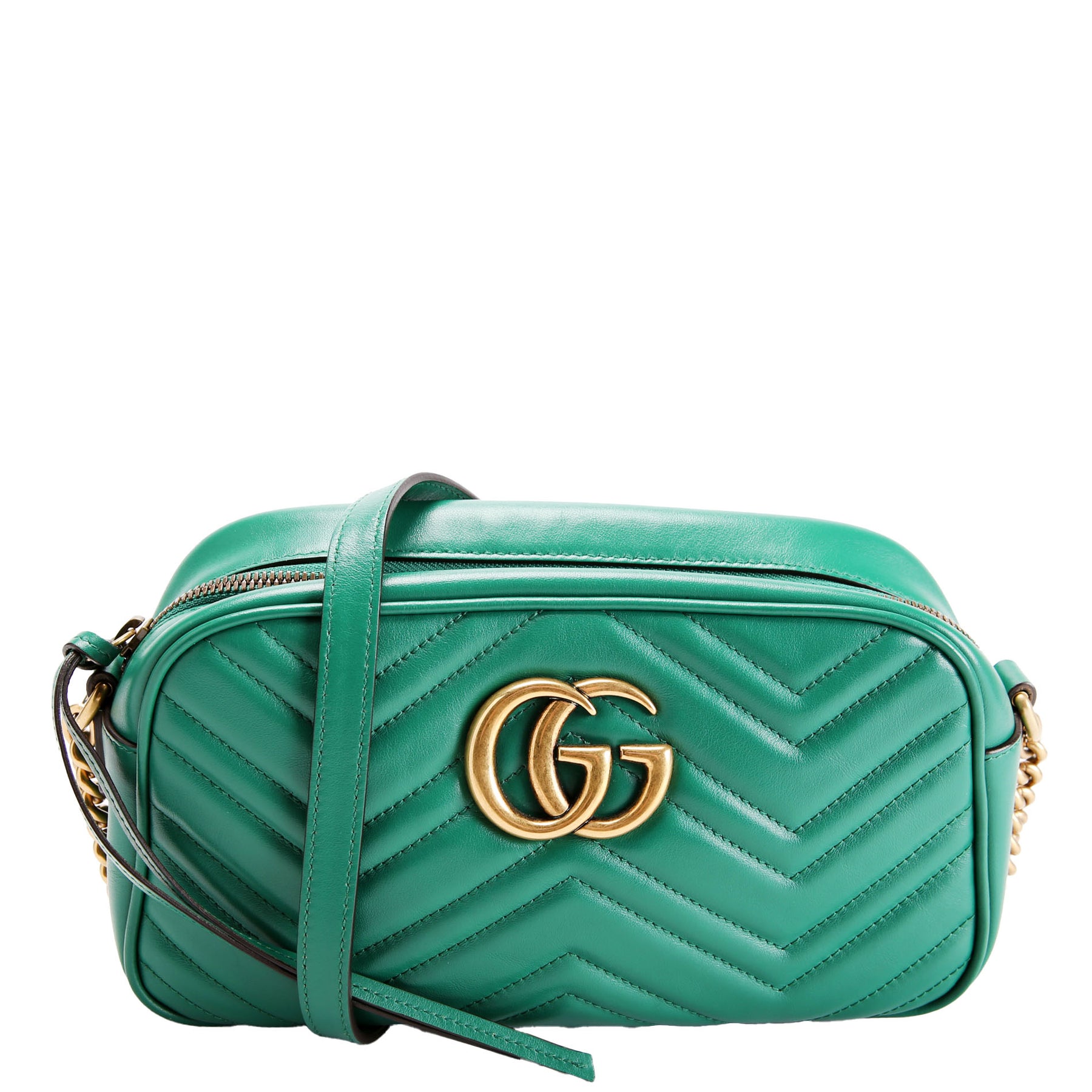 This pre-owned Gucci Small Leather Camera Bag is guaranteed 100% authentic. The exterior is in the classic Gucci Marmont Leather.