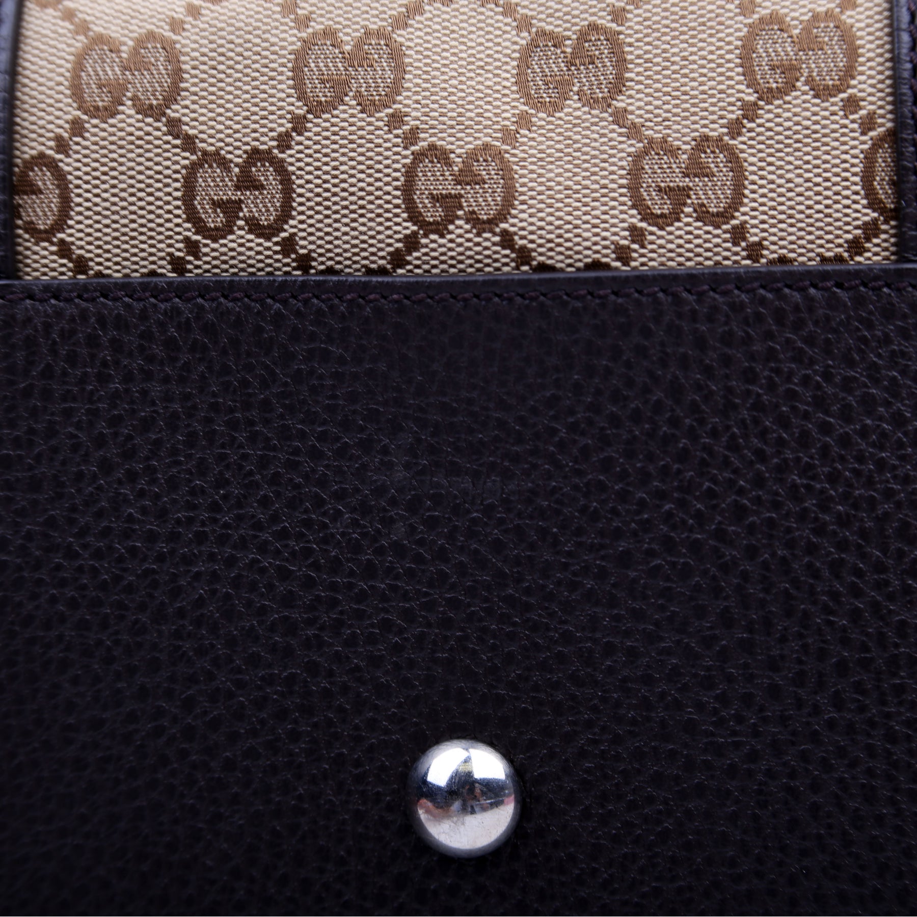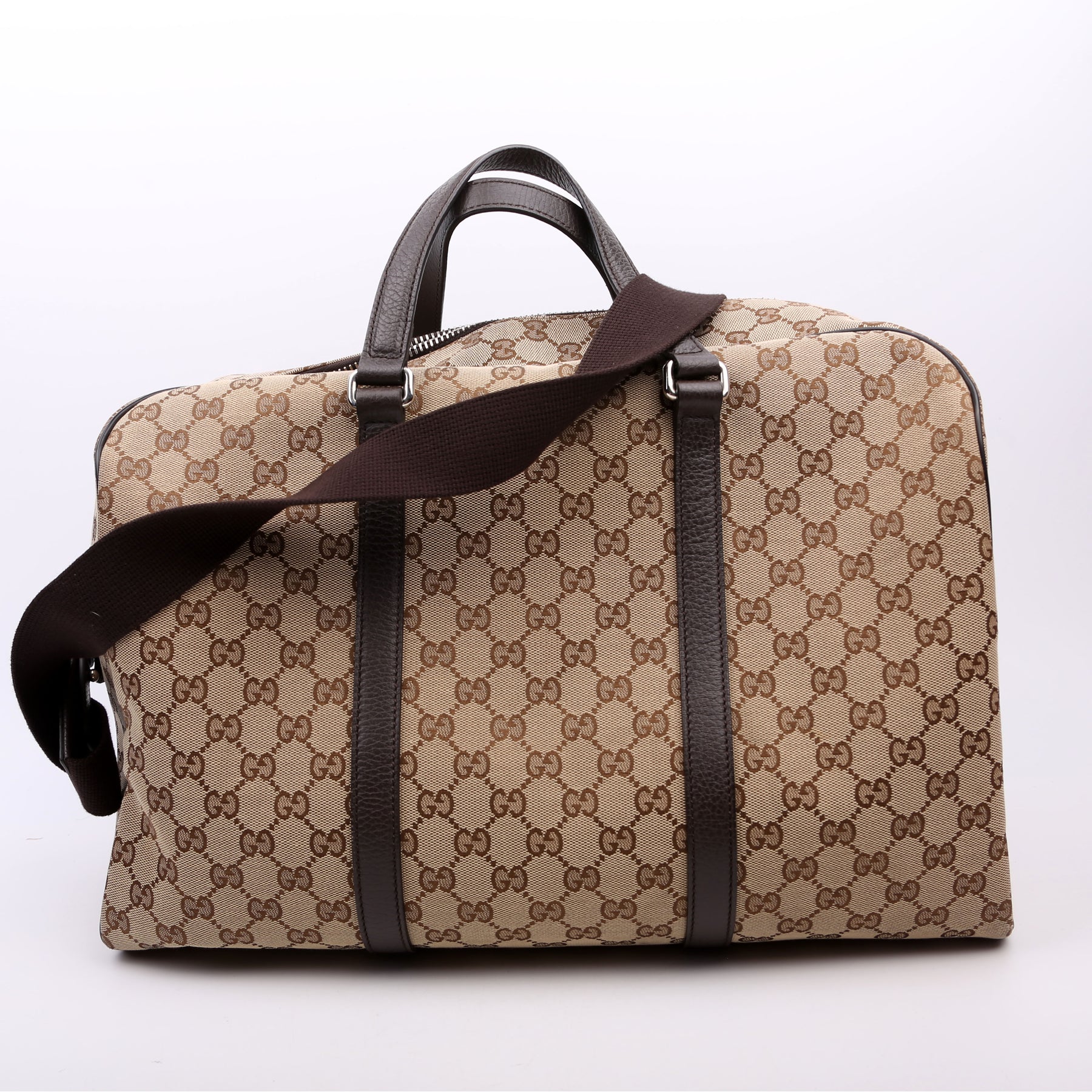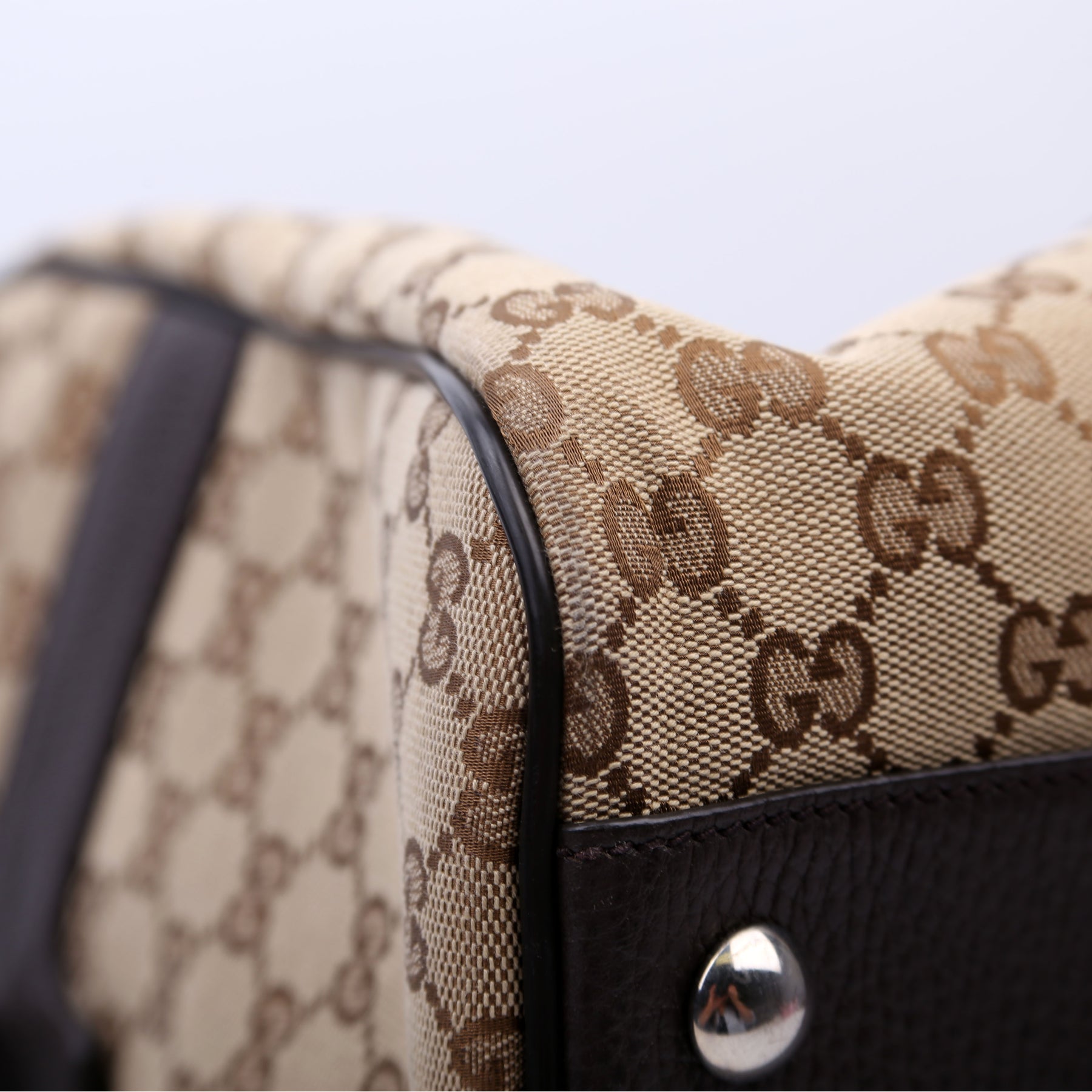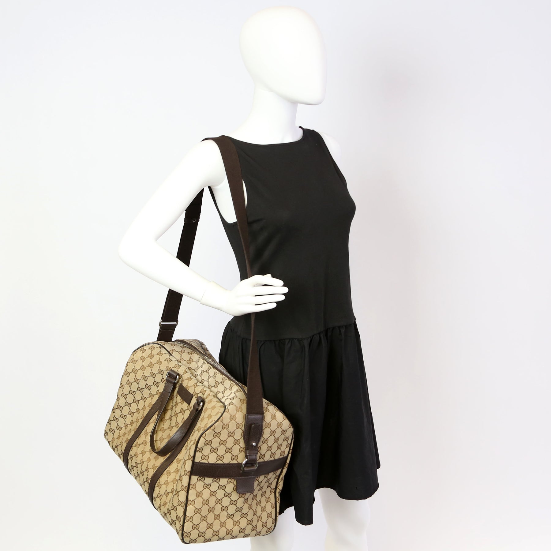 This pre-owned Gucci GG Canvas Boston Duffle Bag is guaranteed 100% authentic. The exterior is in the classic Gucci GG canvas.