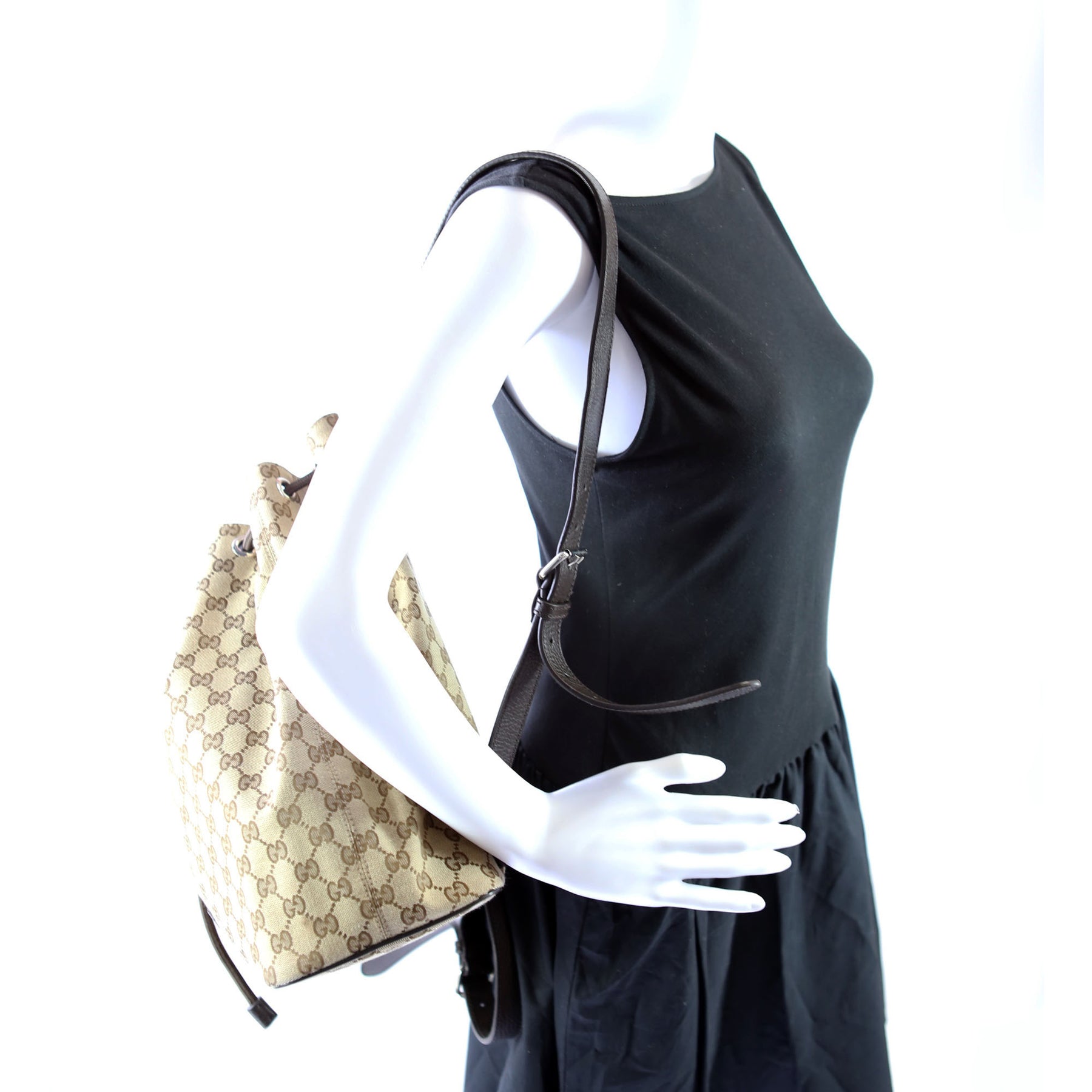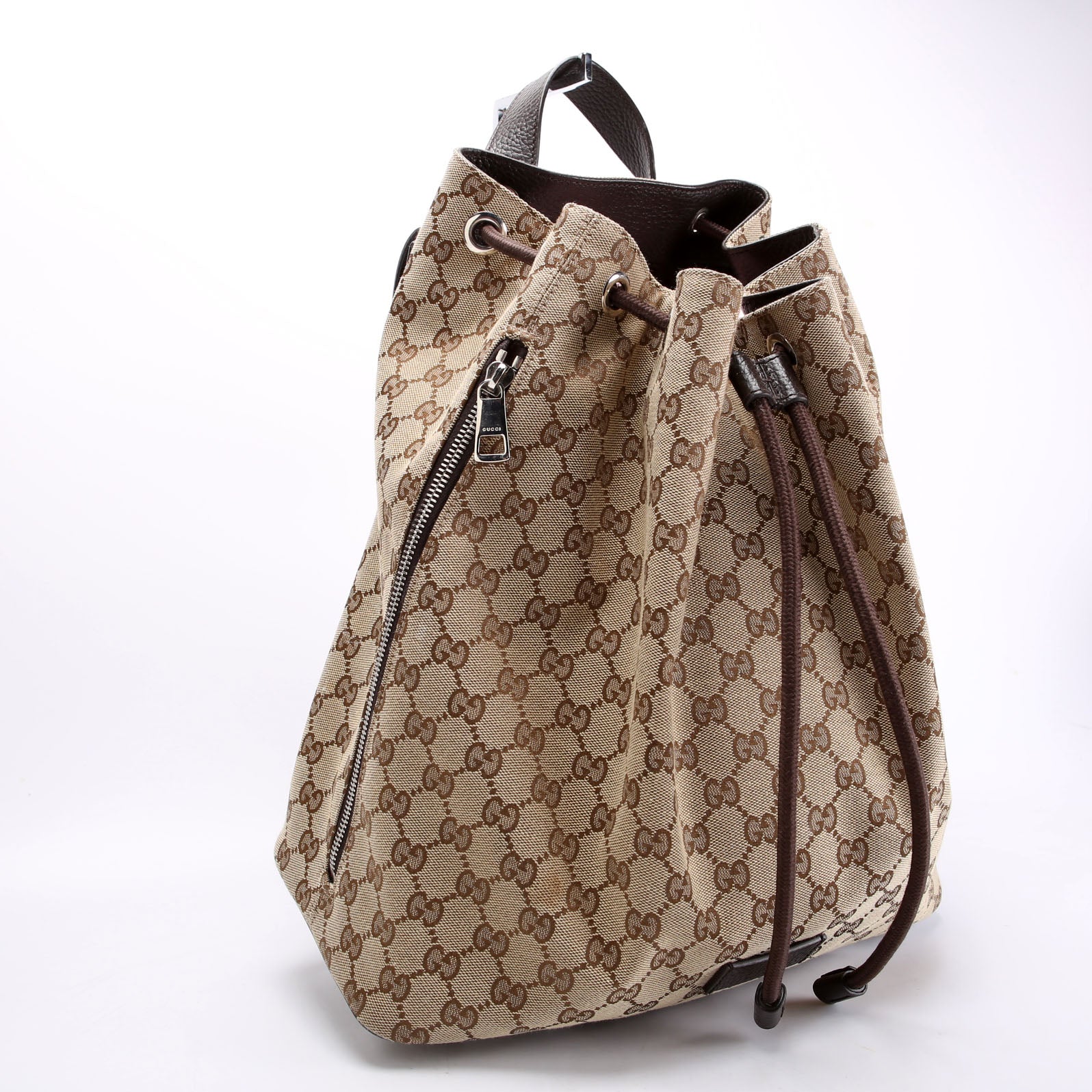 This pre-owned Gucci Drawstring Backpack is guaranteed 100% authentic. The exterior is in the classic Gucci Canvas.