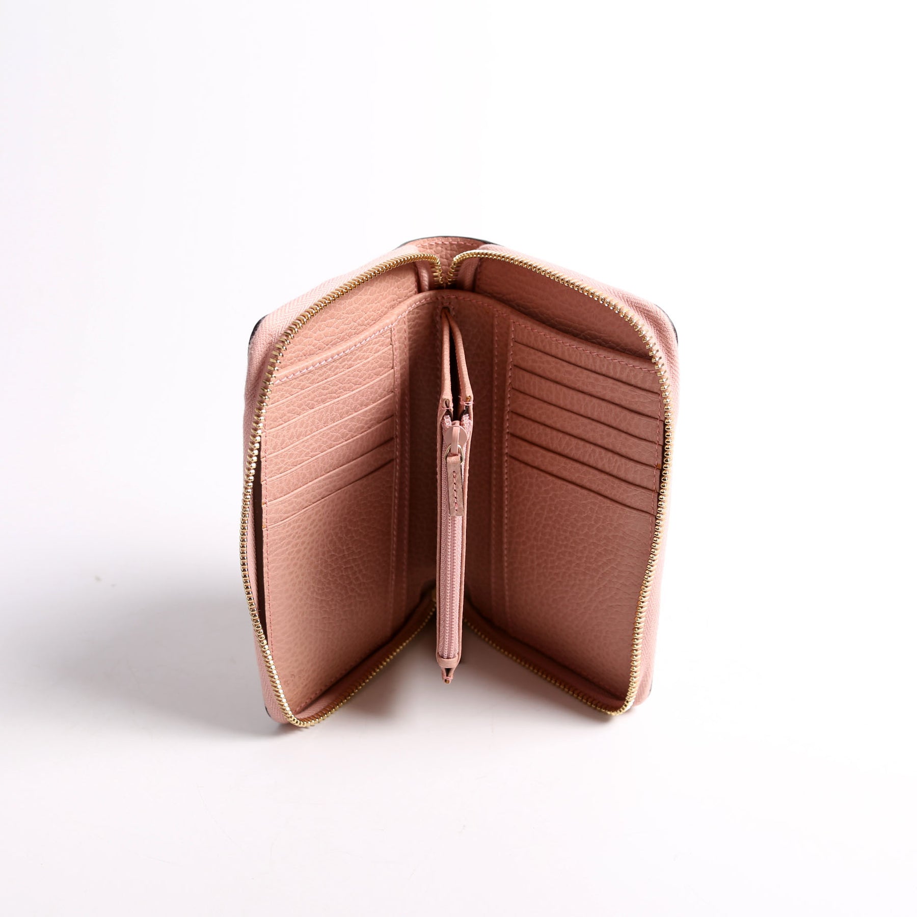 Interior: The interior is clean and free of rips or tears. The interior features one zip closure coin pouch, twelve card slots, and one bill slot.
