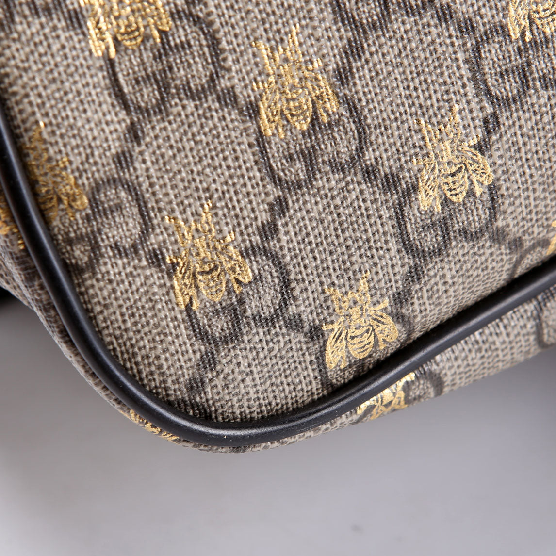 This pre-owned Gucci Bee Small Tote is guaranteed 100% authentic. The exterior is in the classic Gucci Coated Canvas Supreme.