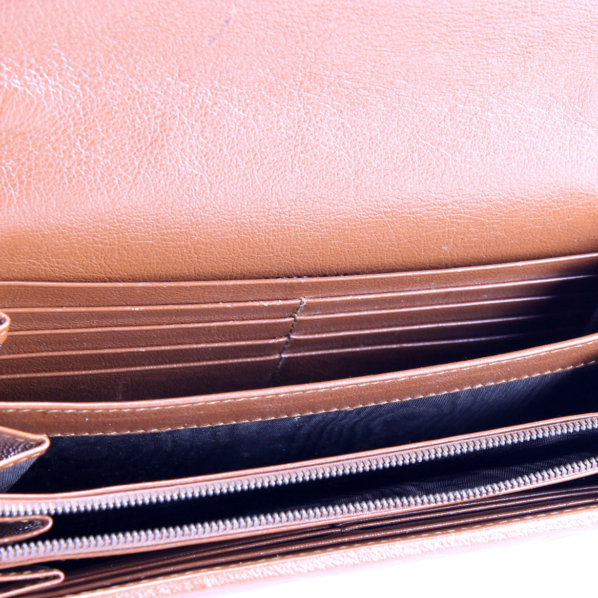 Interior: The interior shows light wear and scratches throughout. There is a pen mark under the flap. It features three open sections, sixteen card slots, two open pockets, and one zip closure pocket.